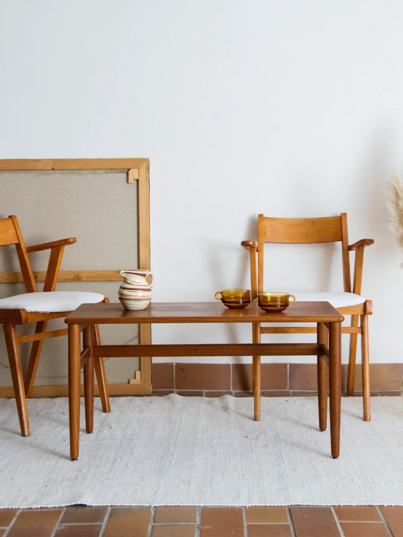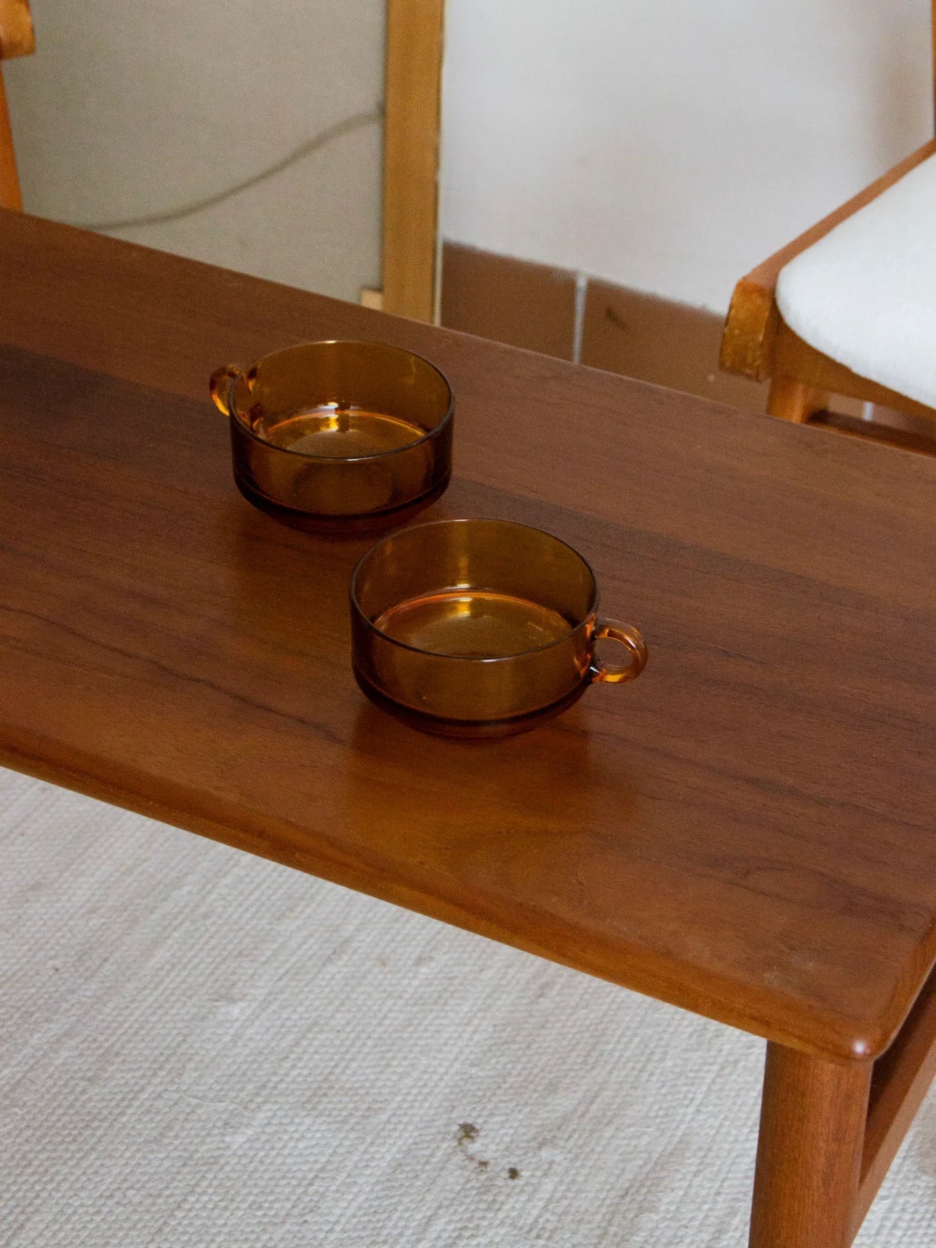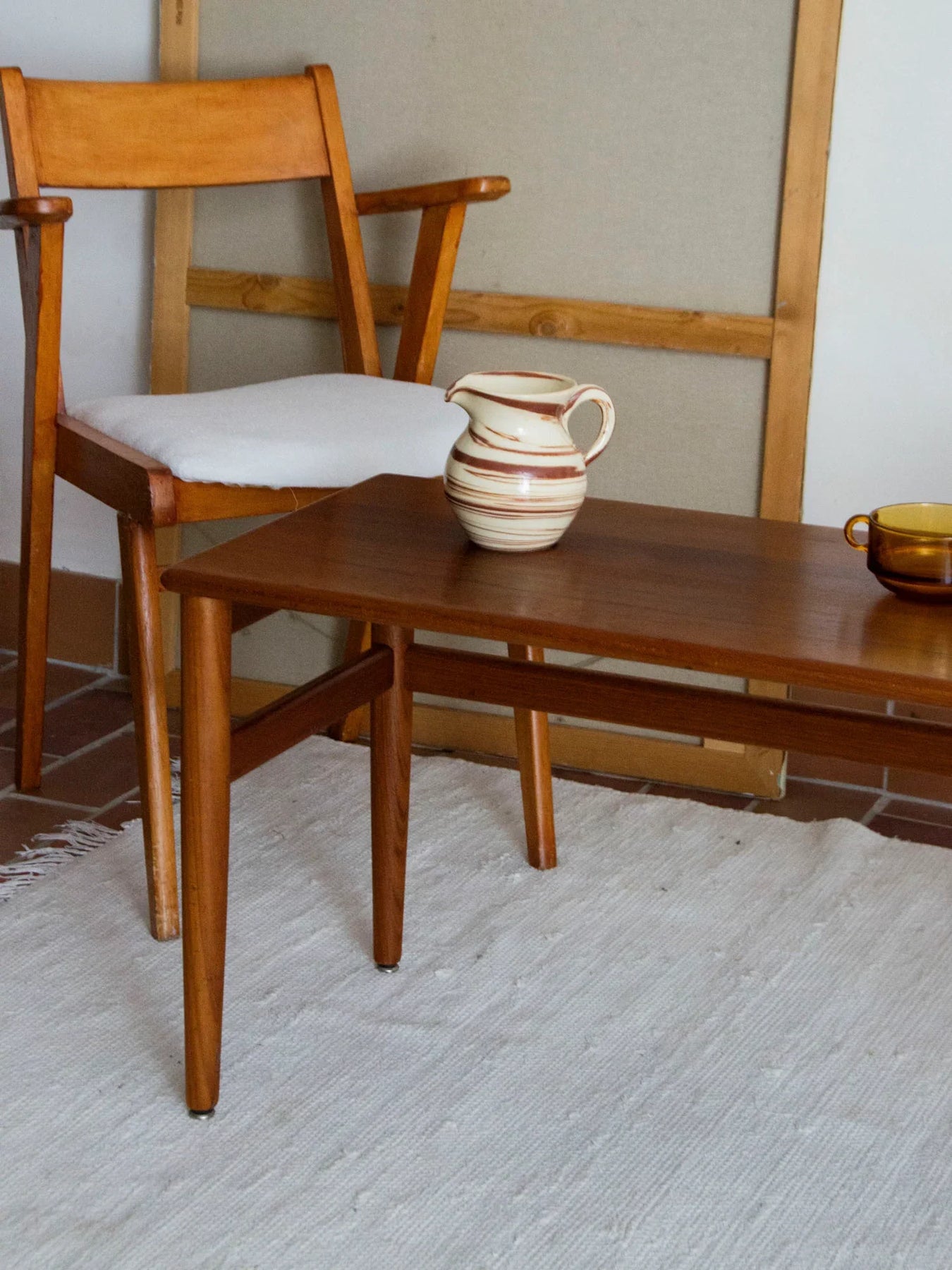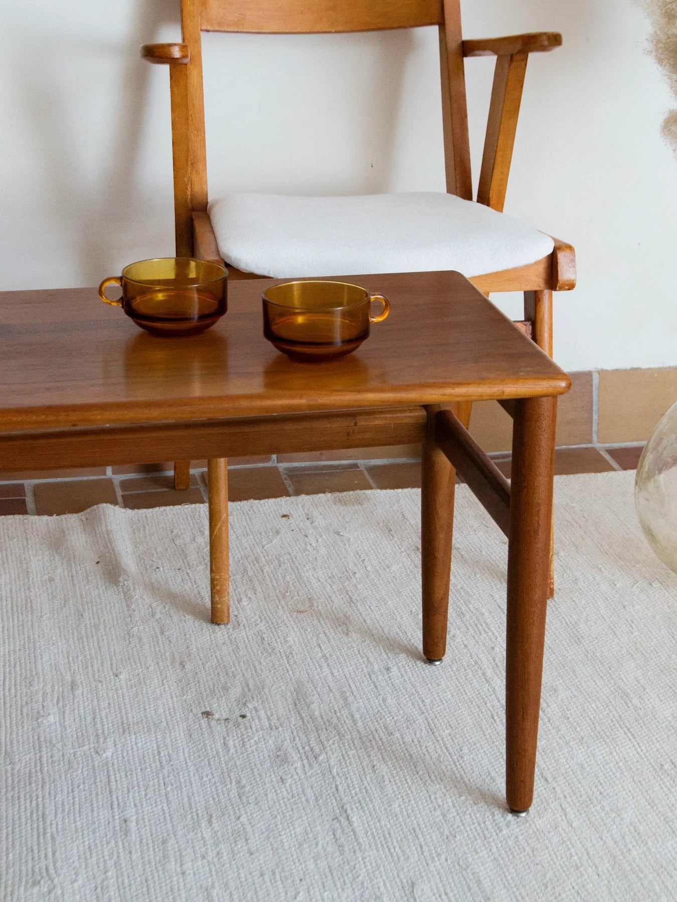 Découvrez cette table basse en teck massif, emblématique du design danois des années 60. Son dessin épuré et ses proportions équilibrées évoquent les chefs-d'œuvre de Hvidt & Mølgaard ou Grete Jalk, alliant chaleur du bois et finesse des formes. Cette pièce, à la fois sobre et expressive, s'intègre harmonieusement dans un salon d’inspiration nordique ou se marie parfaitement avec des éléments contemporains. En très bon état général, elle présente une patine homogène, gage de son authenticité et de son charme intemporel.