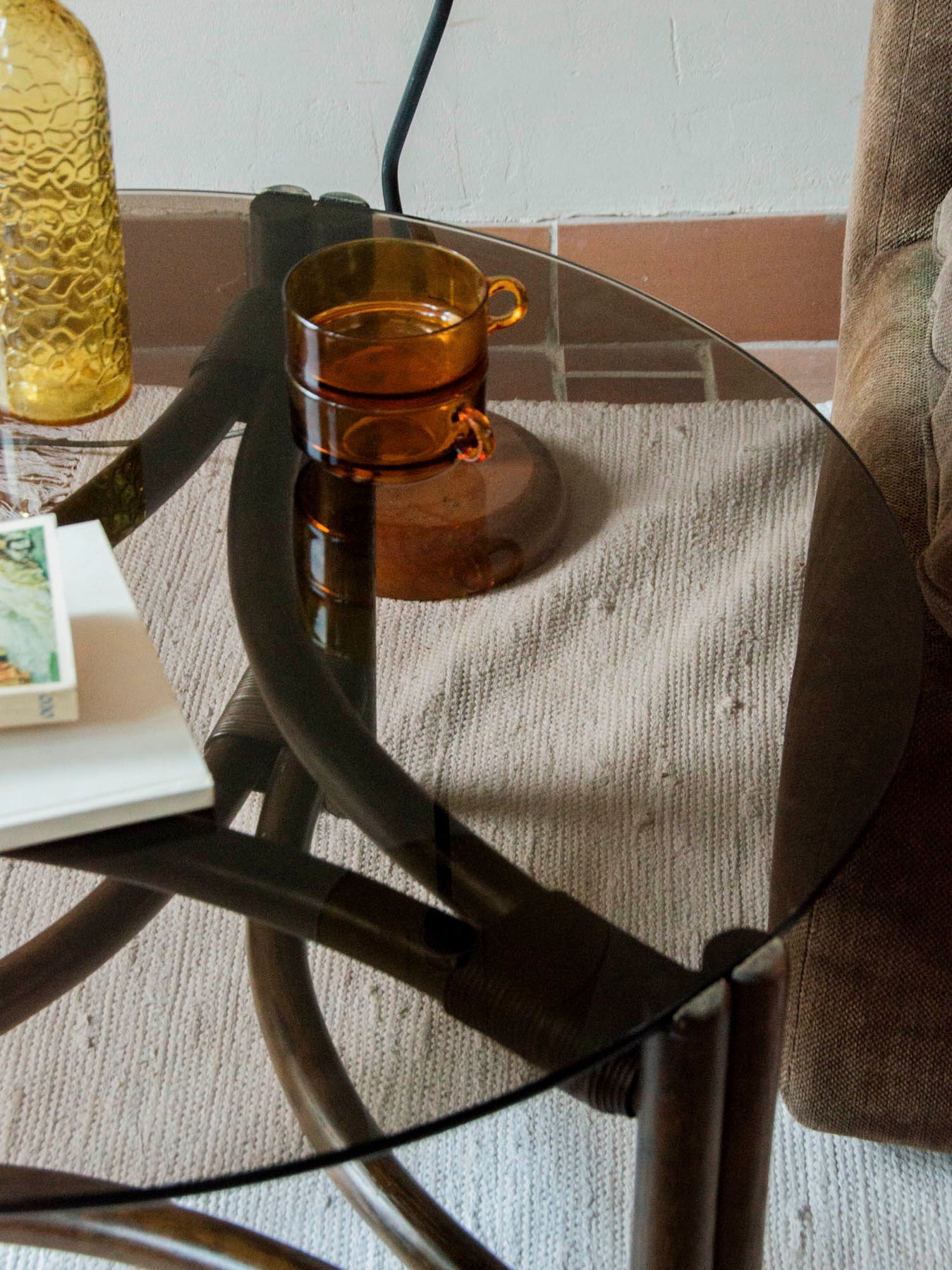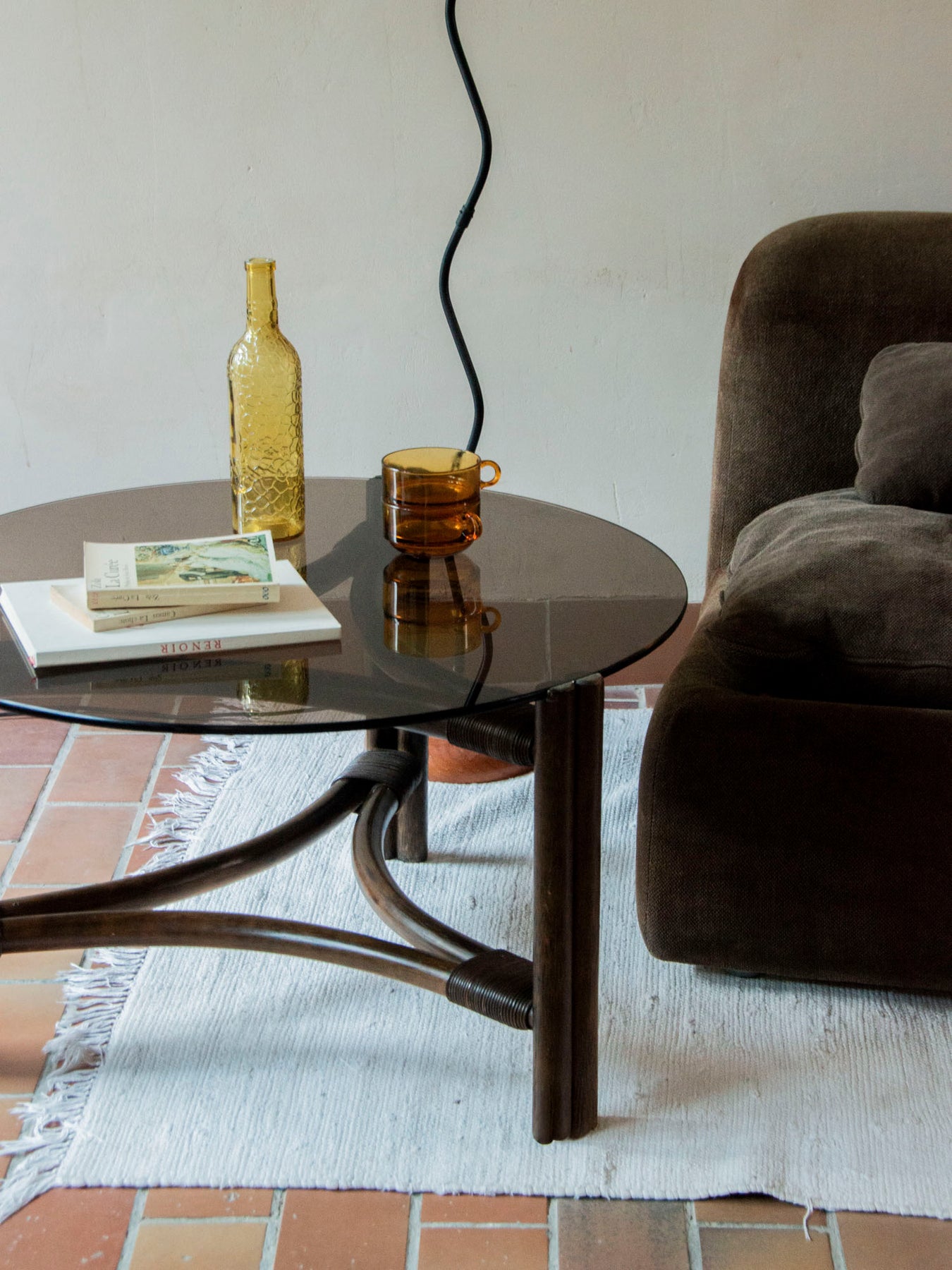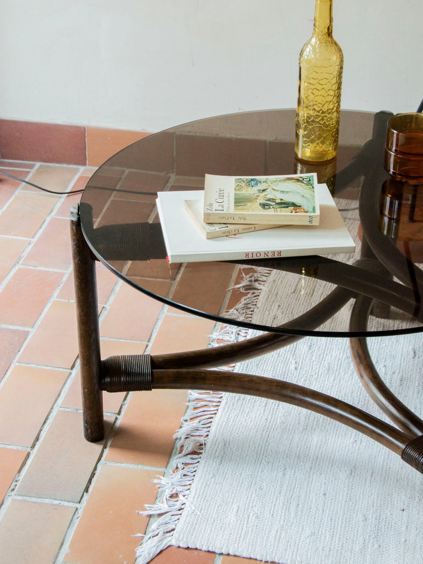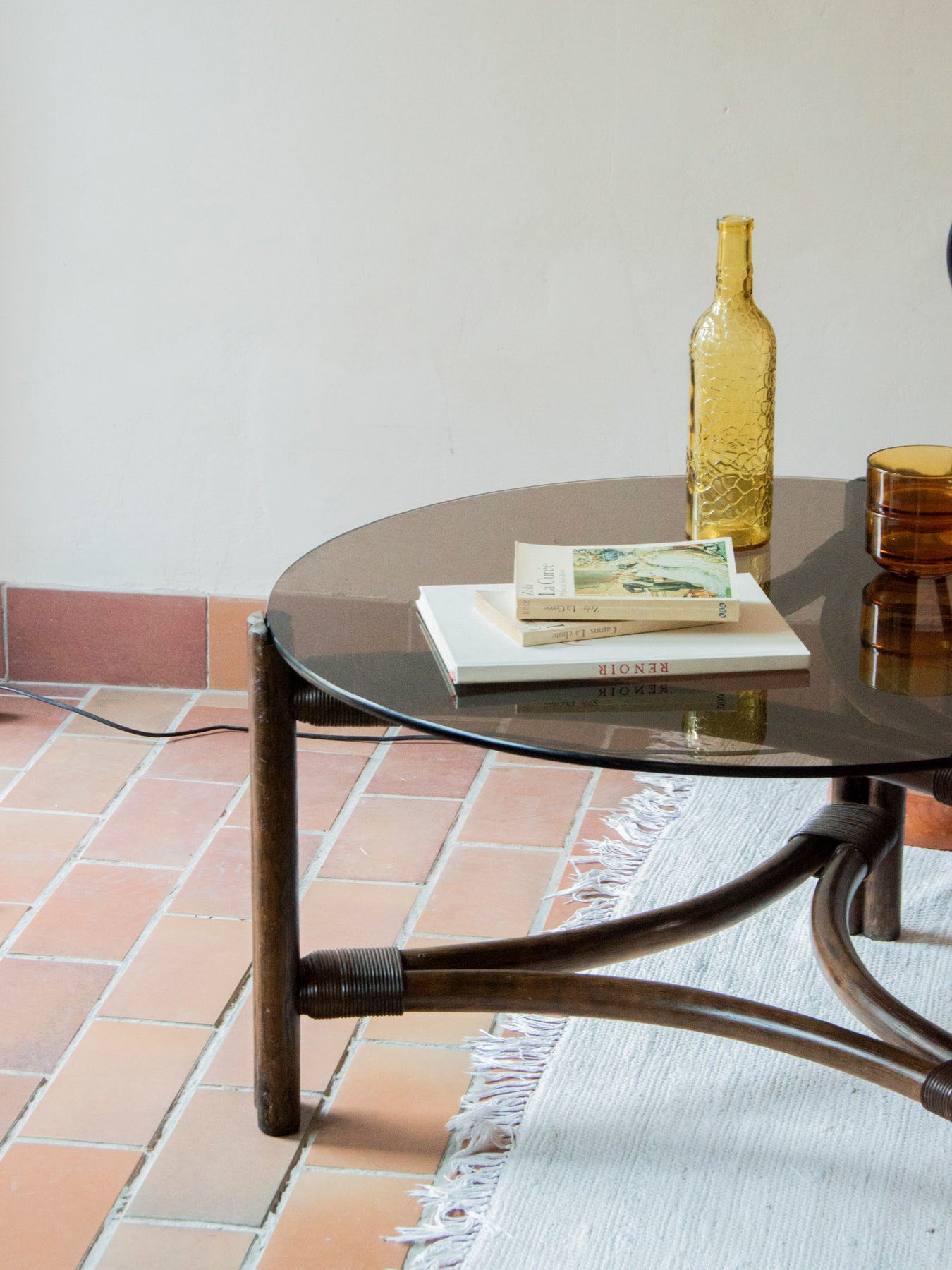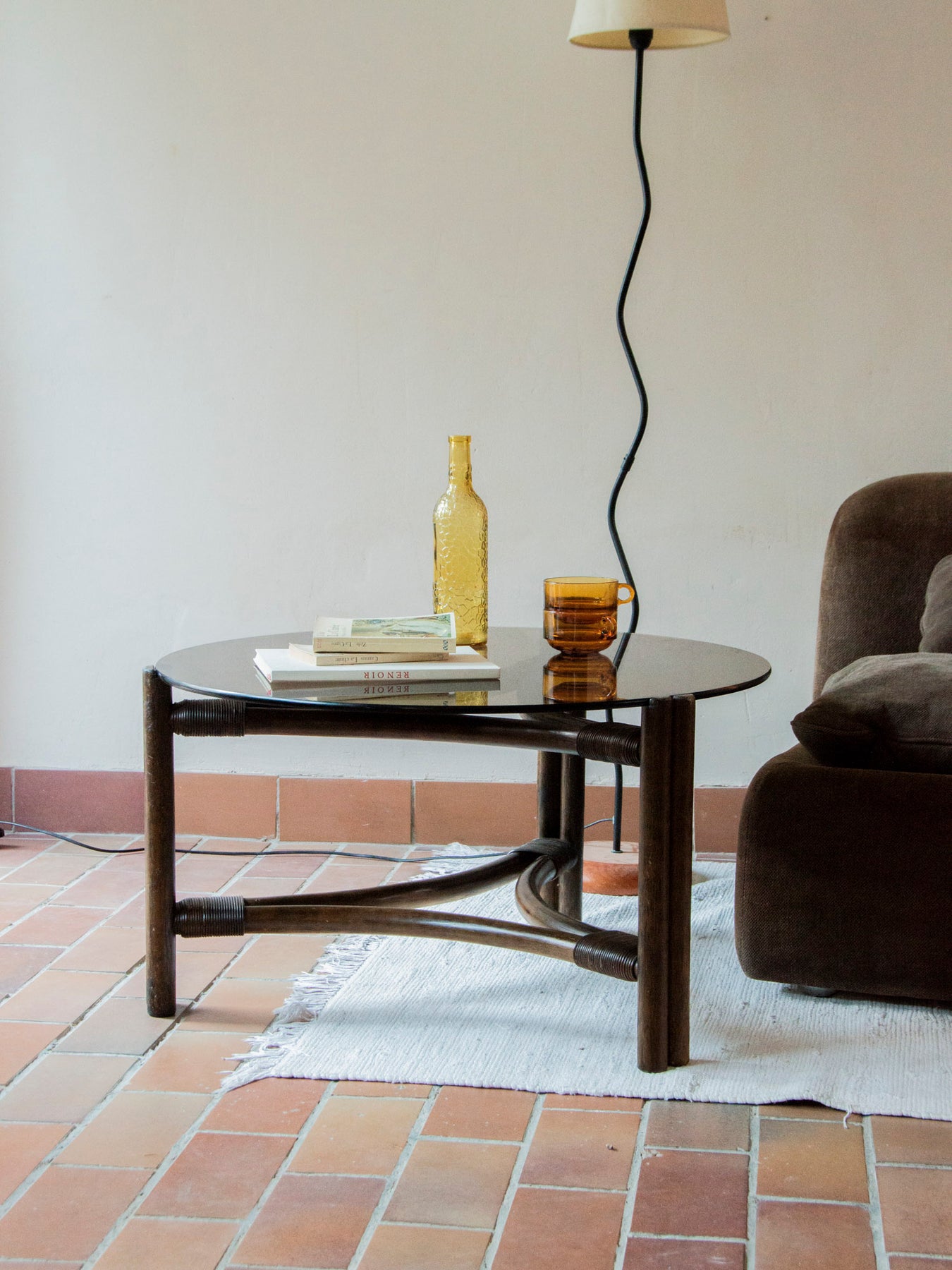 Découvrez cette table basse vintage au piètement sculptural en rotin cintré et plateau en verre fumé, qui incarne parfaitement l'esthétique seventies. Son design organique mêle légèreté et transparence, évoquant les créations emblématiques de l'époque. Idéale pour un intérieur vintage ou contemporain, cette pièce décorative et fonctionnelle apporte une touche chaleureuse et élégante à votre salon. Le rotin affiche une belle patine, témoignant de son histoire, tandis que le plateau en verre est en excellent état. Une table basse pleine de caractère qui saura séduire les amateurs de style unique.