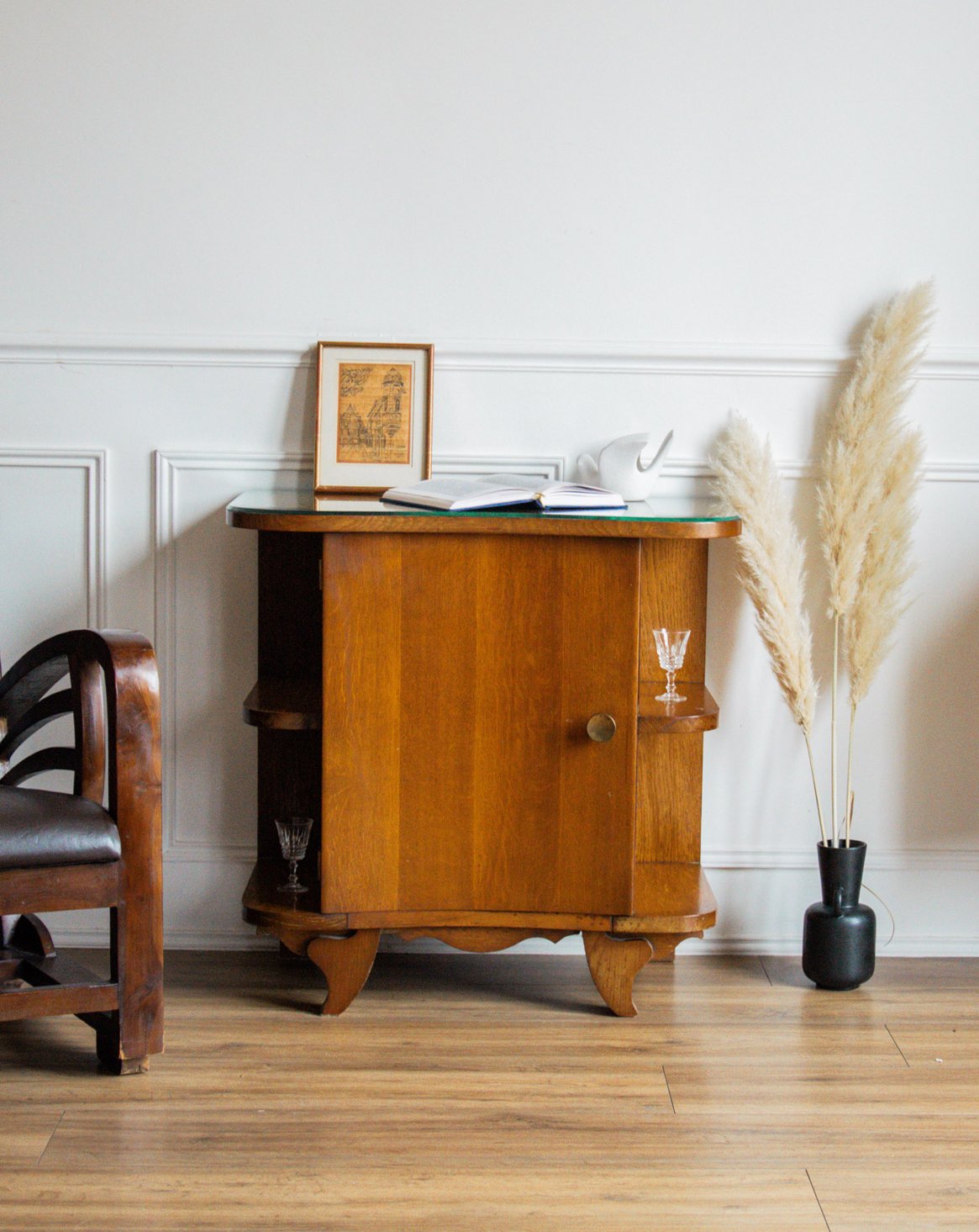 Découvrez ce chevet grand format en bois de chêne, alliant fonctionnalité et élégance. Doté d'un plateau en verre arrondi, il se distingue par ses pieds courbés et ses étagères intégrées de chaque côté, offrant un espace de rangement supplémentaire. Bien que des petits éclats soient présents sur les plateaux de verre, ainsi que quelques traces du temps, ce meuble apportera une touche chic et chaleureuse à votre chambre. Un choix idéal pour ceux qui recherchent à la fois style et praticité. Vendu à l'unité, 2 exemplaires disponibles.