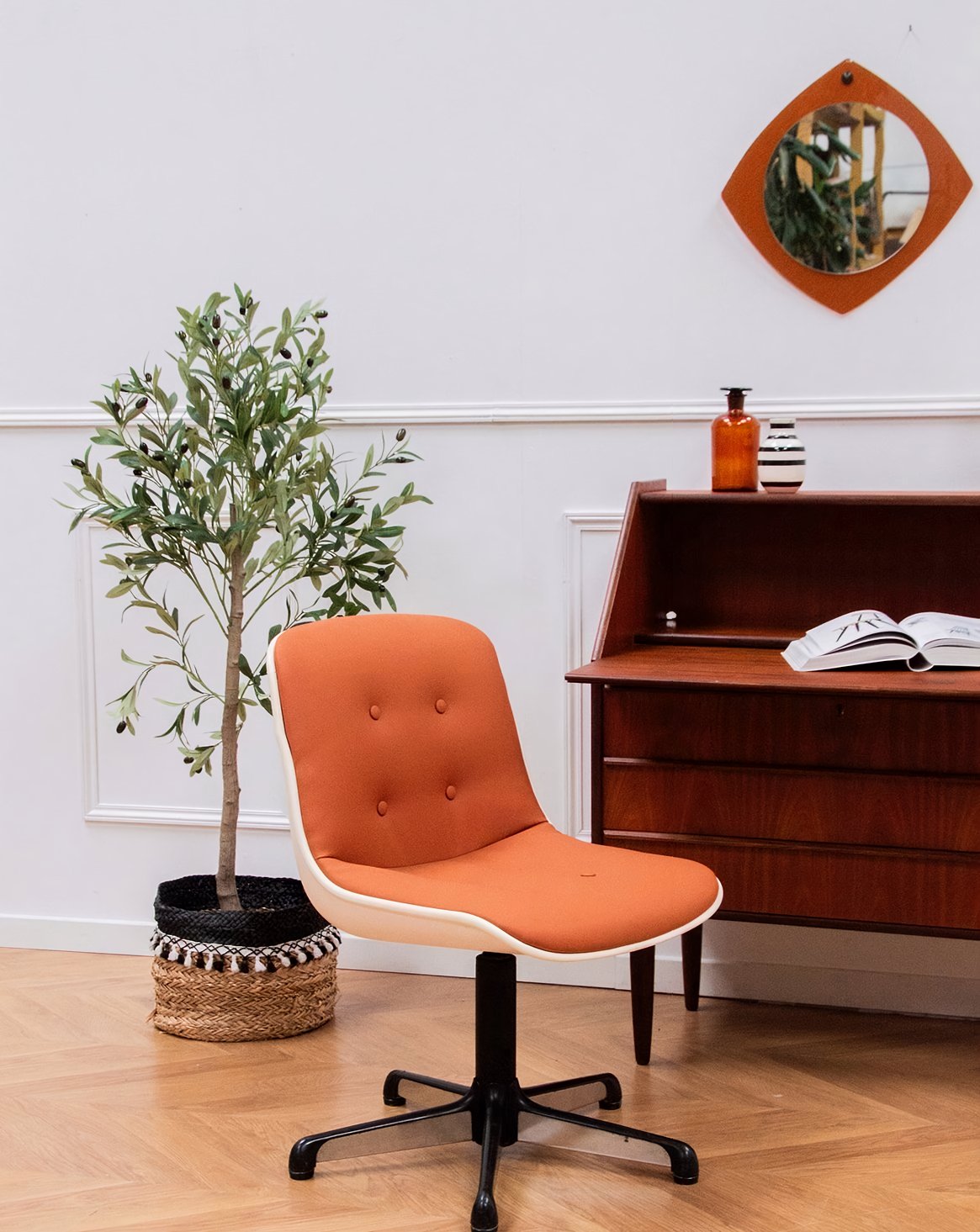 Découvrez la chaise de bureau emblématique éditée par la marque Comforto dans les années 60, qui allie parfaitement esthétique vintage et confort moderne. Retapissée avec soin par l'atelier de Ricardo en skai cognac, elle incarne un style raffiné tout en offrant une assise agréable pour vos longues heures de travail. Son design pivotant et sa coque en plastique moulé rappellent la célèbre Exécutive chair de Charles Pollock, faisant de cette pièce un incontournable pour tout amateur de mobilier rétro. Fabriquée en France, cette chaise est une véritable ode au style des années 60. La hauteur d'assise est réglable.