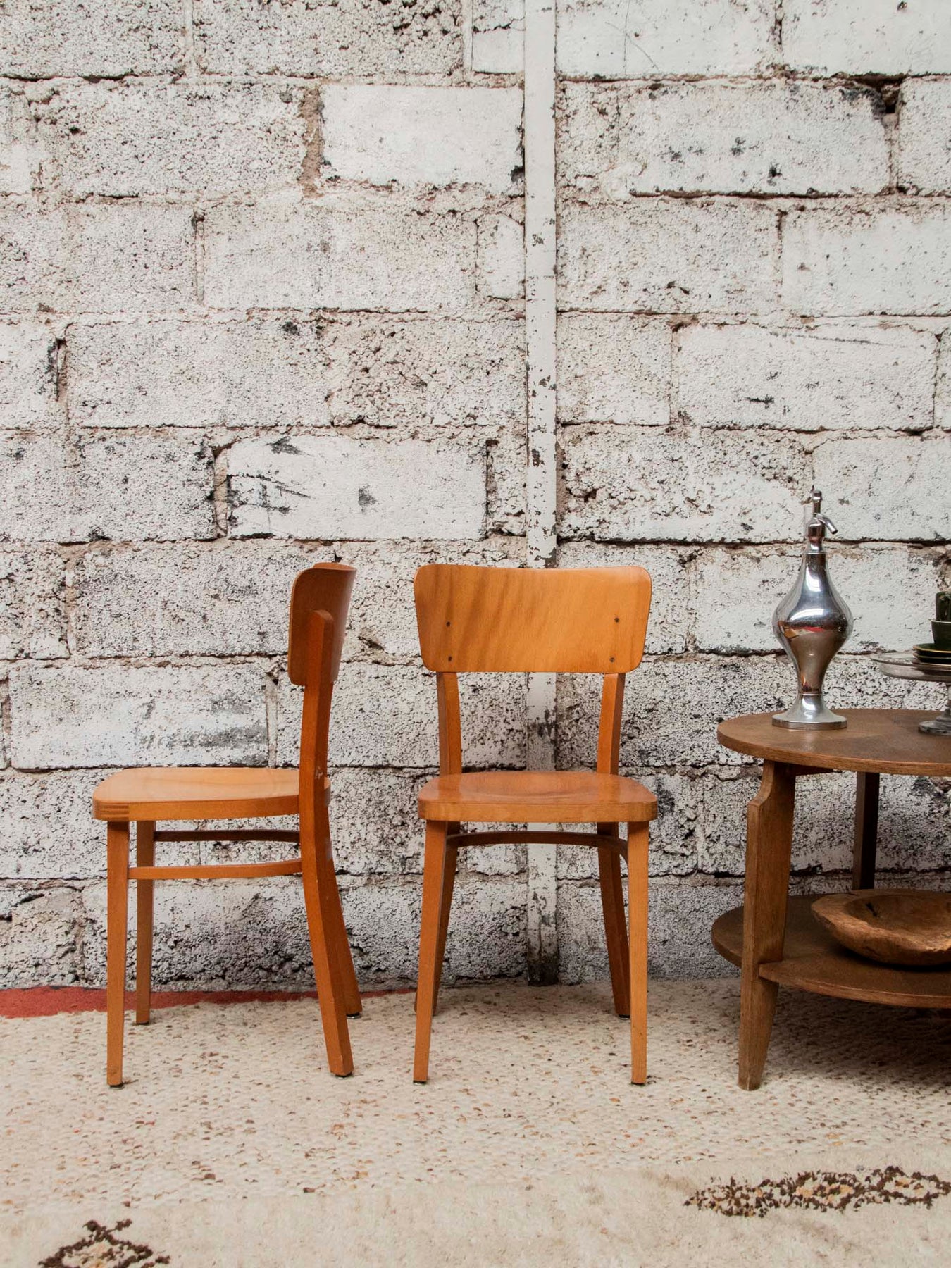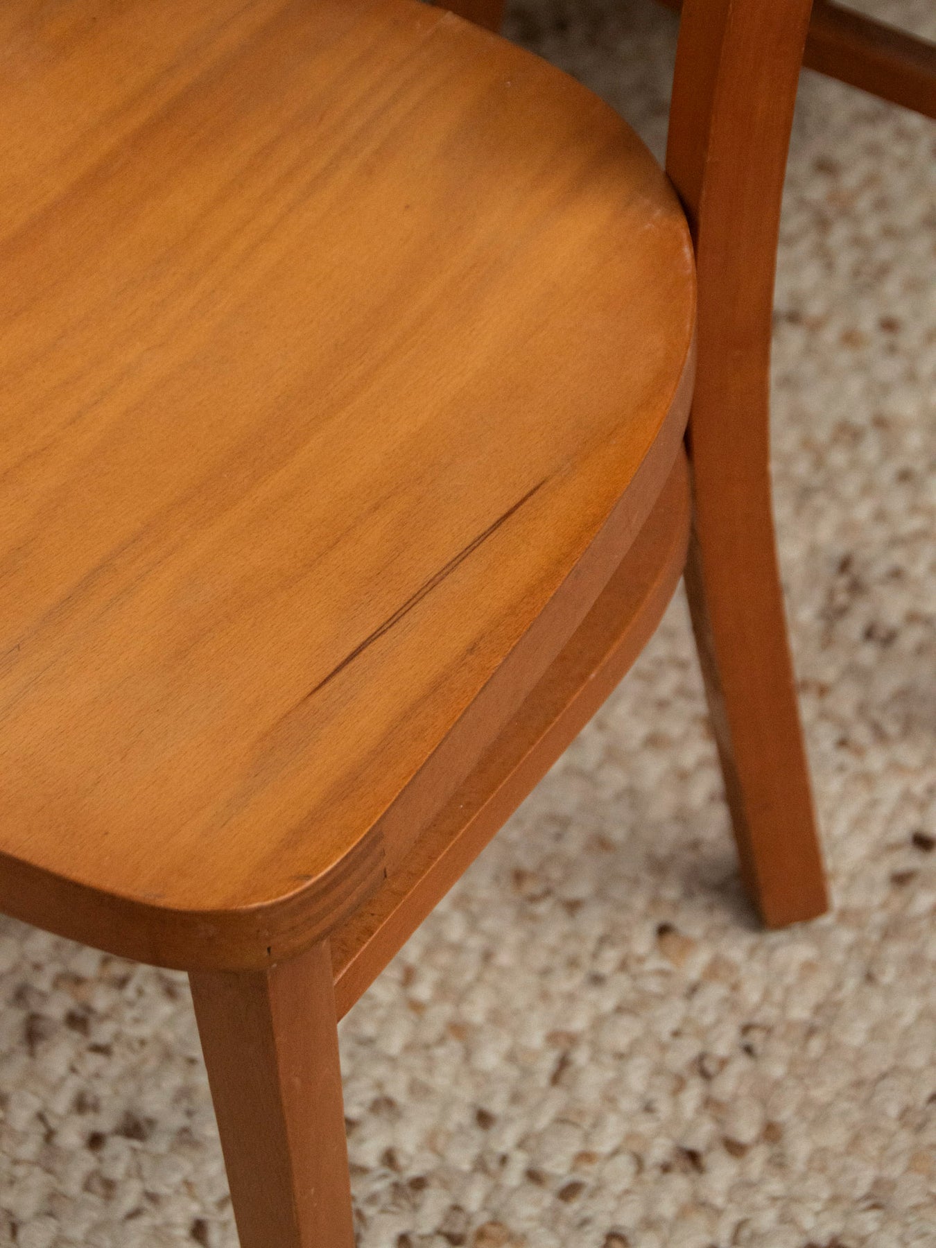 Découvrez cette paire de chaises Thonet en bois clair, emblématiques du design intemporel. Leur dossier incurvé, agrémenté de quatre clous décoratifs, apporte une touche d'élégance à tout intérieur. Bien que quelques usures soient visibles, ces chaises conservent tout leur caractère et leur charme vintage, parfaites pour un espace chaleureux et accueillant. Idéales pour compléter un salon ou une salle à manger, elles allient esthétique et confort avec brio.
