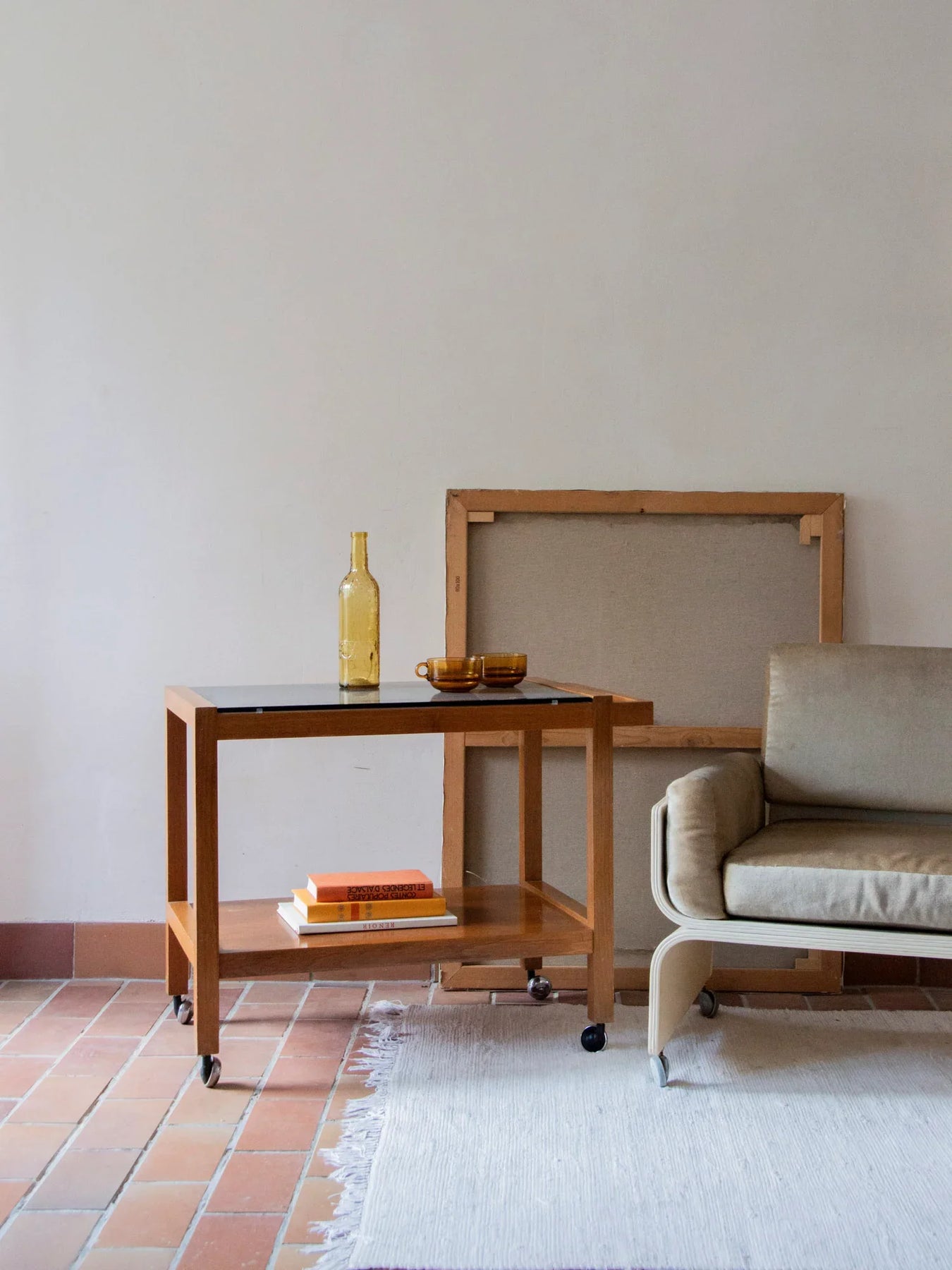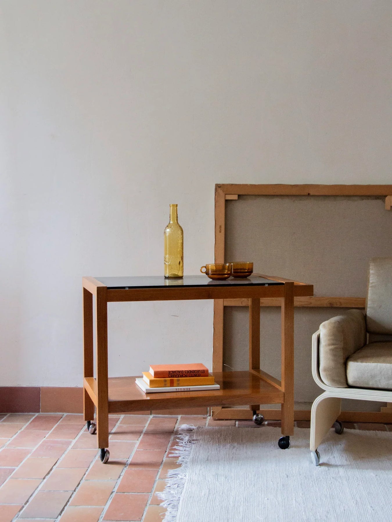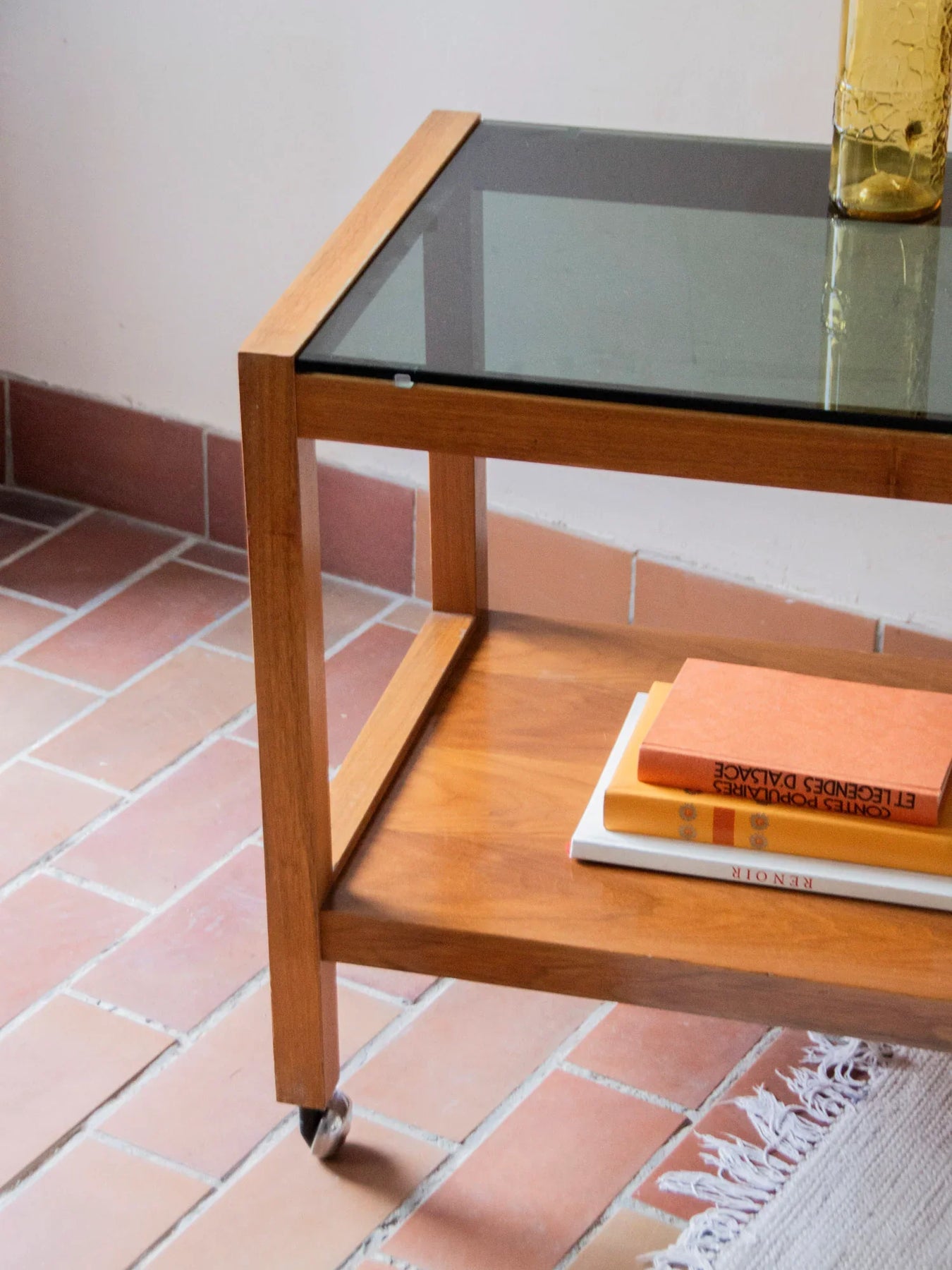 Ajoutez une touche d'élégance à votre intérieur avec cette desserte en hêtre au design raffiné. Son plateau en verre fumé apporte une note contemporaine, tandis que la poignée en bois assure une manipulation facile. Le plateau inférieur en bois offre un espace de rangement supplémentaire pour vos accessoires, et les petites roulettes permettent un déplacement aisée. Idéale pour servir vos invités ou comme éléments décoratif dans votre cuisine ou salon.