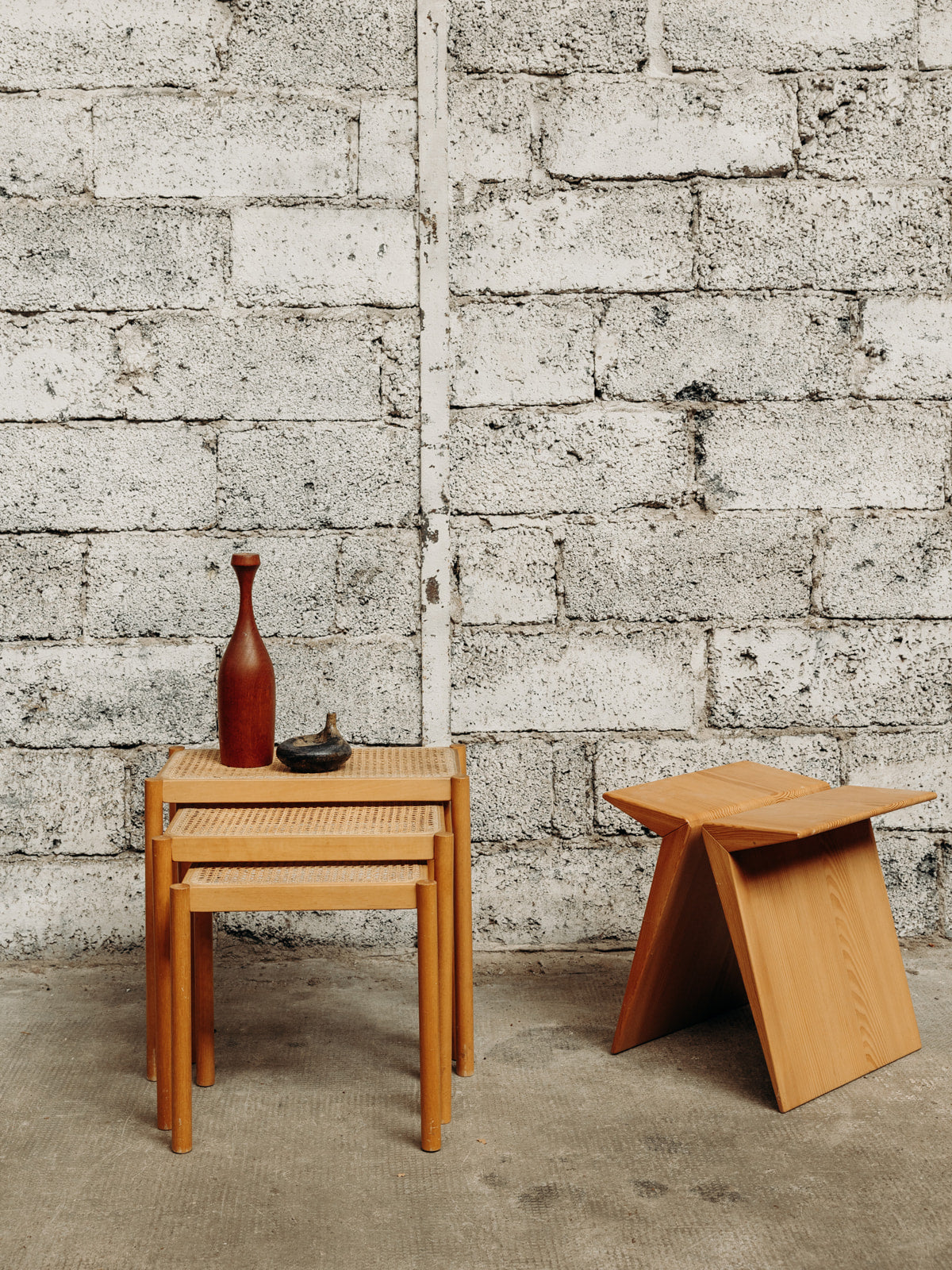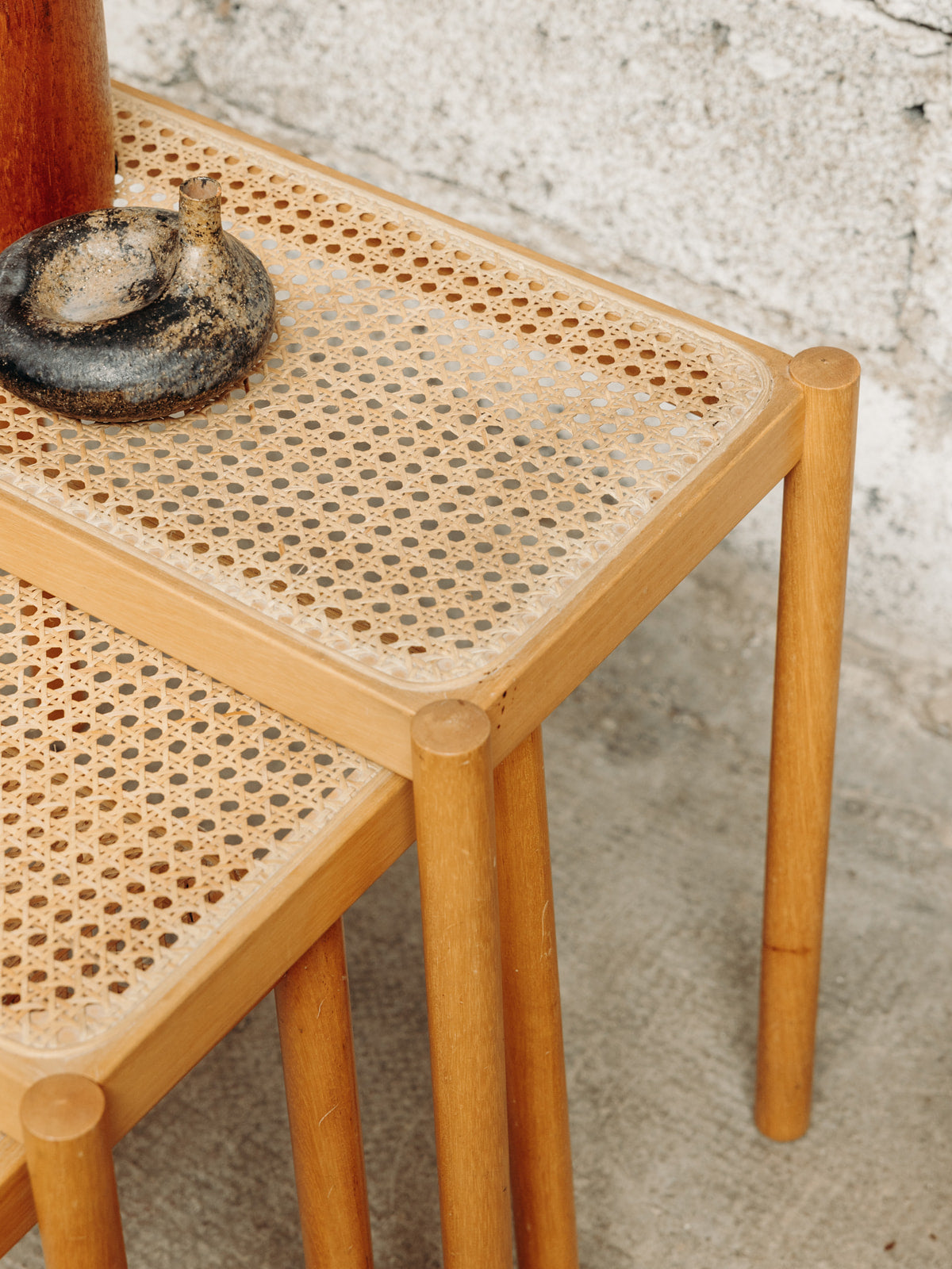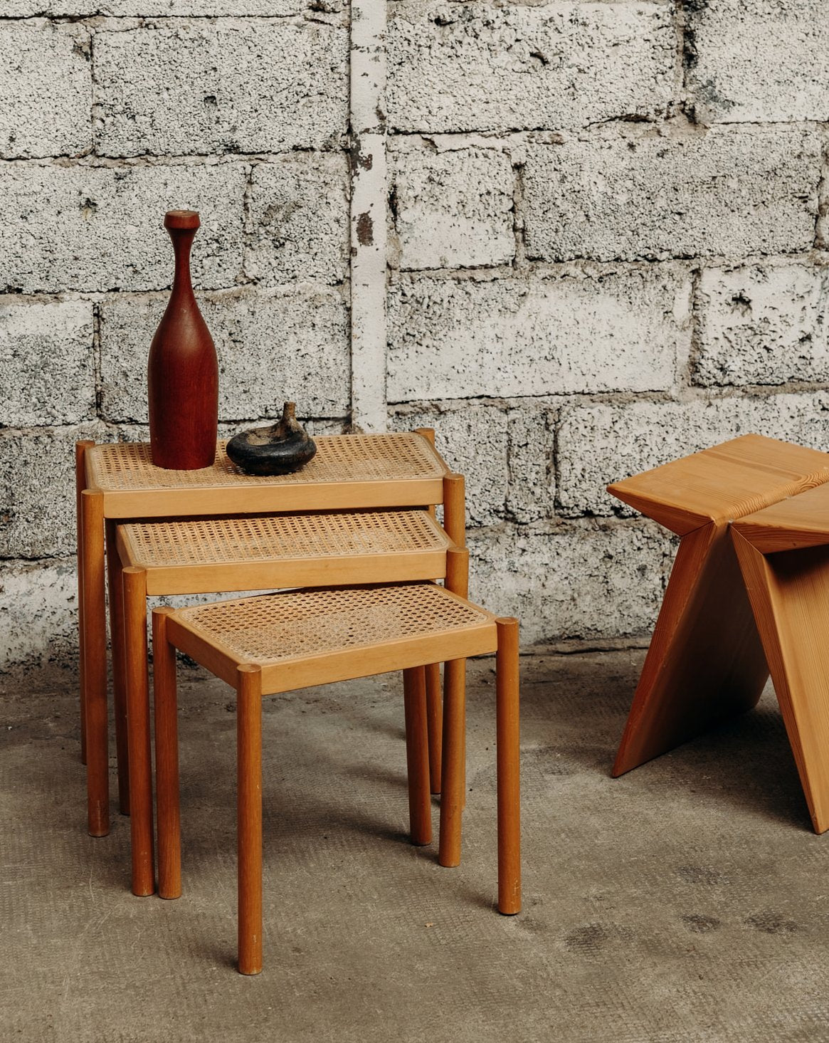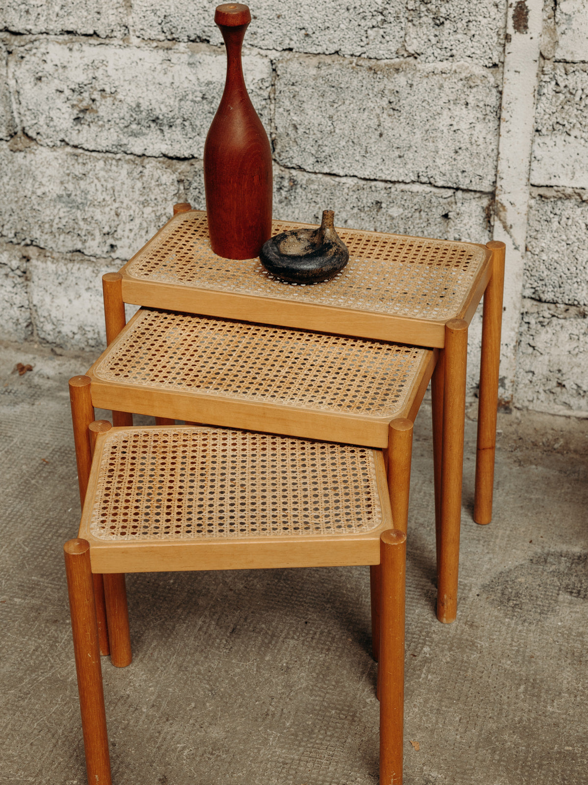 Découvrez ce lot de 3 tables gigognes au design élégant et contemporain. La structure en bois clair, accompagnée de pieds ronds, apporte légèreté et modernité, tandis que les plateaux en cannage clair ajoutent une touche naturelle et texturée. Quelques petites marques du temps sur le bois viennent sublimer leur caractère unique. Parfaites pour optimiser l’espace, elles allient praticité et style avec finesse. Un choix idéal pour une décoration à la fois tendance et chaleureuse.