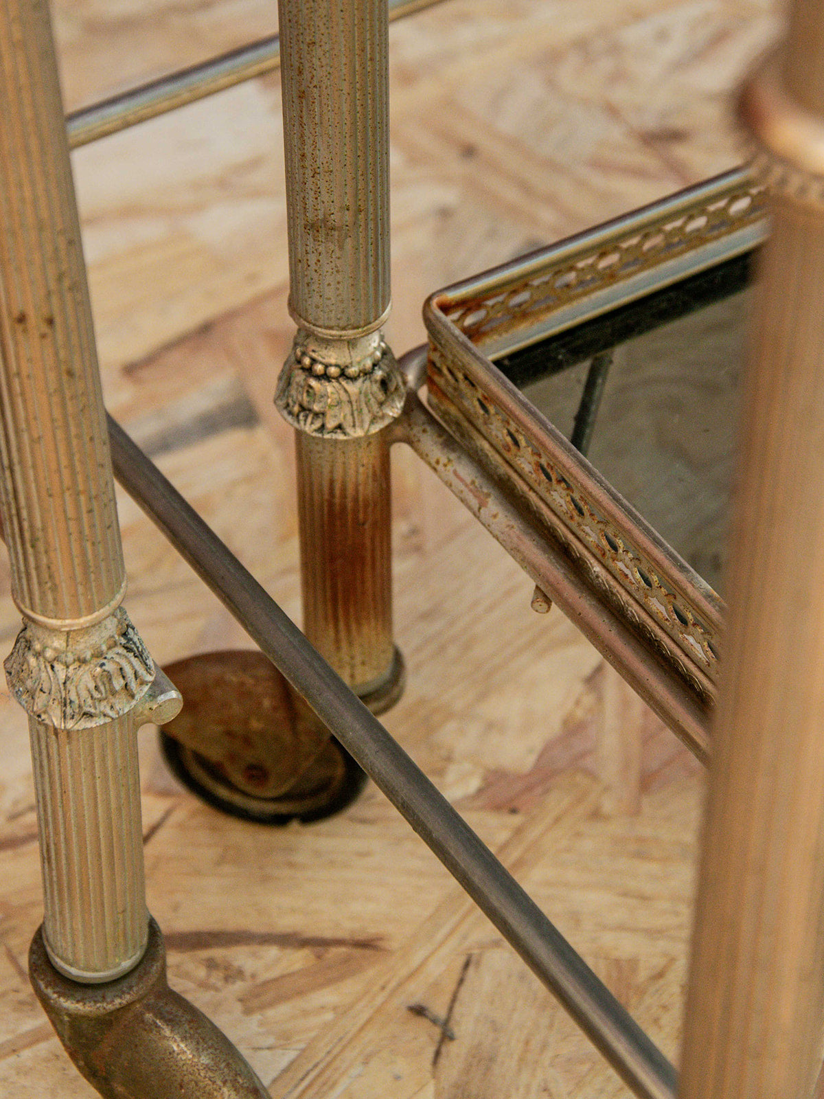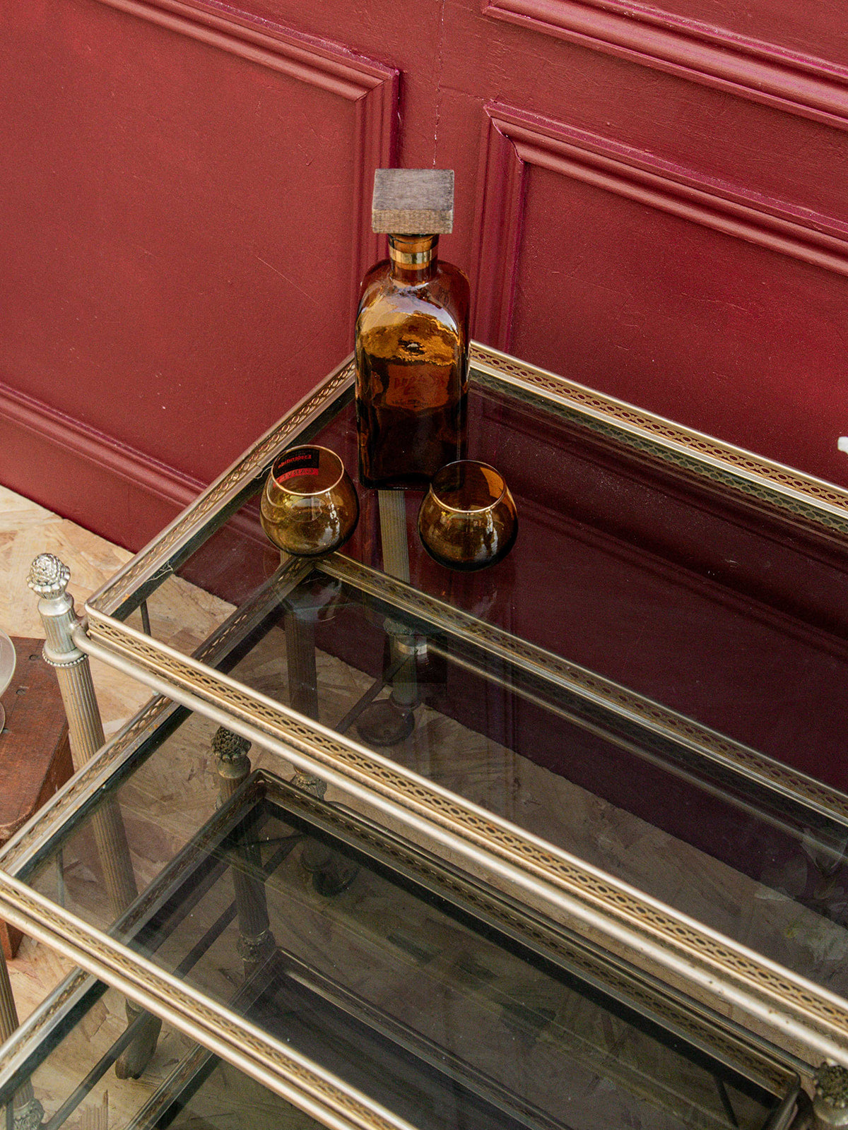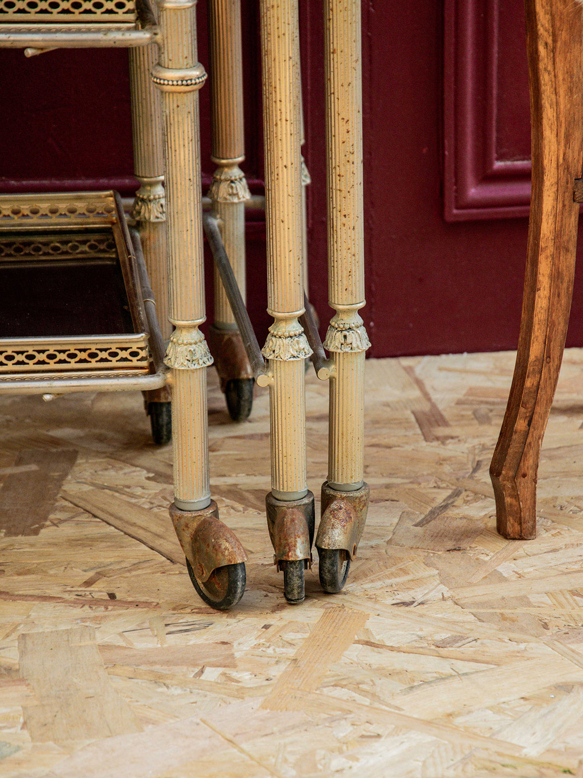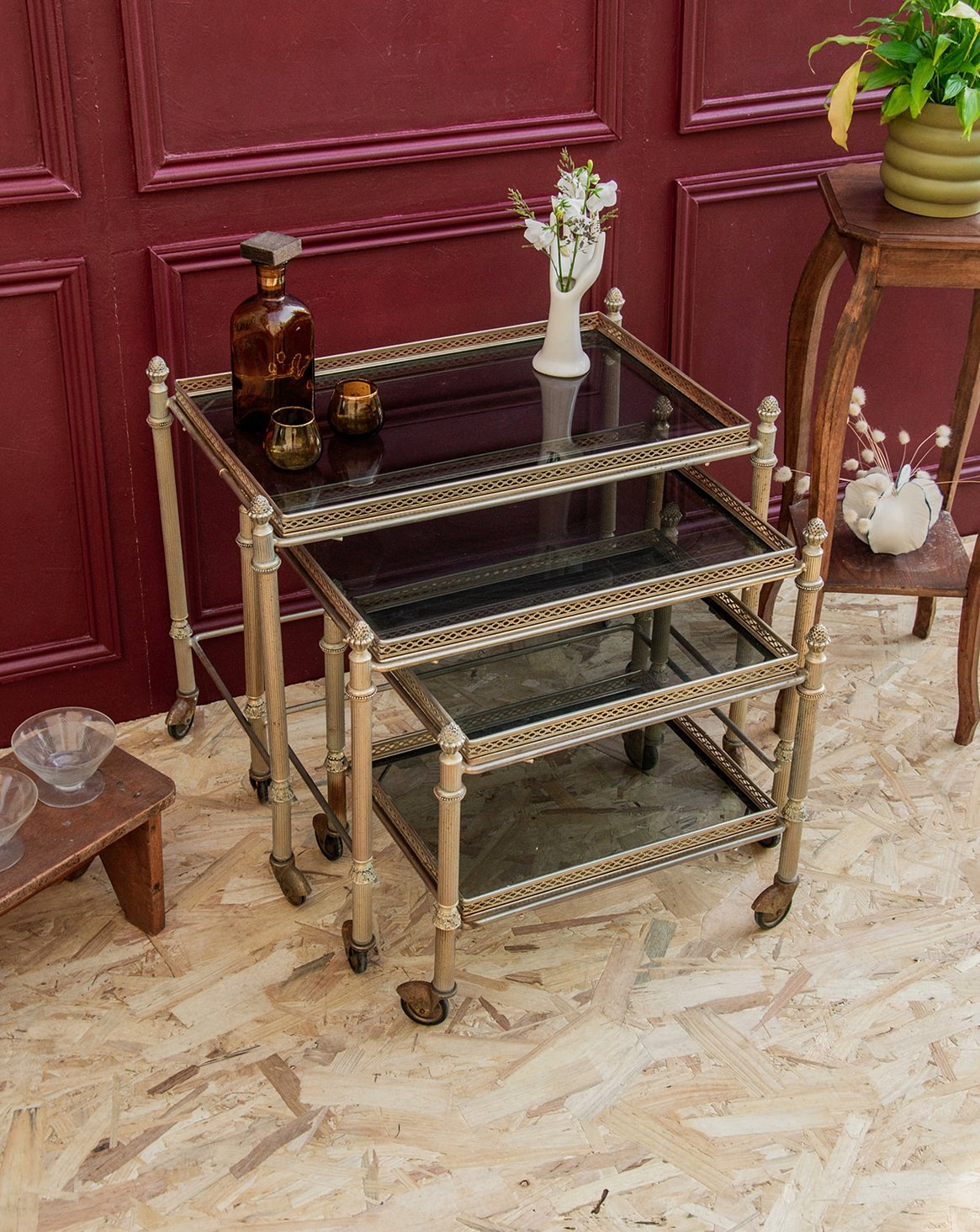 Laissez-vous séduire par cet ensemble de trois tables gigognes sur roulettes, mêlant élégance et praticité. Leurs plateaux en verre fumé apportent une touche de sophistication, tandis que la structure en laiton leur confère charme et solidité. Les légères traces de rouille ajoutent à leur authenticité, en faisant des pièces uniques à l’allure vintage affirmée. Idéales pour optimiser l’espace, elles se glissent et se déplacent facilement selon vos envies, tout en enrichissant votre décoration.