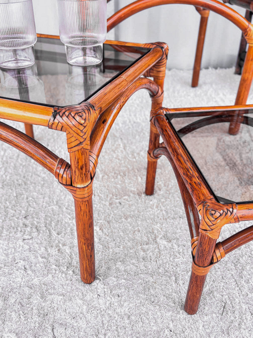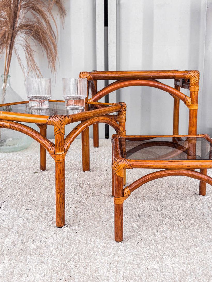 Apportez une touche rétro à votre intérieur avec cet ensemble de 3 tables gigognes en rotin au charme vintage. Chaque table, avec ses plateaux en verre fumé, allie élégance et praticité, vous permettant de les disposer selon vos envies. Les dimensions variées en font des alliées idéales pour optimiser votre espace. Un choix parfait pour une décoration à la fois chic et fonctionnelle.