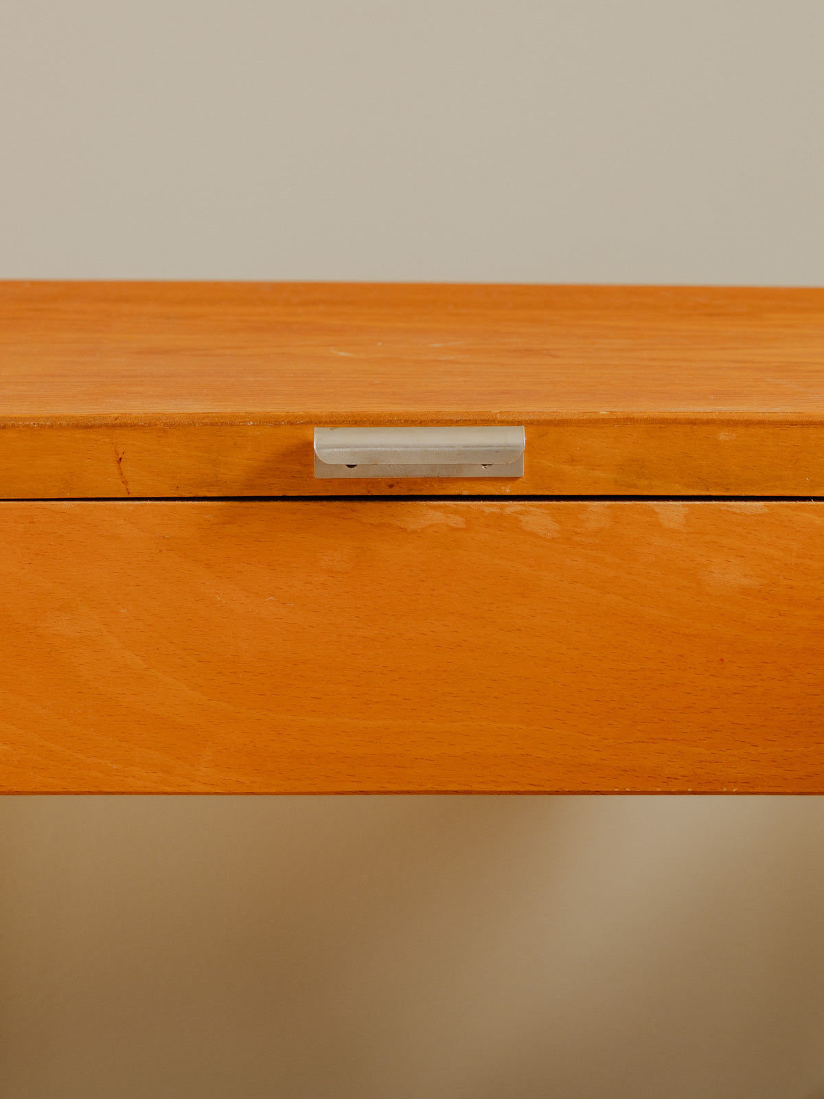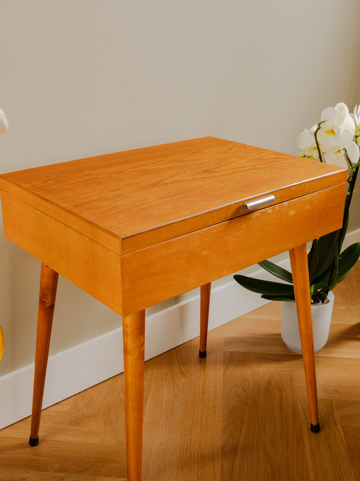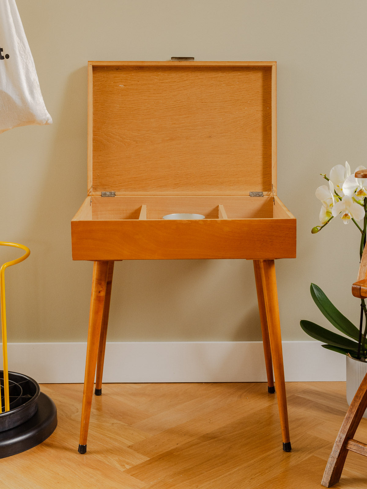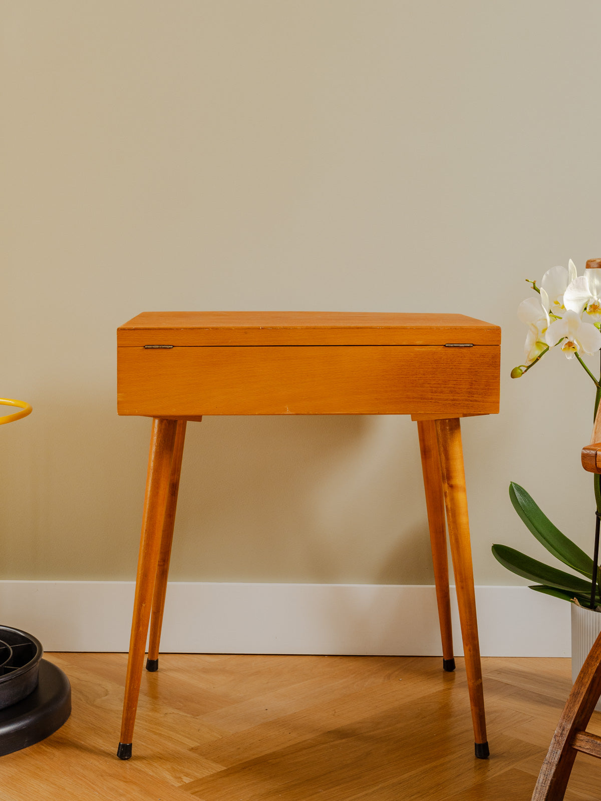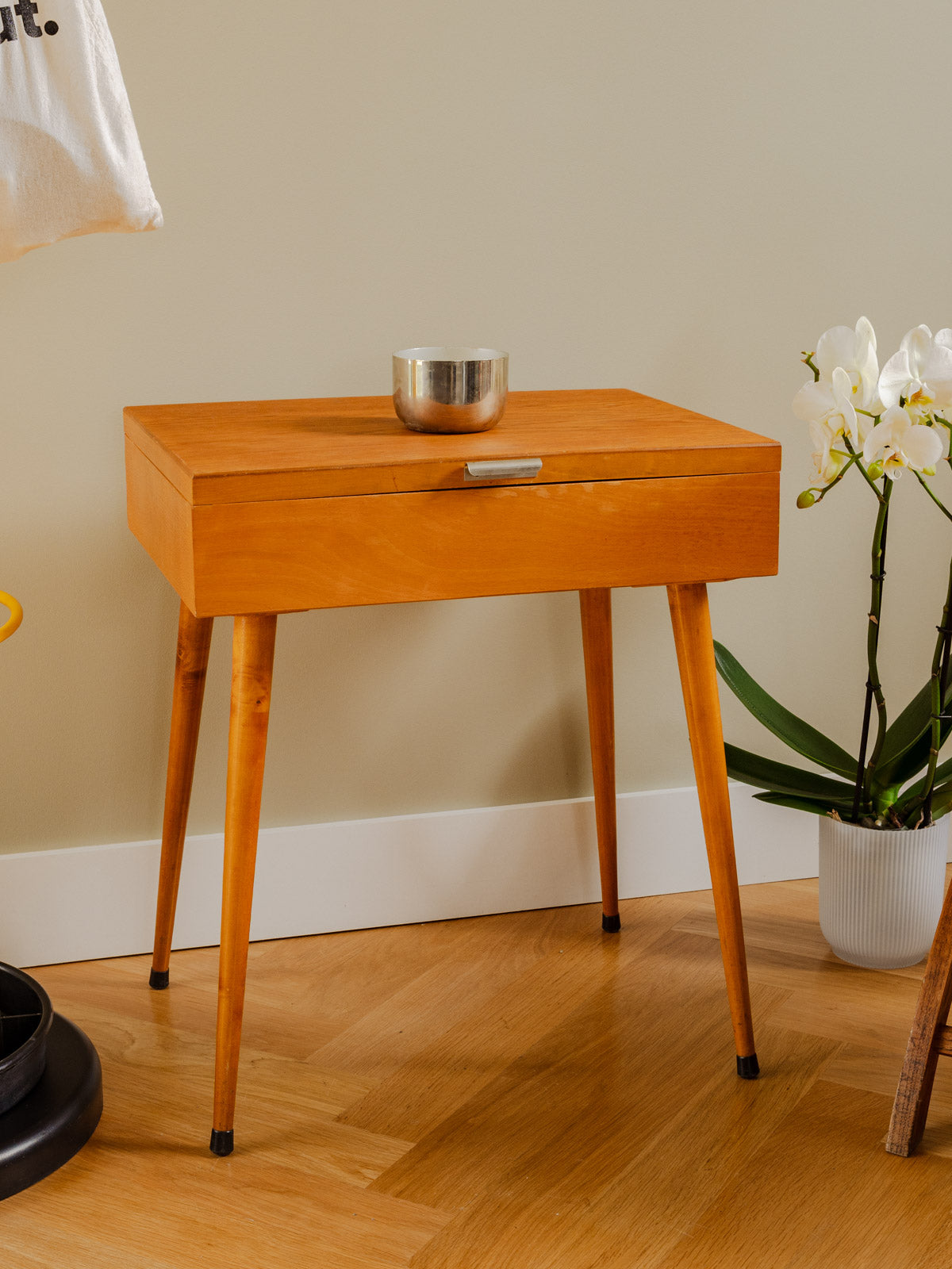 Découvrez cette table d’appoint ancienne travailleuse, un meuble à la fois pratique et élégant. Dotée d’un espace de rangement avec trois compartiments sous son plateau, elle vous permettra d’organiser vos affaires avec style. Ses pieds fuselés et sa petite poignée ajoutent une touche de charme vintage, tandis que sa patine du bois et ses quelques traces d’usage témoignent de son histoire. Un petit manque sur le fond de l’espace de rangement n’enlève rien à son caractère unique. Idéale pour apporter une note d’authenticité à votre intérieur !