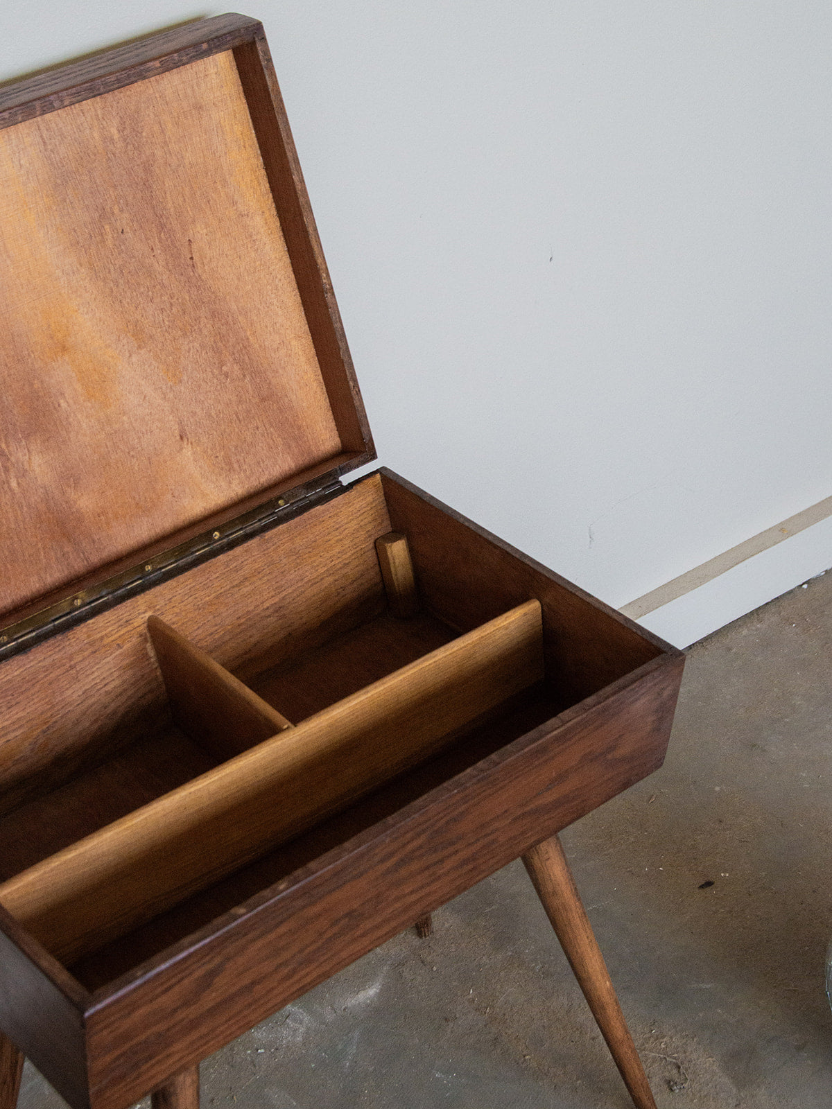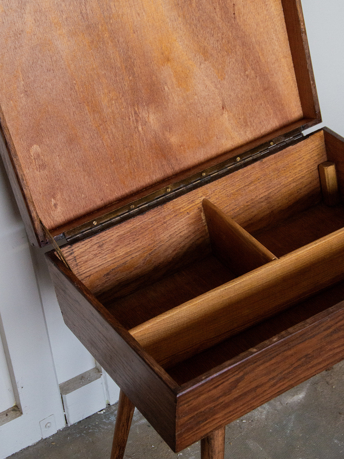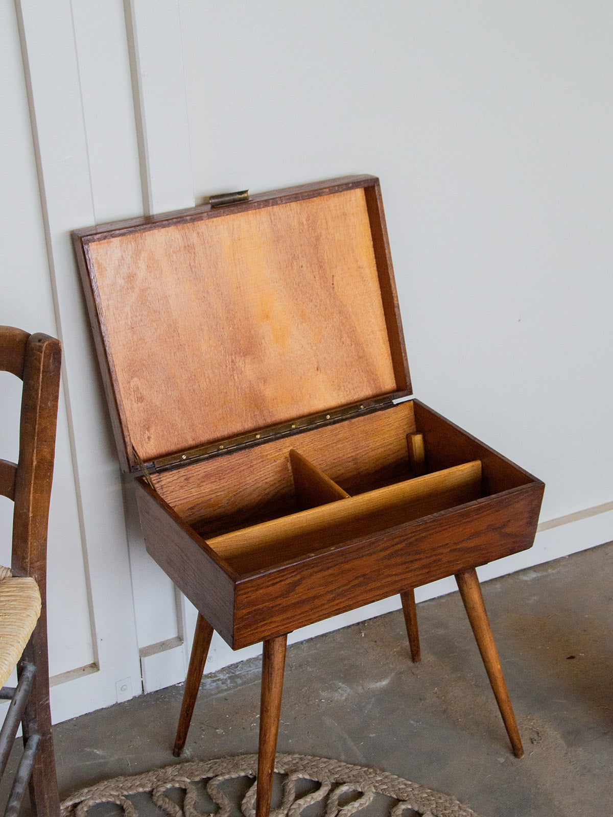 Découvrez cette charmante travailleuse, originellement boîte à couture vintage au design original avec des pieds compas coniques qui ajoutent une touche d'élégance rétro à votre intérieur. Bien que le plateau présente une légère trace, cela n'enlève rien à son charme intemporel. Parfaite pour ranger vos accessoires de couture ou aux accessoires, elle allie à la fois fonctionnalité et esthétique, faisant d'elle une pièce unique pour les passionnés de bricolage et de décoration. Ajoutez une note vintage à votre espace avec cette pièce à la fois pratique et décorative.