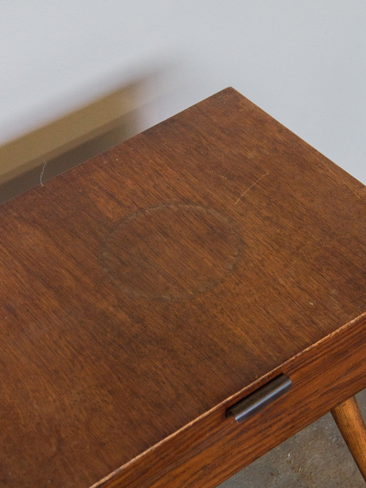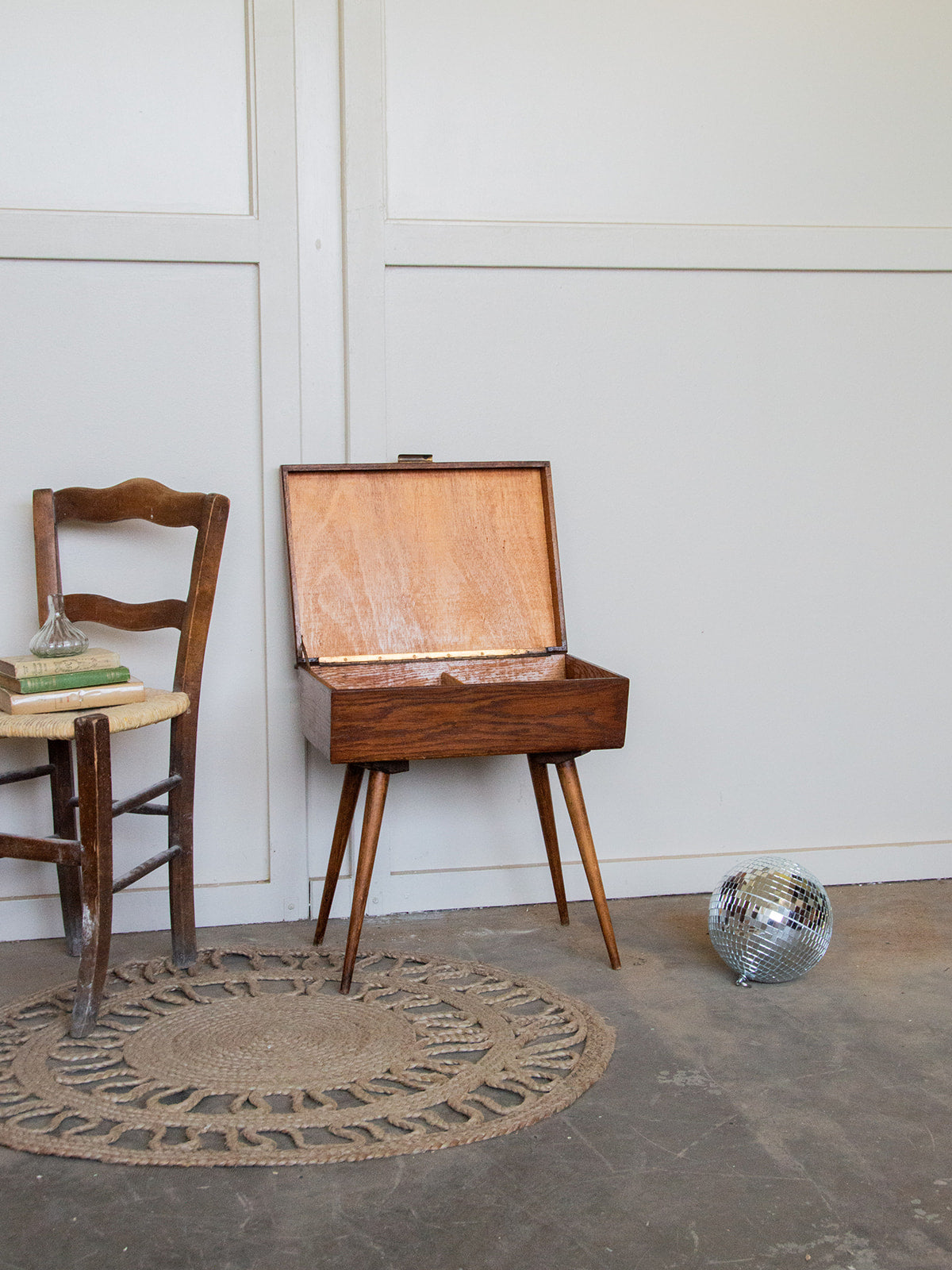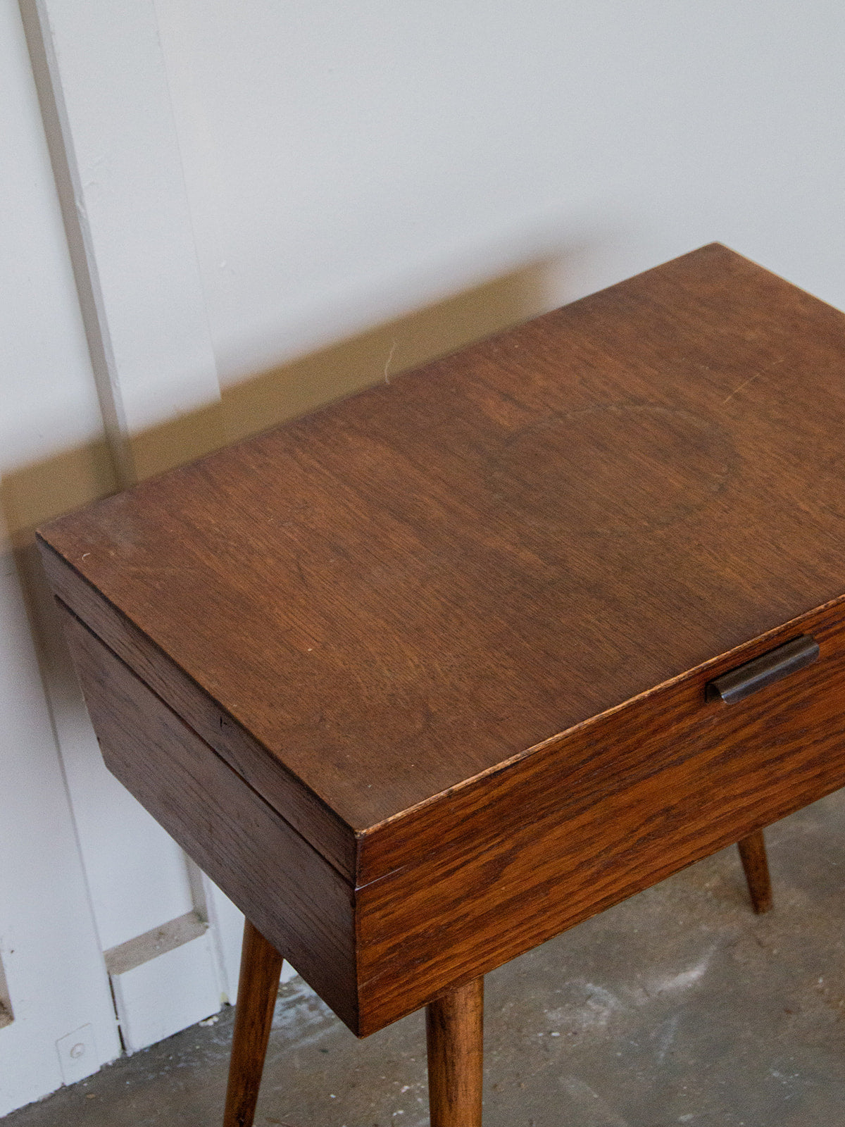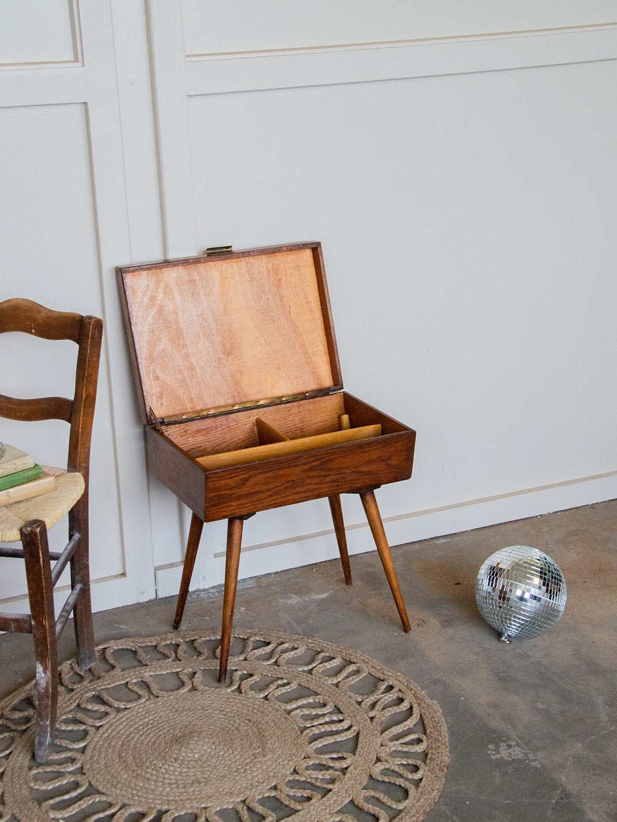 Découvrez cette charmante travailleuse, originellement boîte à couture vintage au design original avec des pieds compas coniques qui ajoutent une touche d'élégance rétro à votre intérieur. Bien que le plateau présente une légère trace, cela n'enlève rien à son charme intemporel. Parfaite pour ranger vos accessoires de couture ou aux accessoires, elle allie à la fois fonctionnalité et esthétique, faisant d'elle une pièce unique pour les passionnés de bricolage et de décoration. Ajoutez une note vintage à votre espace avec cette pièce à la fois pratique et décorative.