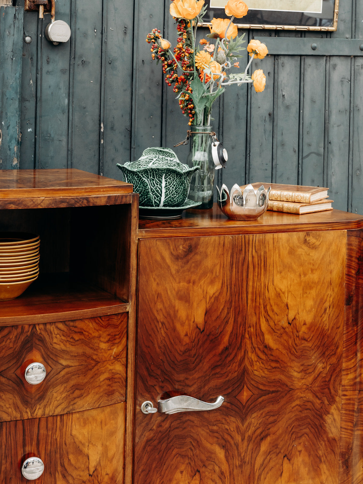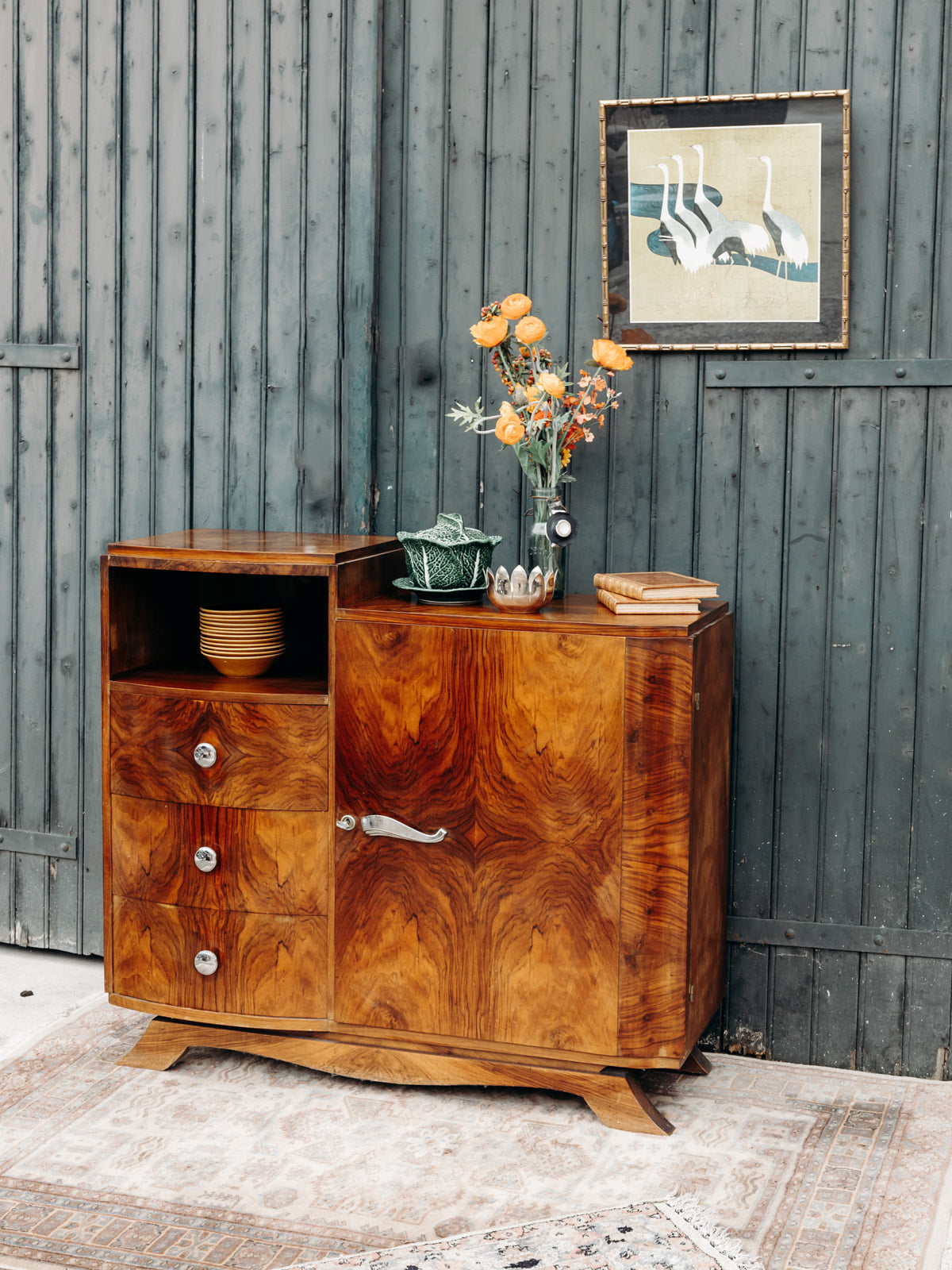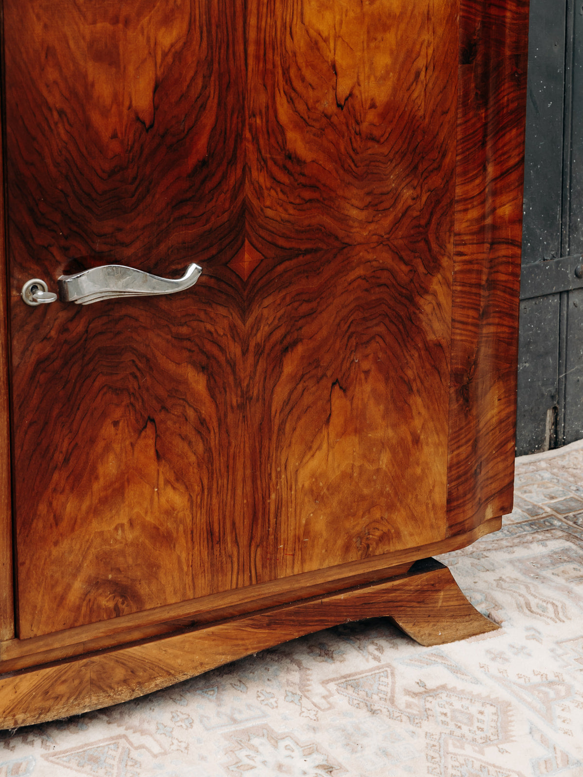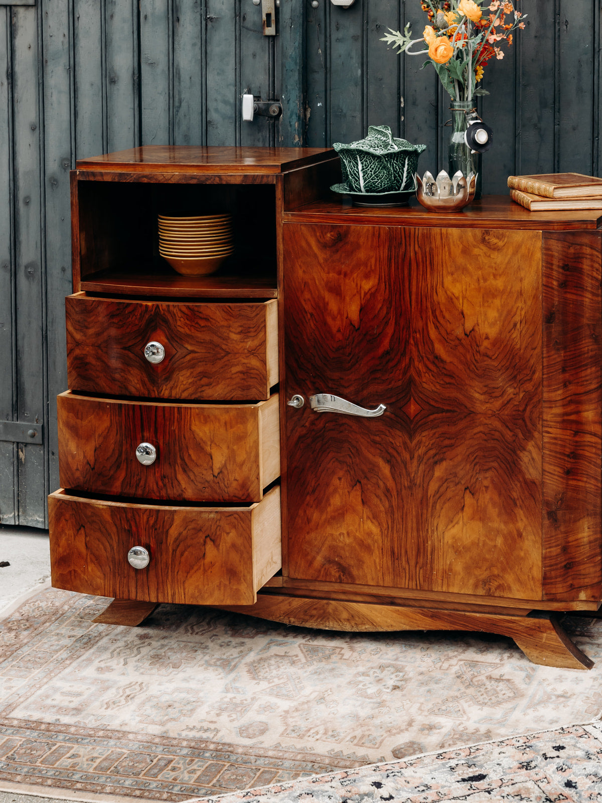 Buffet Art déco en bois, sublimé par un magnifique placage en ronce de noyer. Il offre trois tiroirs spacieux, une niche ouverte et un placard sécurisé par des clés, avec des étagères réglables sur crémaillères pour une grande modularité. Les poignées chromées apportent une touche moderne à ce meuble au design intemporel, alliant fonctionnalité et élégance pour sublimer votre intérieur.