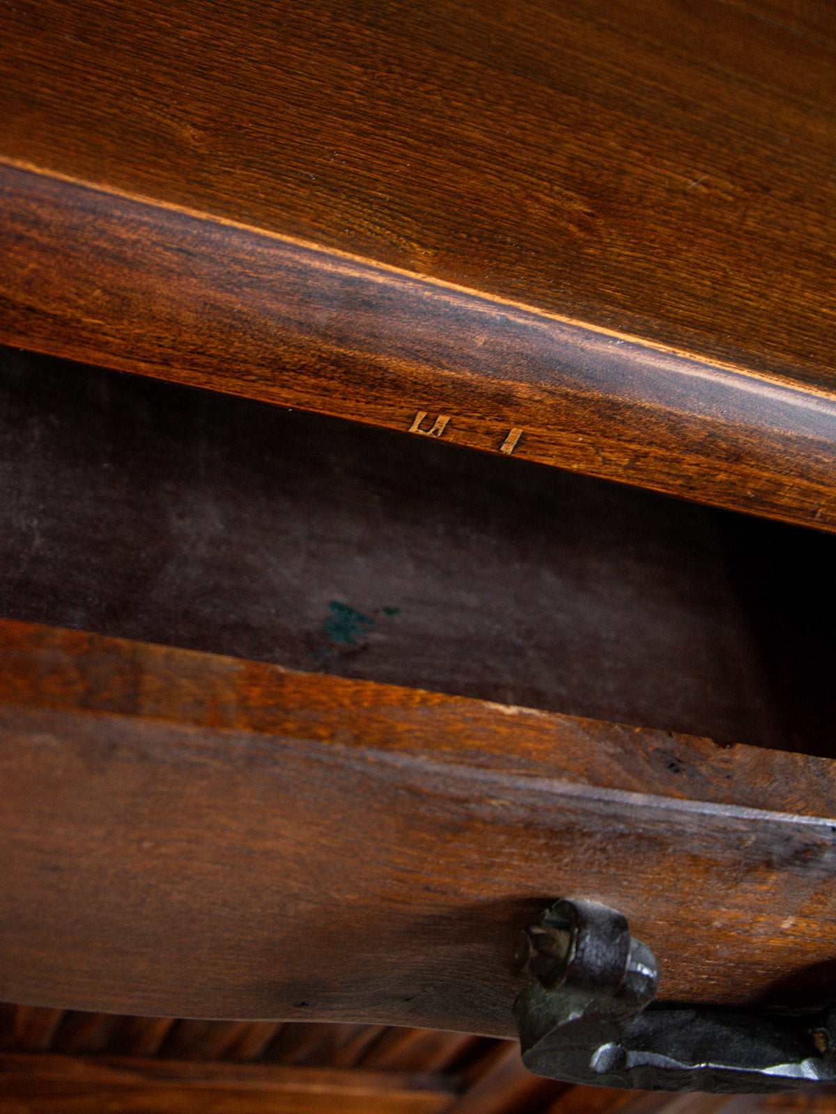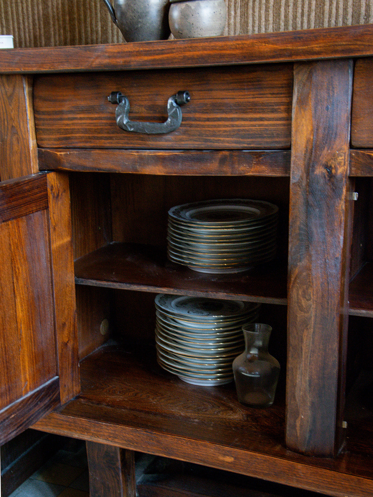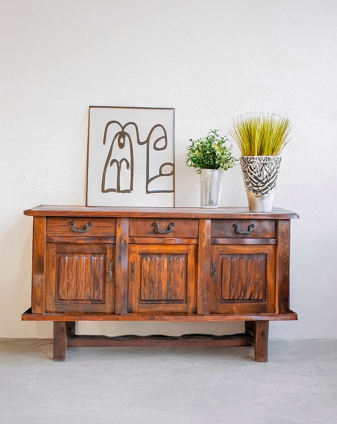 Apportez du caractère à votre intérieur avec ce buffet en bois au style brutaliste. Ses pieds hauts et son assemblage soigné, combinés à de jolis détails, apportent une touche unique à ce meuble. Avec trois tiroirs à poignées métalliques et trois étagères, il offre un bel espace de rangement fonctionnel. Les portes à serrures ajoutent une note de sécurité, bien qu'une clé soit manquante. Le veinage du bois et son travail raffiné en font une pièce élégante et intemporelle pour votre décoration.