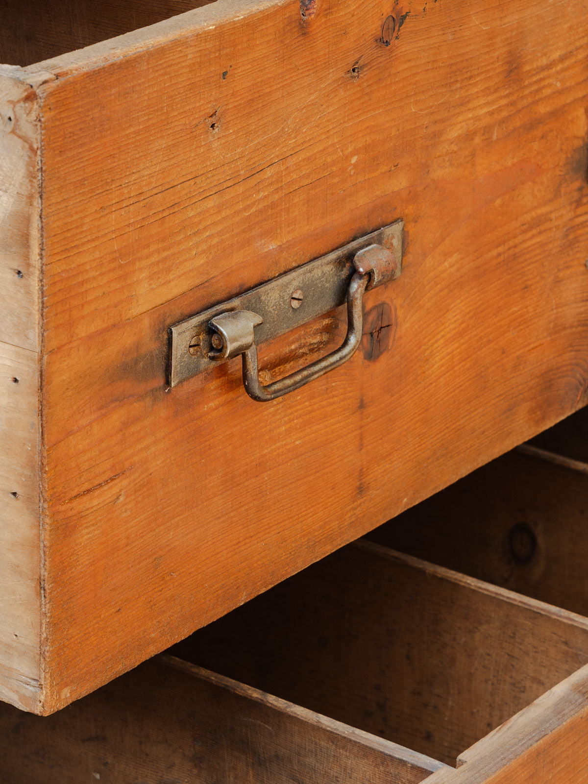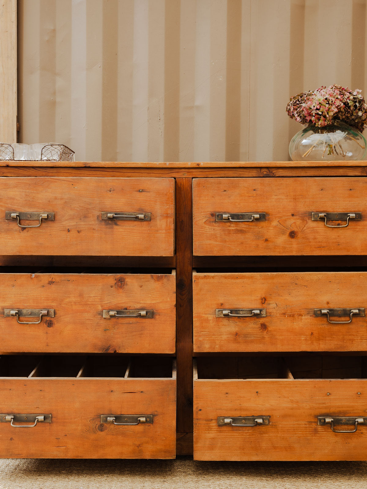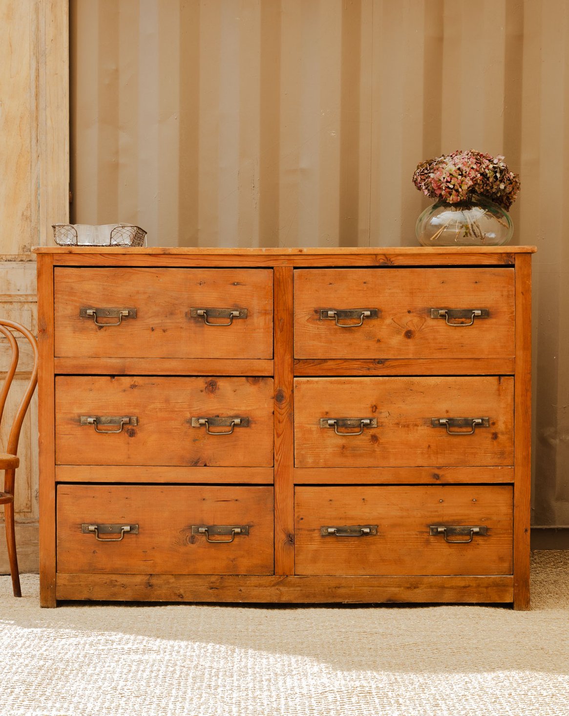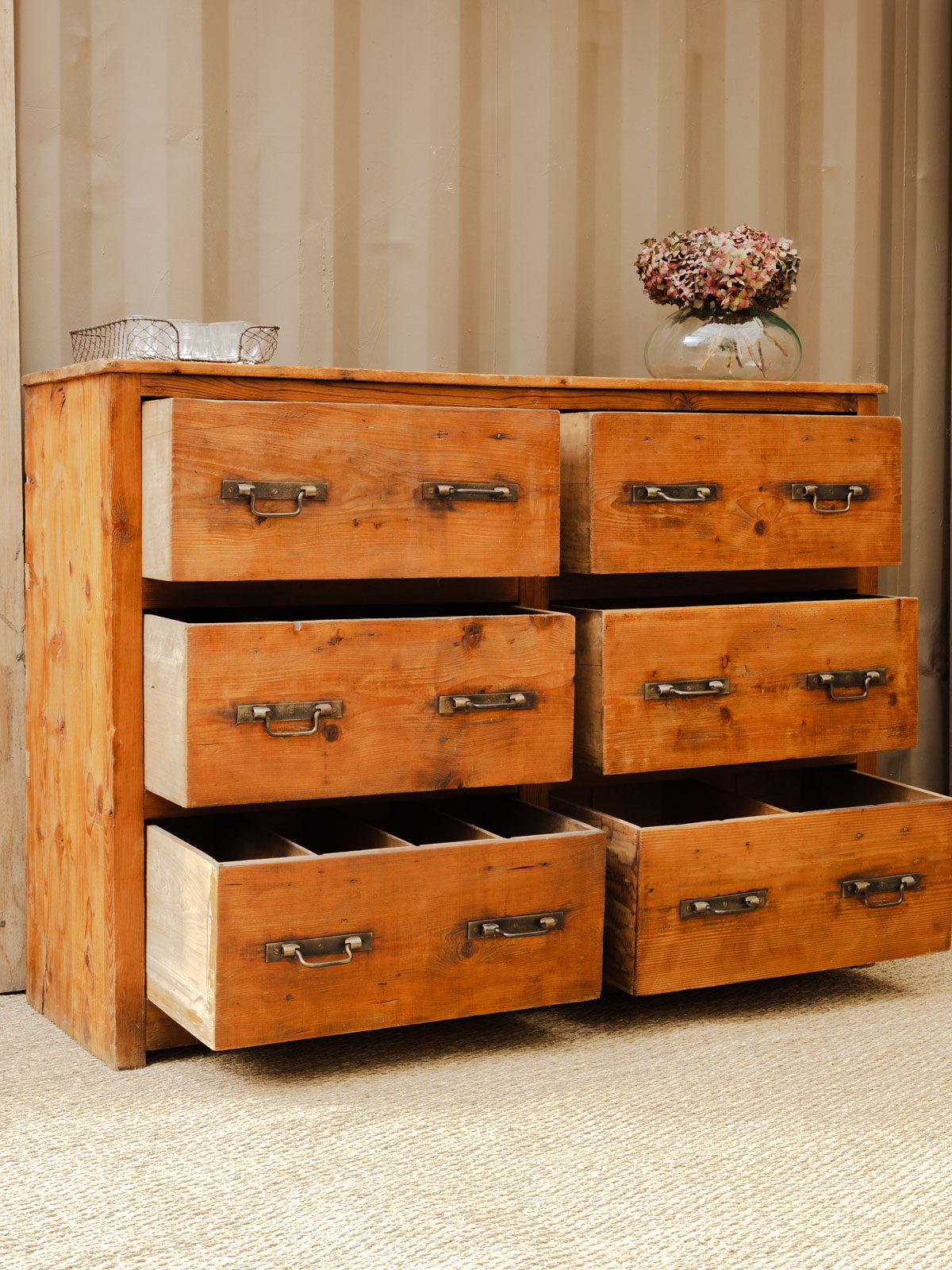 Découvrez ce meuble de métier au charme authentique, doté de 6 tiroirs pratiques avec compartiments amovibles, parfait pour organiser vos essentiels. Réalisé en pin massif, il apporte une touche vintage à votre intérieur tout en offrant une robustesse à toute épreuve. Les poignées en métal ajoutent une note de caractère et de style à ce meuble de mercerie, idéal pour le rangement dans un atelier ou un bureau. Apportez une note de praticité et d'élégance à votre décoration avec ce meuble unique.