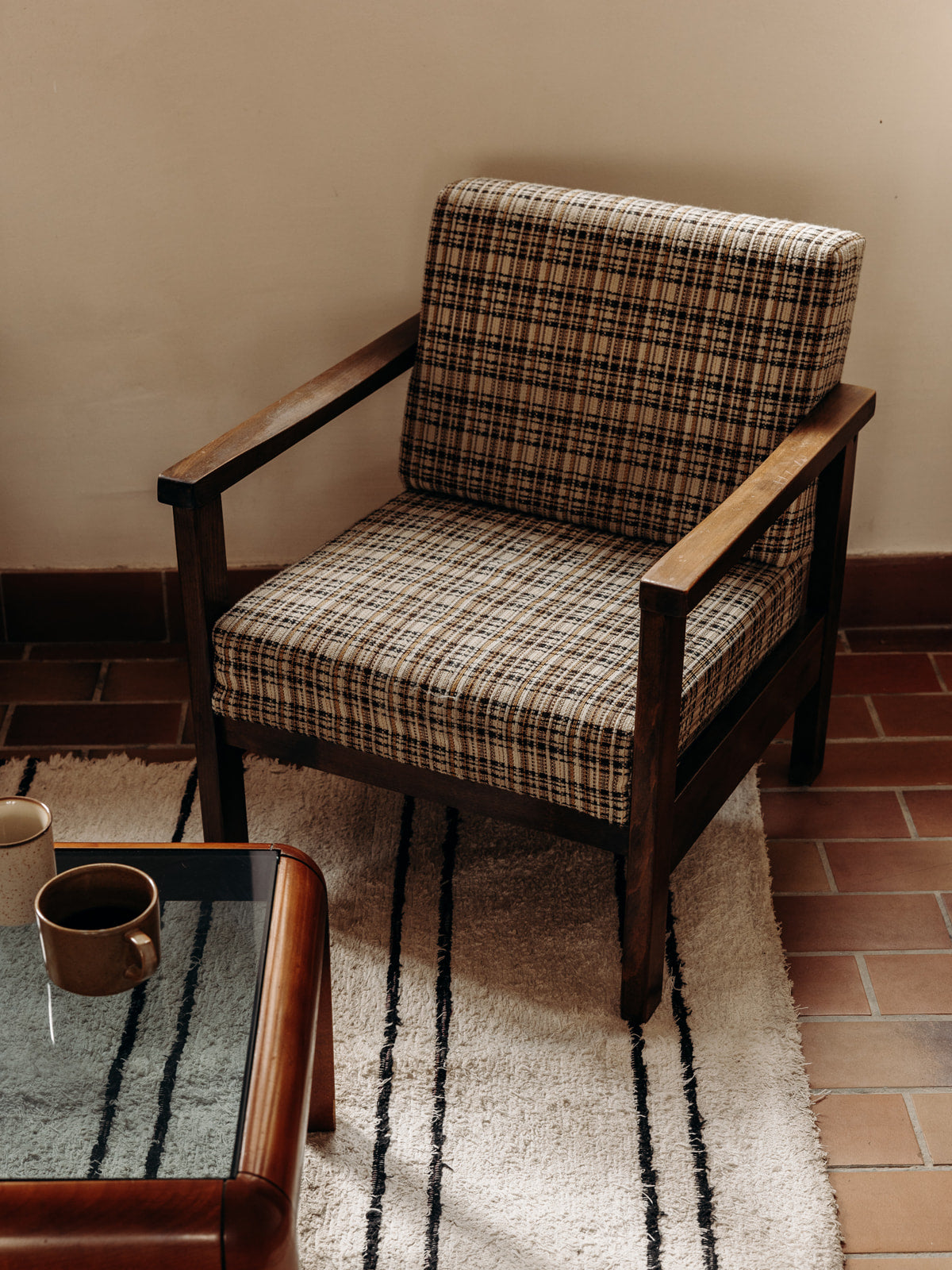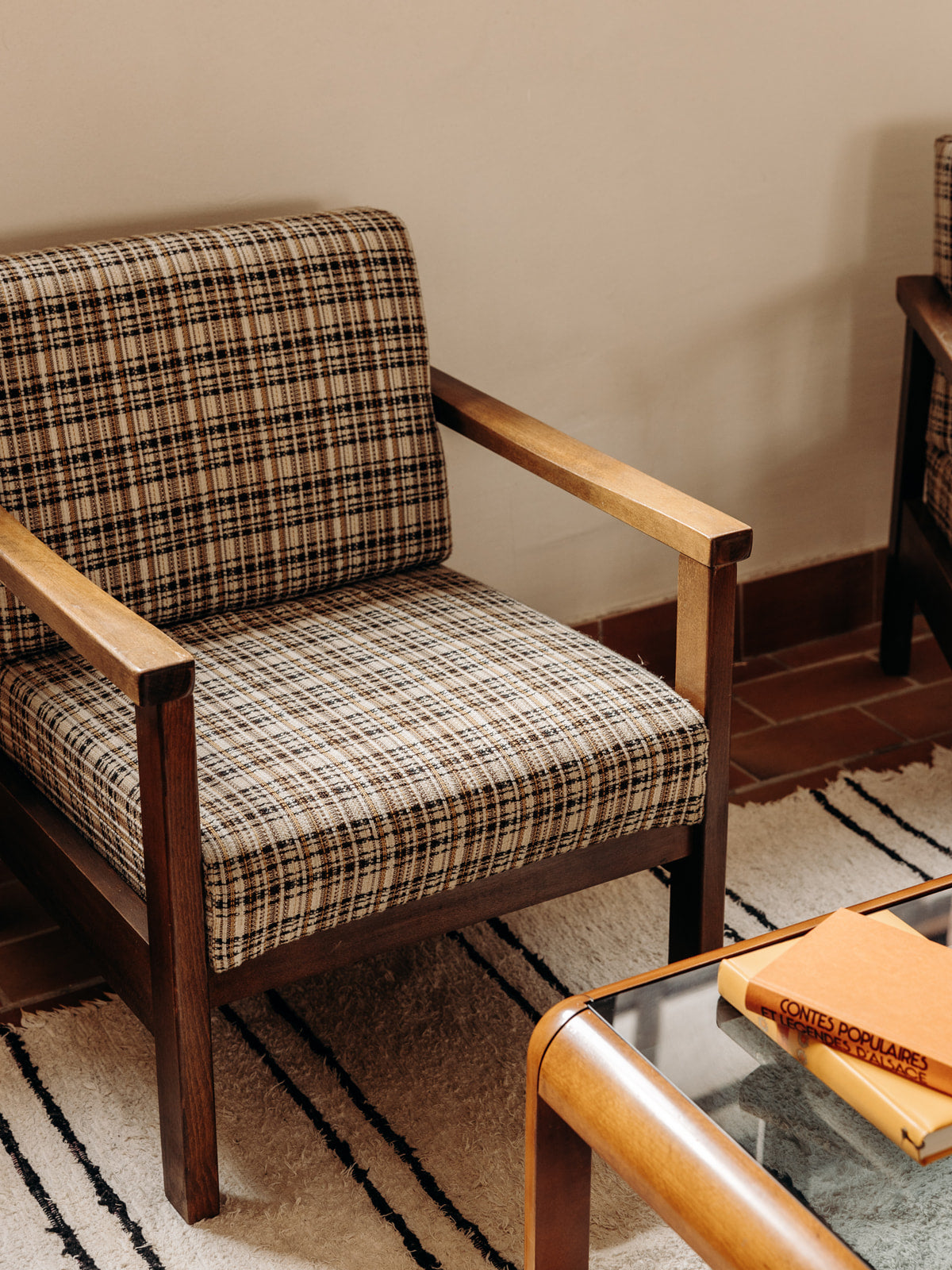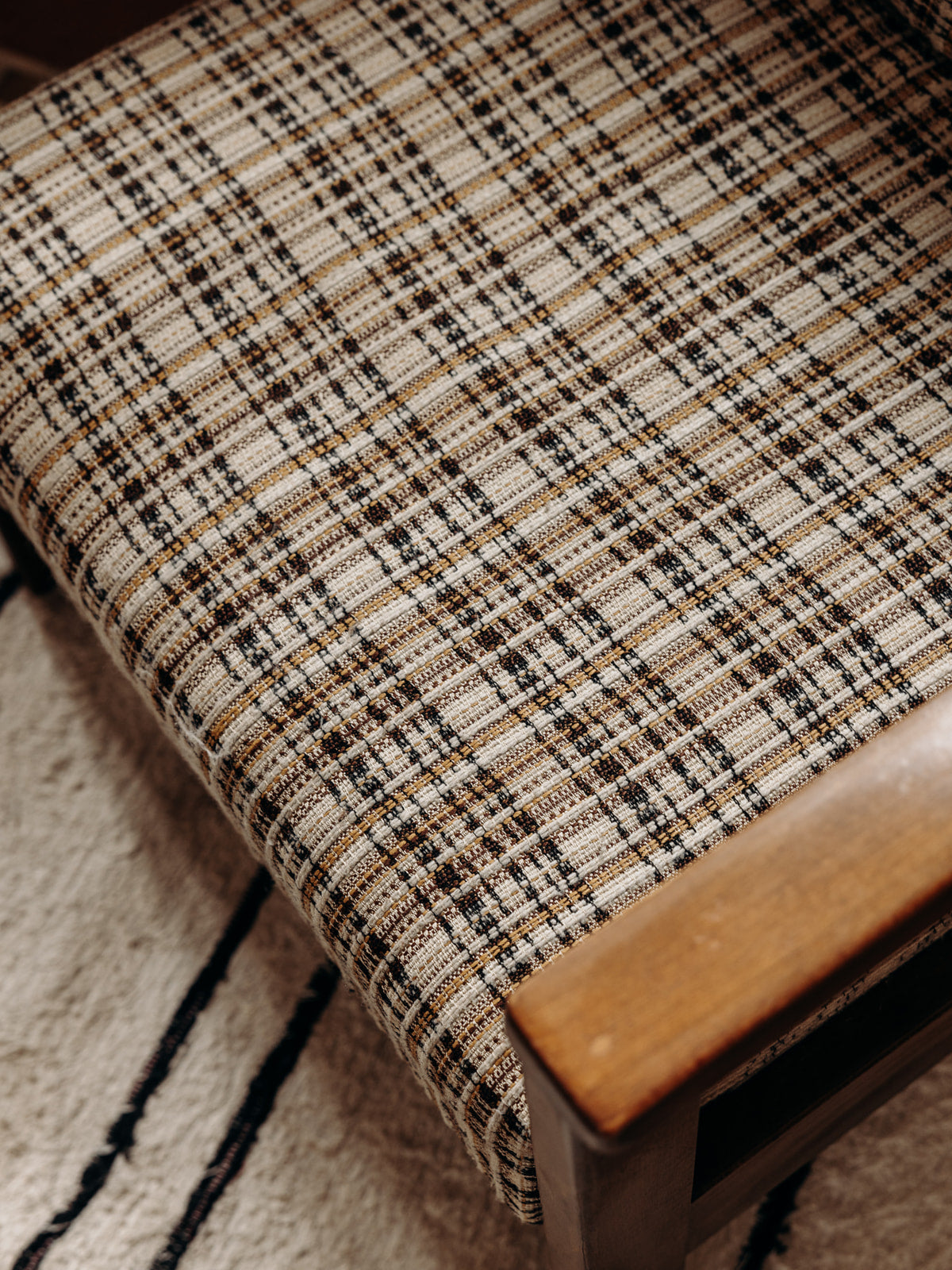 Coup de coeur pour ce fauteuil bas des années 60, en hêtre teinté et revêtu d'un tissu tweed à carreaux, s'inspire du design épuré des créations du fabricant français Baumann. Son style vintage, à la fois unique et intemporel, apportera une touche de caractère à votre intérieur. Que ce soit dans un salon ou une chambre, il saura enrichir votre espace tout en alliant confort et esthétique. Une pièce subtile et élégante qui trouve sa place dans tout environnement. Vendus séparément, deux exemplaires disponibles.