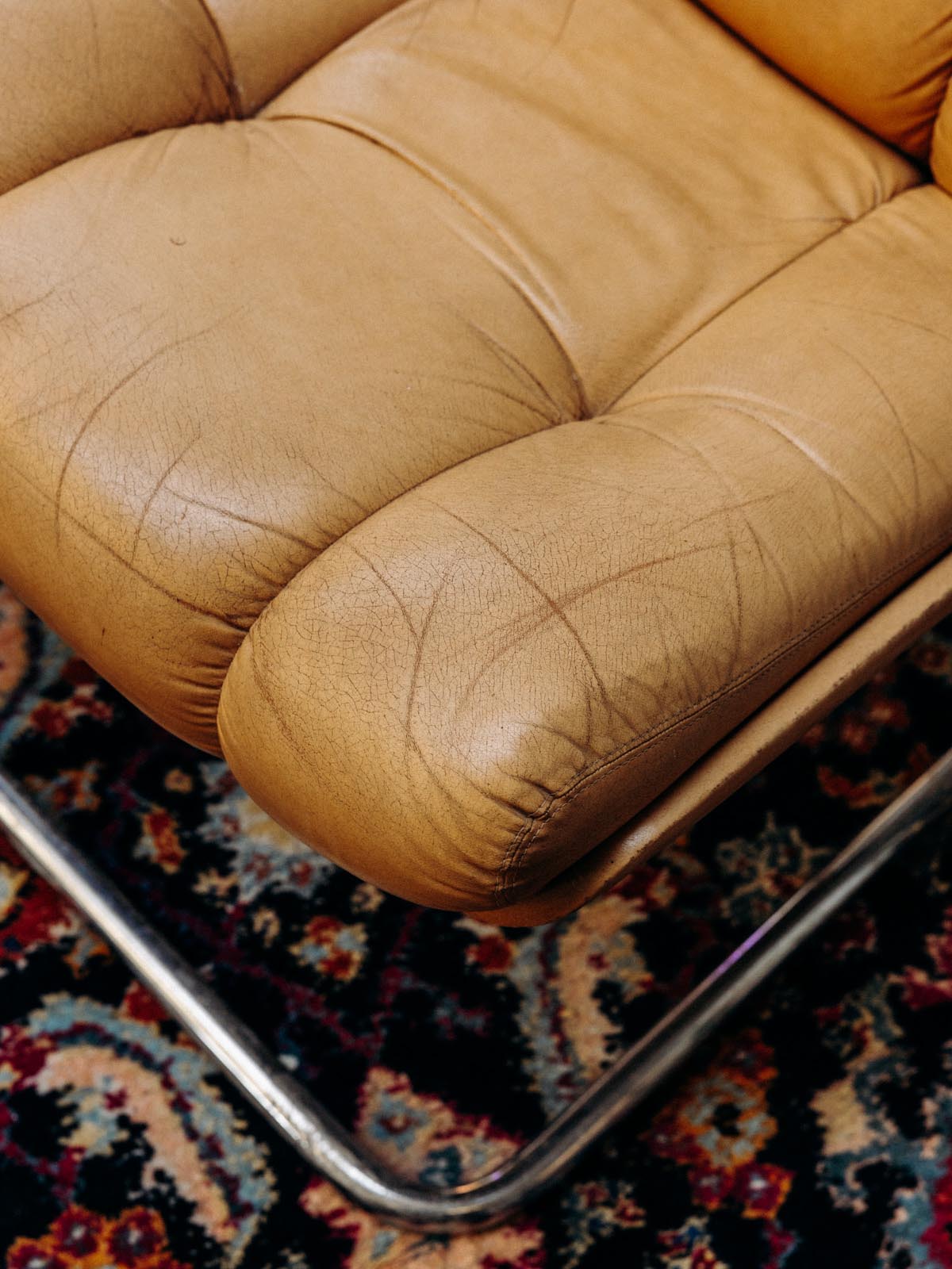 Ajoutez une touche d'élégance à votre intérieur avec cette paire de fauteuils Roche Bobois en cuir patiné orange. Leur structure tubulaire en métal garantit robustesse et modernité, tandis que l'absence d'accotoirs offre un design épuré et minimaliste. Parfaits pour un séjour contemporain ou un espace de détente stylé, ces fauteuils allient confort et esthétique avec brio.