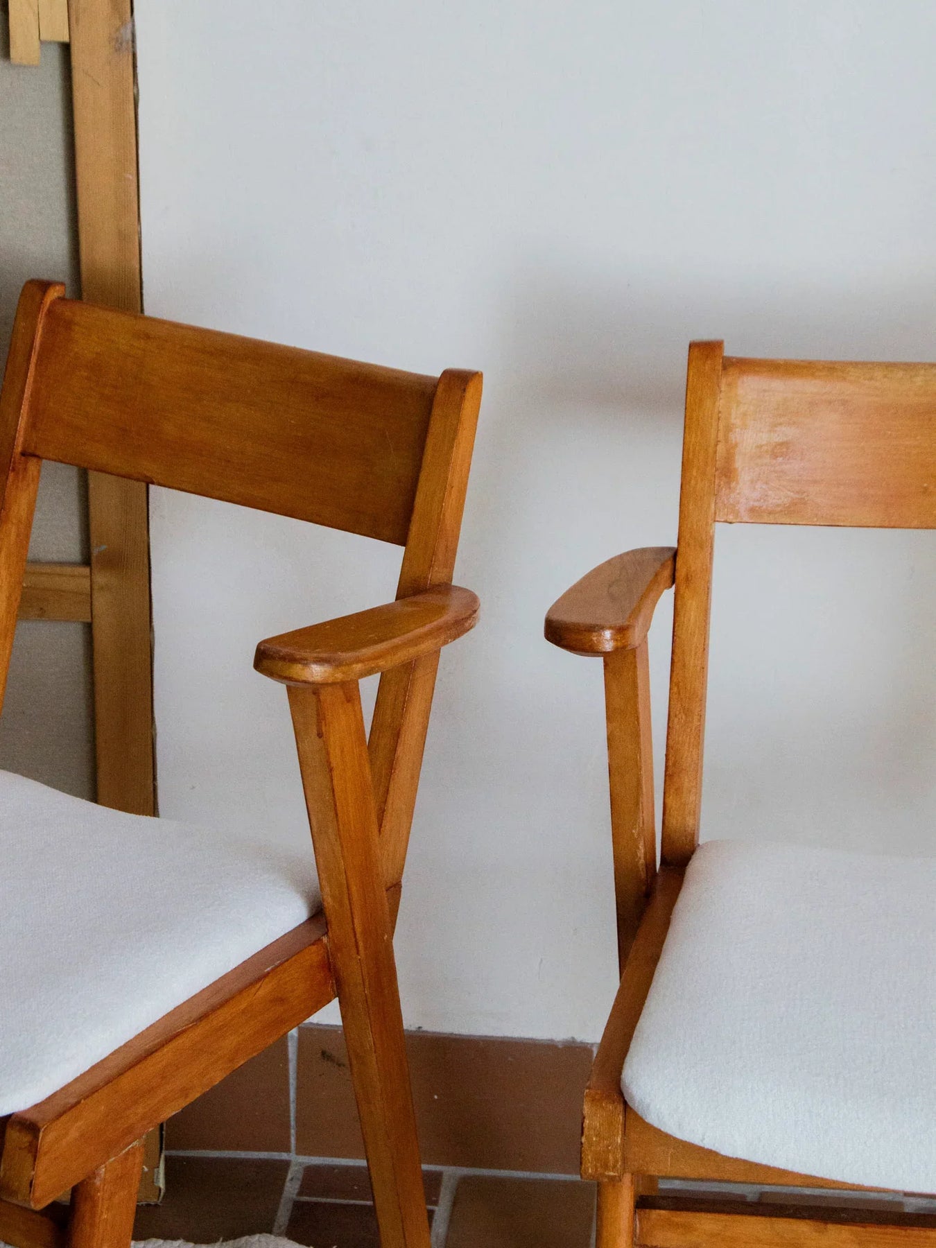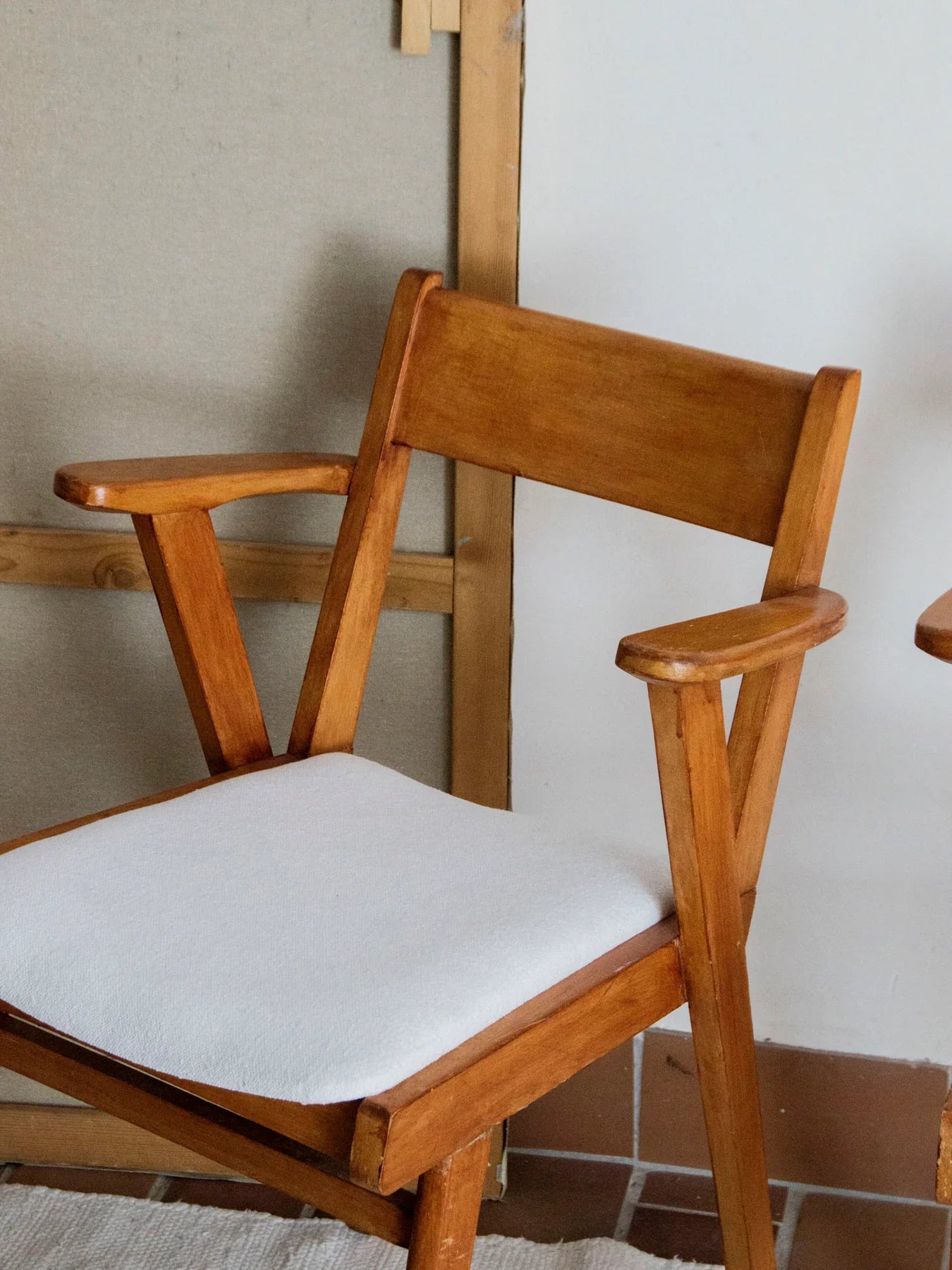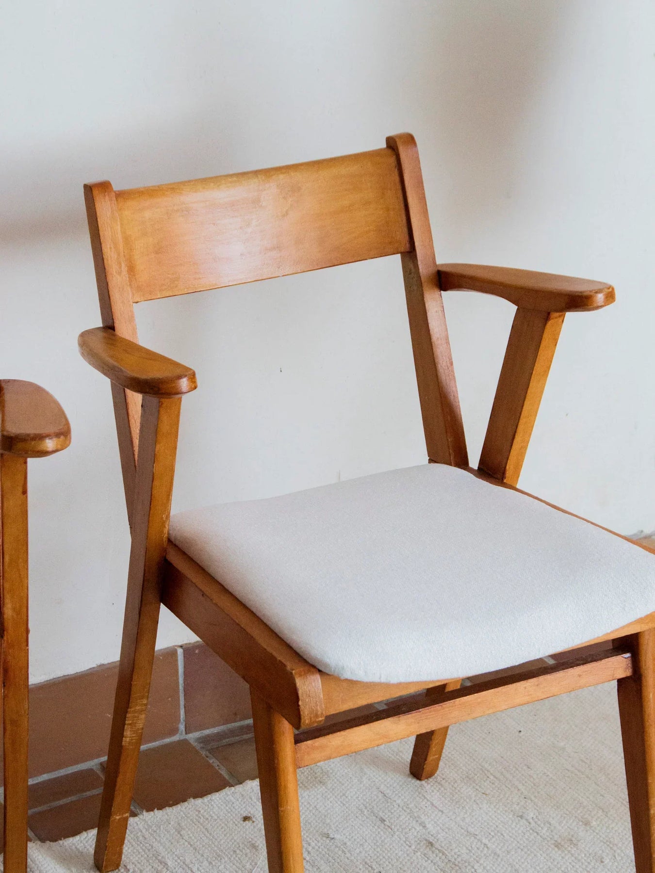 Découvrez cette élégante paire de fauteuils des années 60. Leur structure en bois massif, enrichie d'une belle patine et de traces d’usure, témoigne de leur histoire et de leur authenticité. L'assise, entièrement retapissée dans un tissu beige clair sobre et neuf, offre un confort optimal et s’harmonise parfaitement avec le bois. Avec leurs accoudoirs légèrement inclinés et leur silhouette équilibrée, ces fauteuils s'intègrent aisément dans un salon ou entourent une table de salle à manger, ajoutant une touche vintage robuste et pleine de caractère à votre intérieur. Idéaux pour ceux qui privilégient les matières naturelles et le mobilier intemporel.