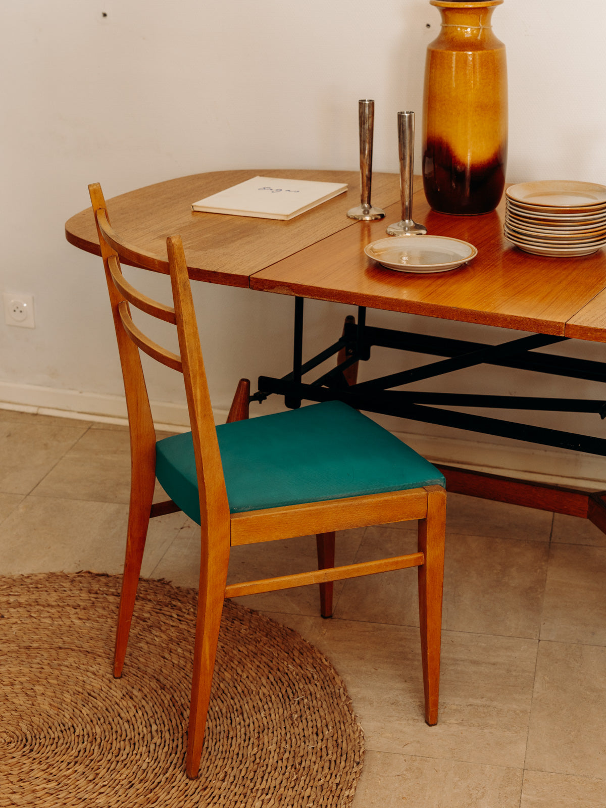 Découvrez cette superbe table scandinave des années 1960, modèle « Smørrebrød ». Son plateau en plaqué teck offre une esthétique chaleureuse, tandis qu'un ingénieux mécanisme permet de la transformer en une grande table à manger pouvant accueillir jusqu'à 8 convives. La rallonge, plus foncée en teck verni, témoigne d'un usage moindre. Bien que l'ensemble présente une tache sur le plateau et qu'un pied nécessite une petite restauration, cette pièce emblématique saura apporter une touche vintage et fonctionnelle à votre intérieur.