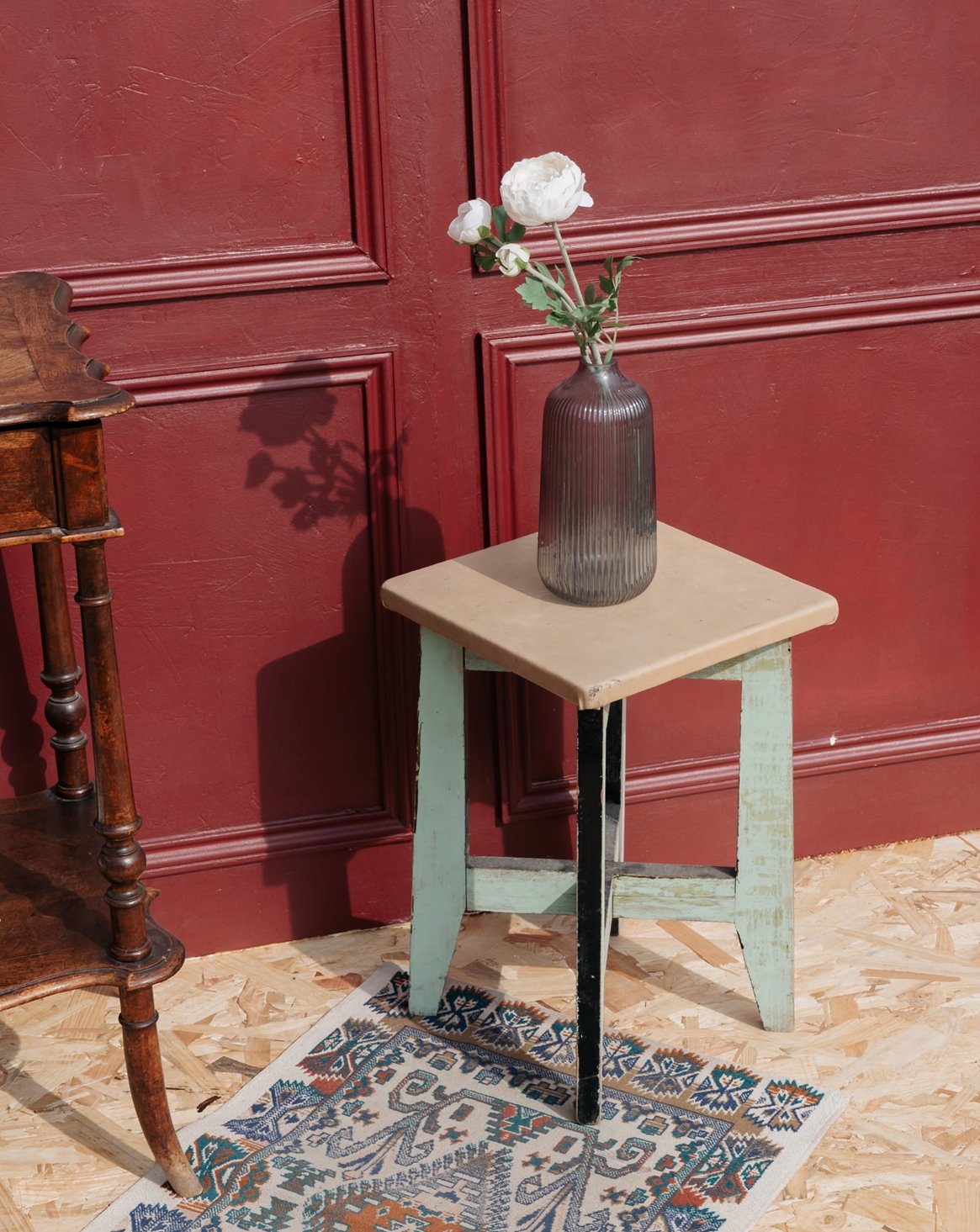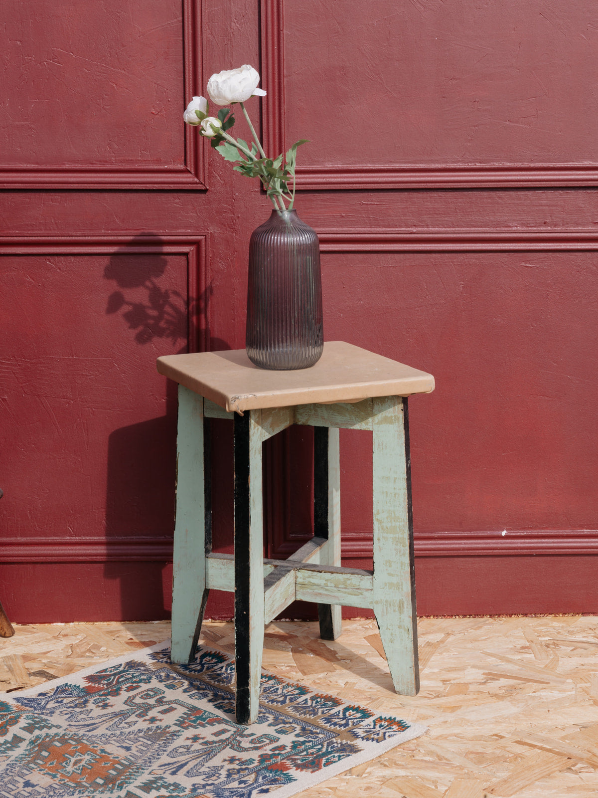 Apportez une touche élégante à votre intérieur avec ce tabouret en bois aux teintes vert d'eau et noires. Son design intemporel et sa finition artisanale en font une pièce unique, parfaite pour compléter un décor contemporain. Bien qu'il présente quelques traces d'usure, ces marques témoignent de son caractère et de son histoire. Idéal comme assise supplémentaire ou pour sublimer un coin lecture, ce tabouret saura séduire les amateurs de meubles au charme authentique.