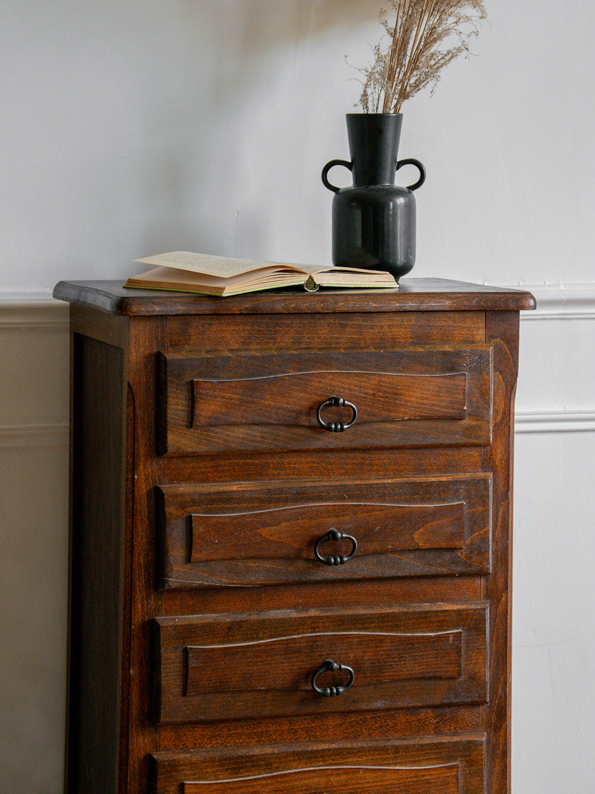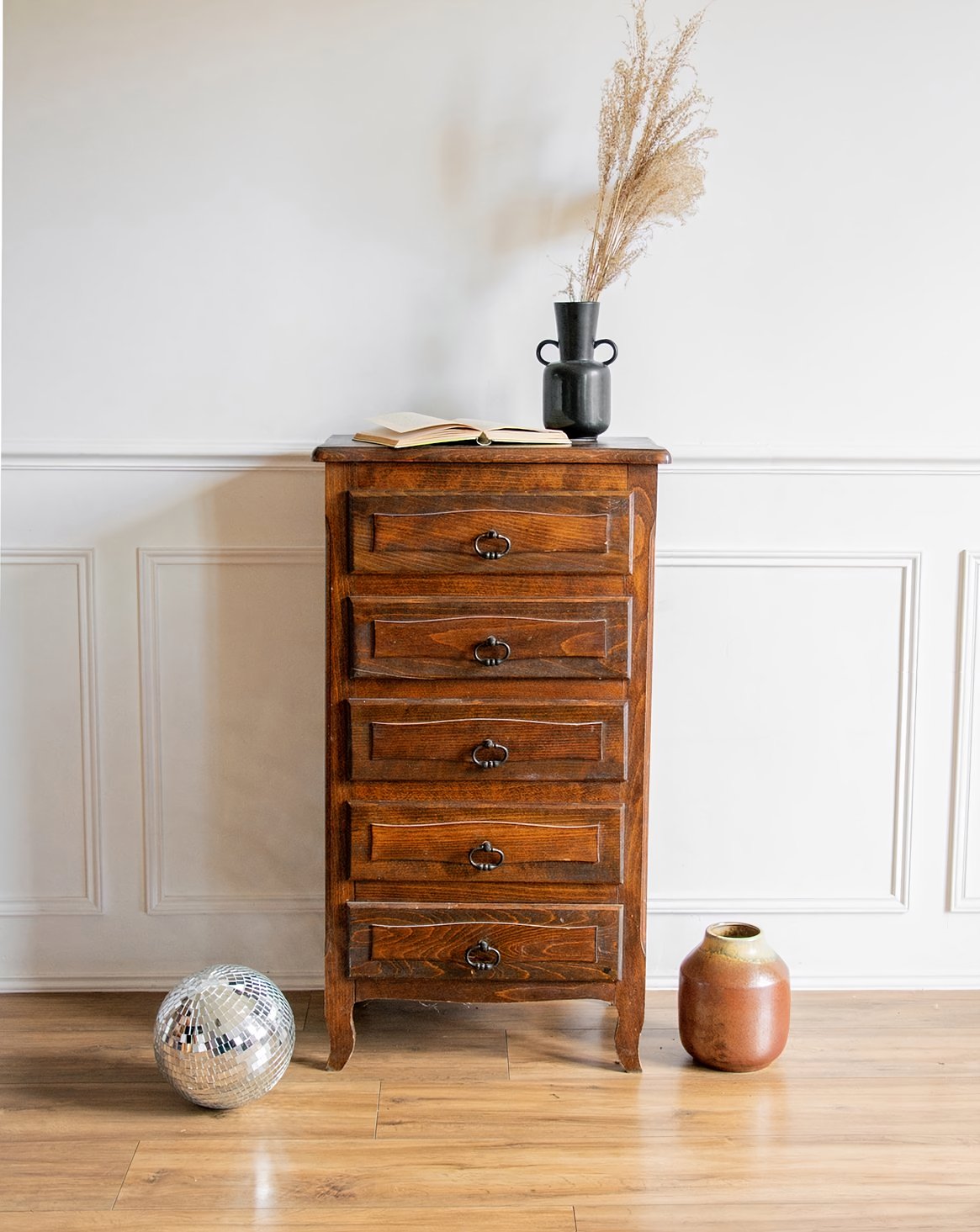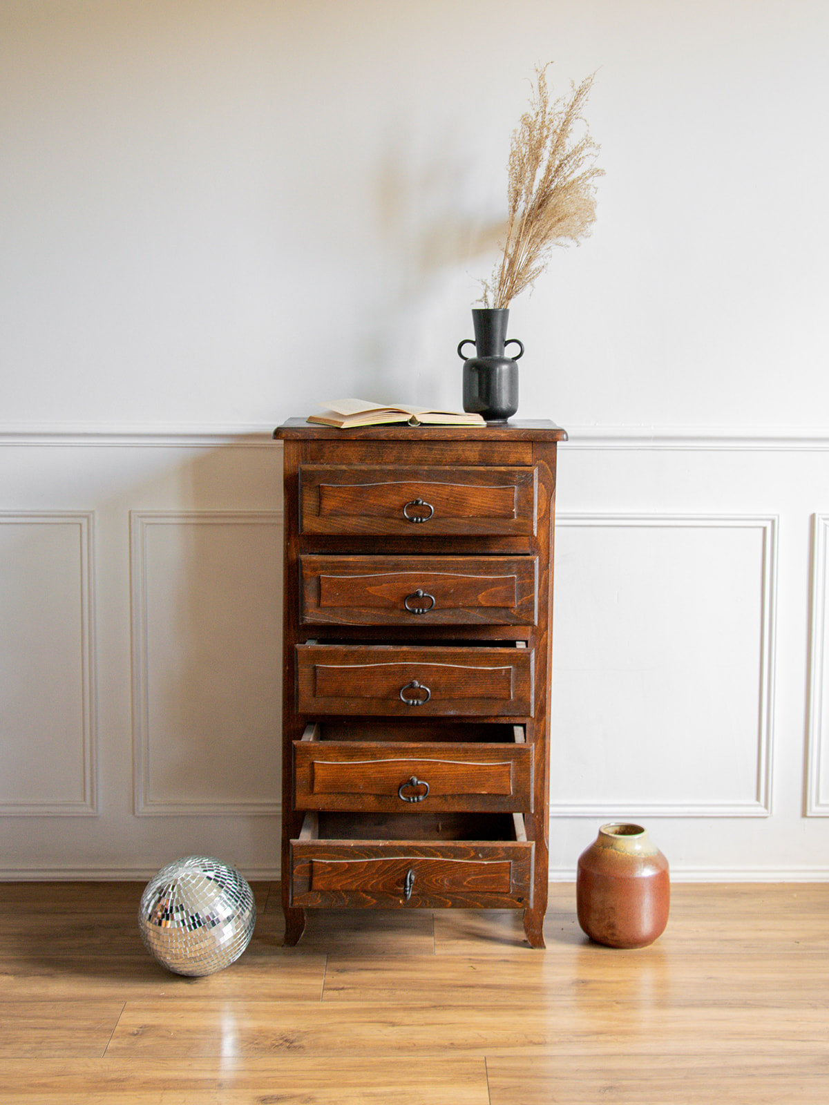 Apportez du charme à votre intérieur avec ce meuble de rangement en bois. Il est équipé de 5 tiroirs pratiques pour organiser vos effets personnels. Sa patine et ses marques du temps lui donnent une belle authenticité. Un meuble fonctionnel et plein de caractère pour toutes les pièces. Idéal pour ajouter une touche vintage à votre décoration.