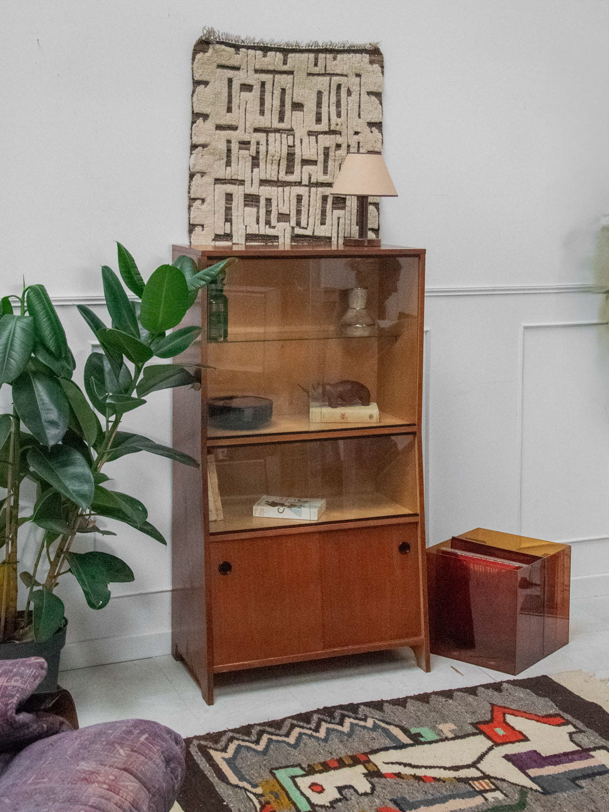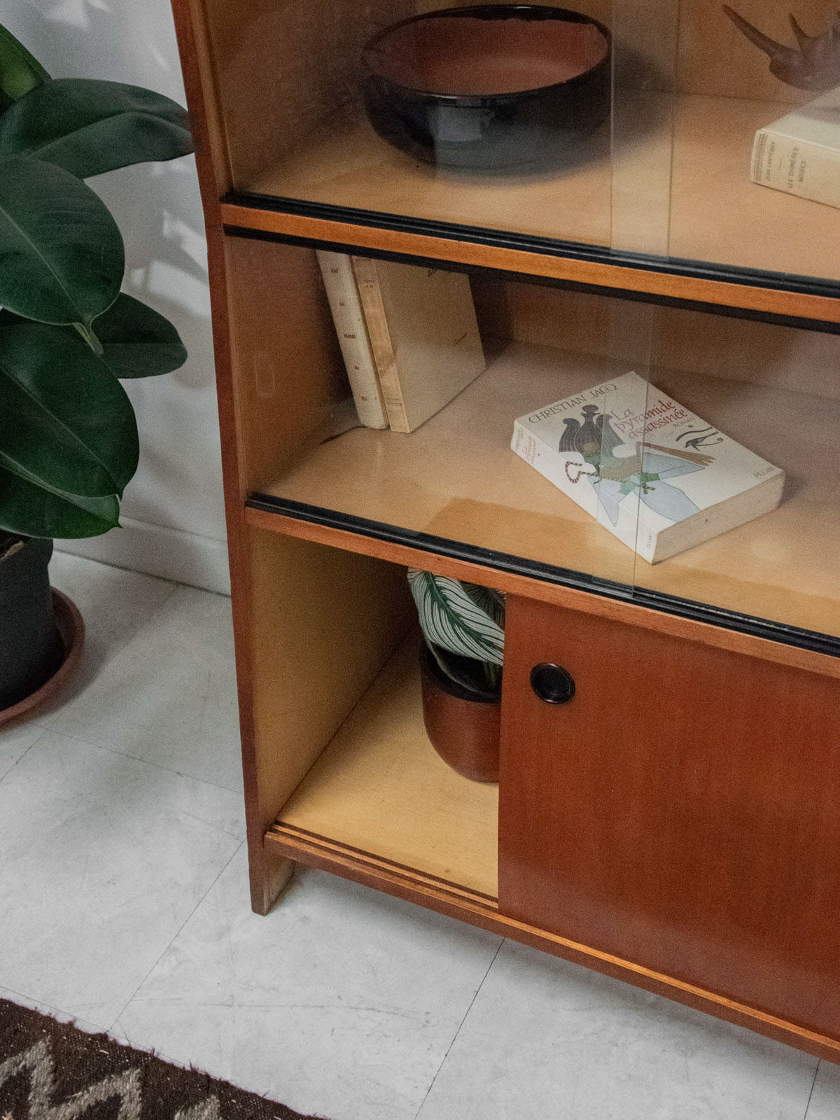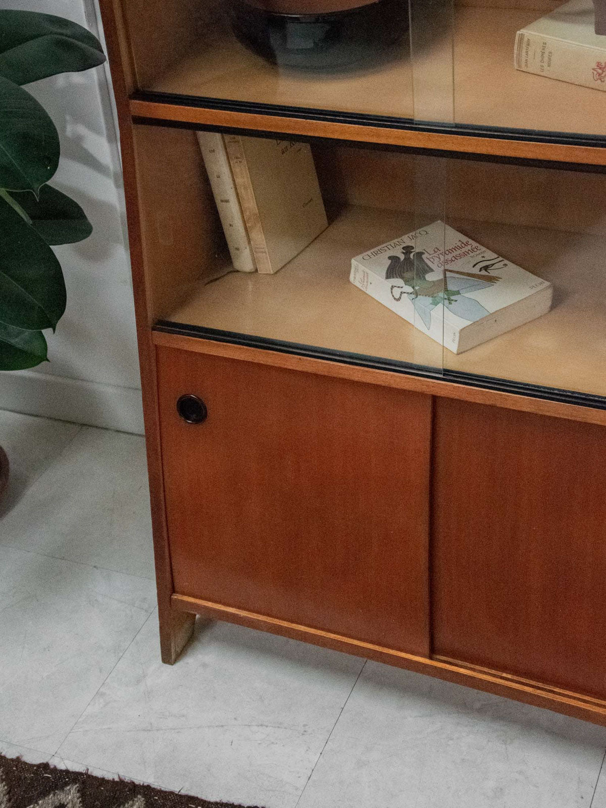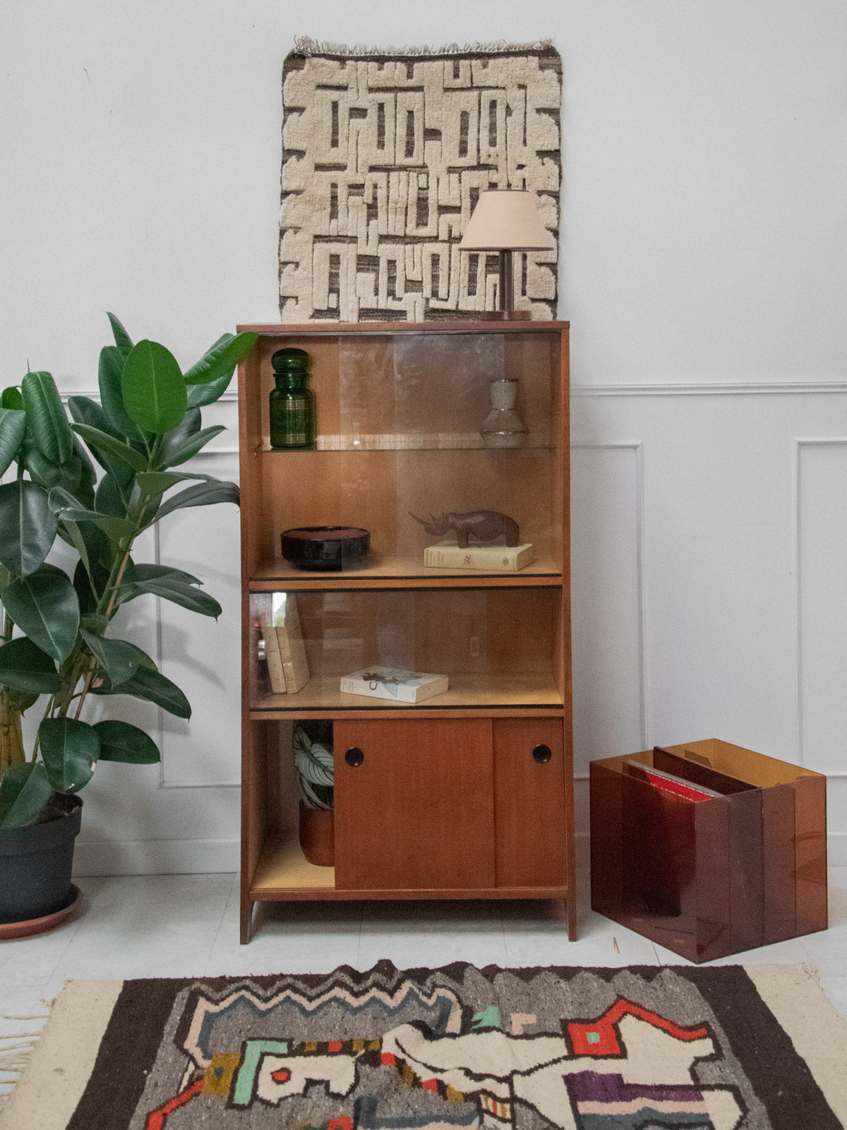 Ajoutez une touche vintage à votre intérieur avec ce meuble de rangement haut vitré rénové des années 60. Fabriqué en bois vernis, il offre trois niveaux spacieux, dont deux avec des portes vitrées élégantes, parfaits pour mettre en valeur vos objets décoratifs. Le dernier niveau est doté de portes coulissantes en bois, alliant praticité et style. Bien que quelques marques d'usure soient visibles, elles témoignent du charme authentique de ce meuble au caractère unique.