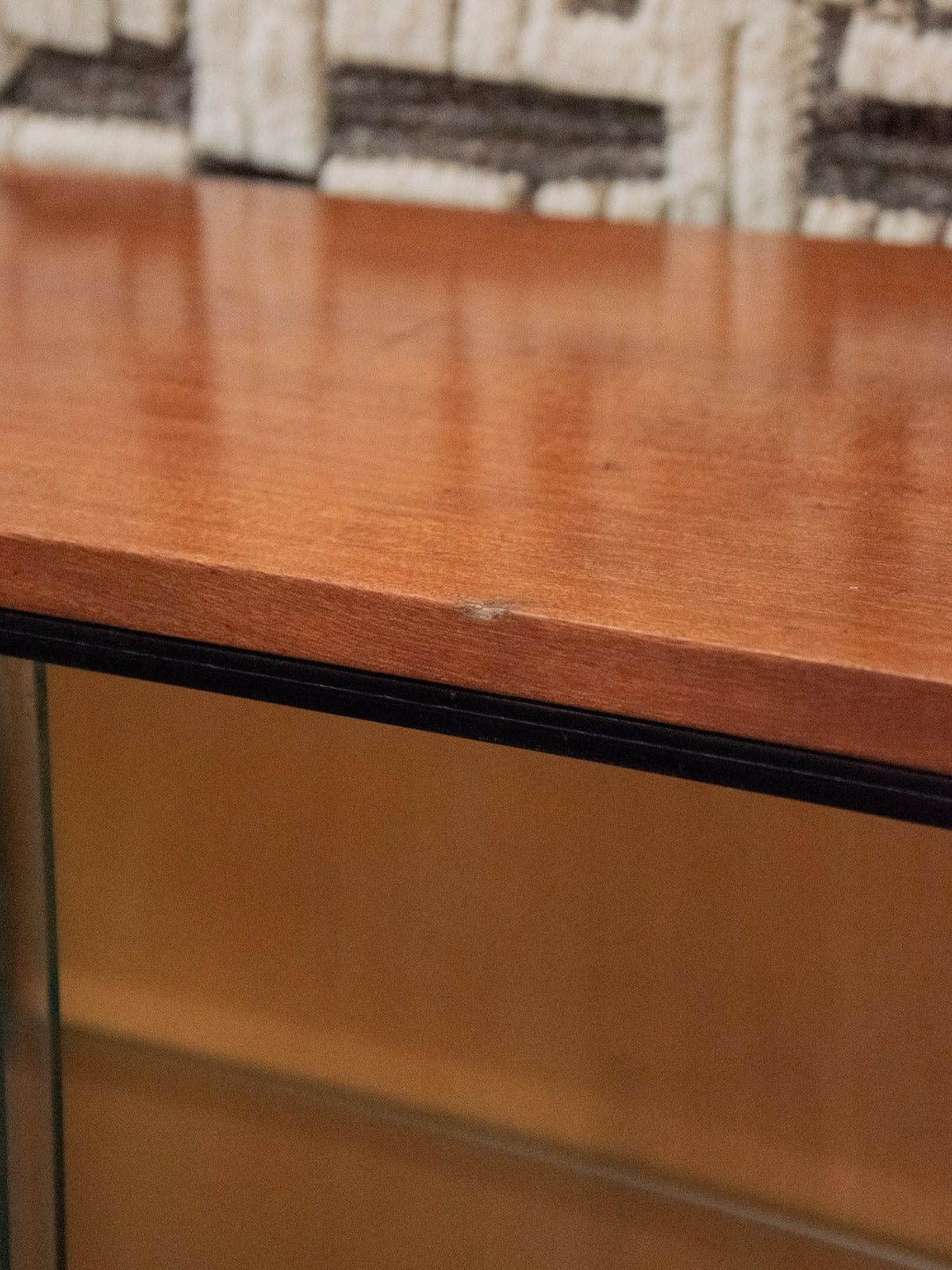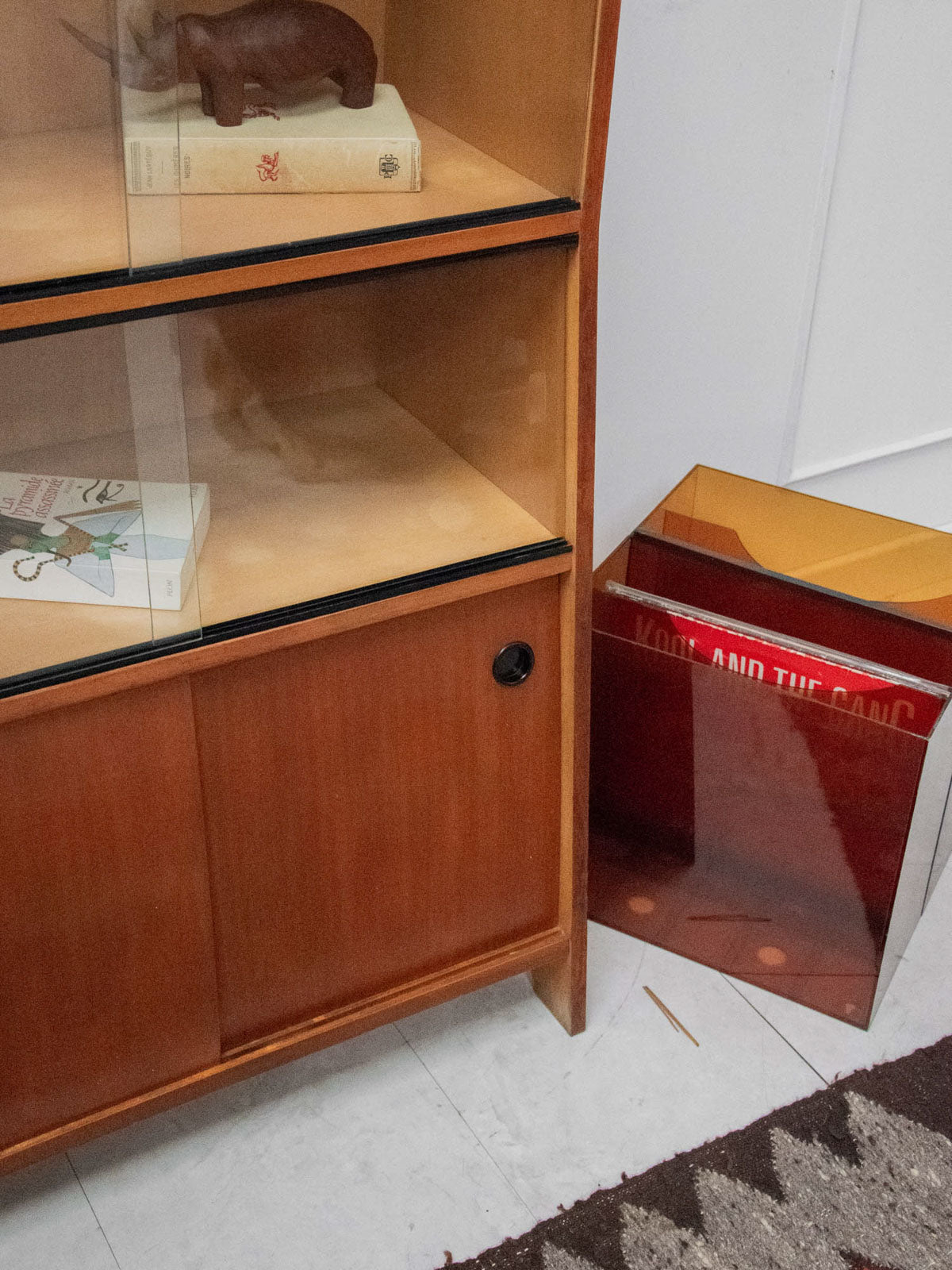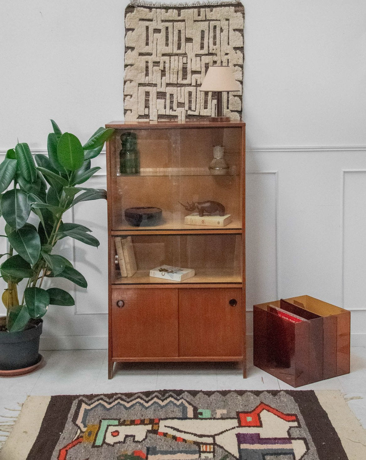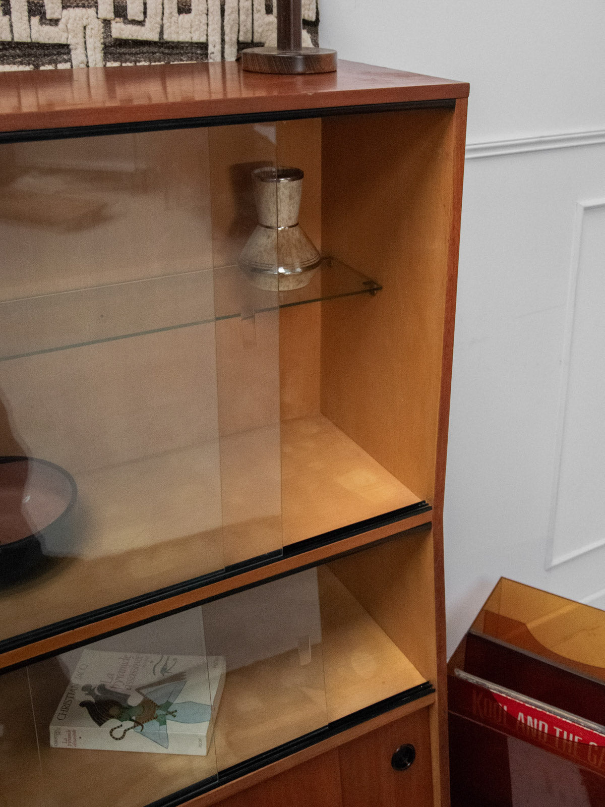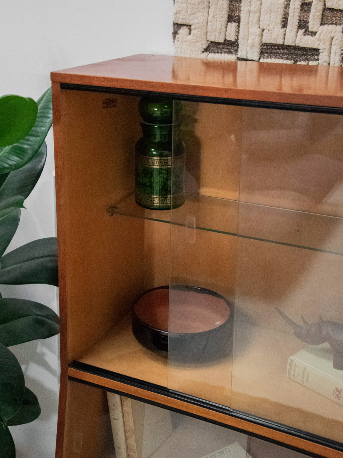 Ajoutez une touche vintage à votre intérieur avec ce meuble de rangement haut vitré rénové des années 60. Fabriqué en bois vernis, il offre trois niveaux spacieux, dont deux avec des portes vitrées élégantes, parfaits pour mettre en valeur vos objets décoratifs. Le dernier niveau est doté de portes coulissantes en bois, alliant praticité et style. Bien que quelques marques d'usure soient visibles, elles témoignent du charme authentique de ce meuble au caractère unique.