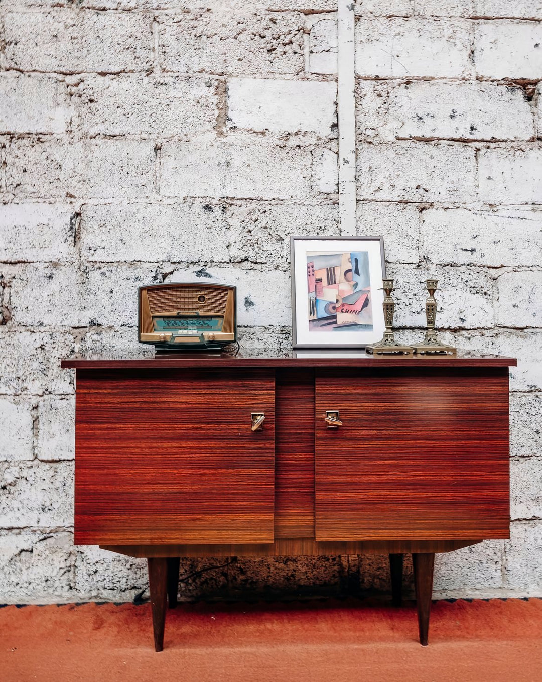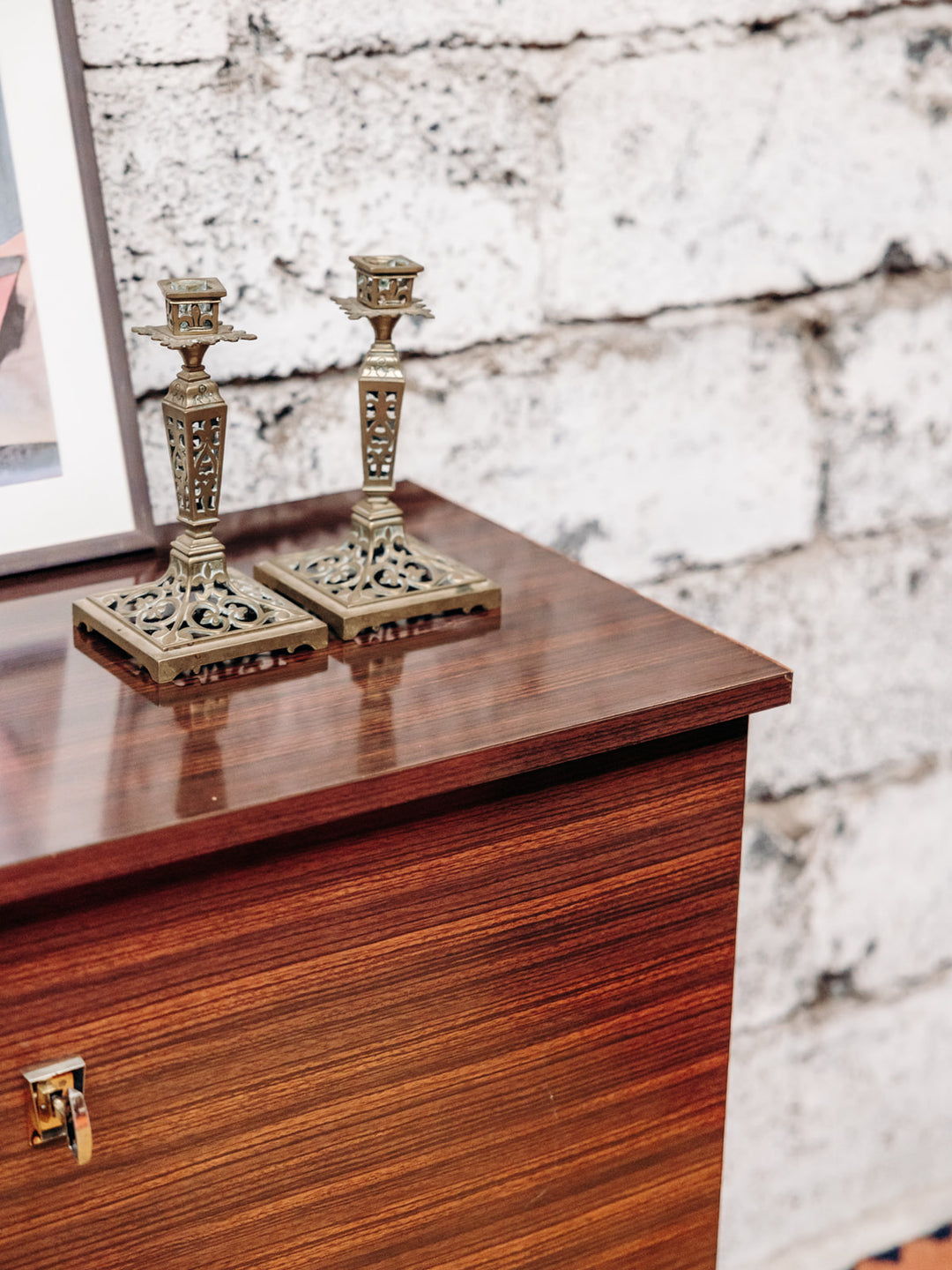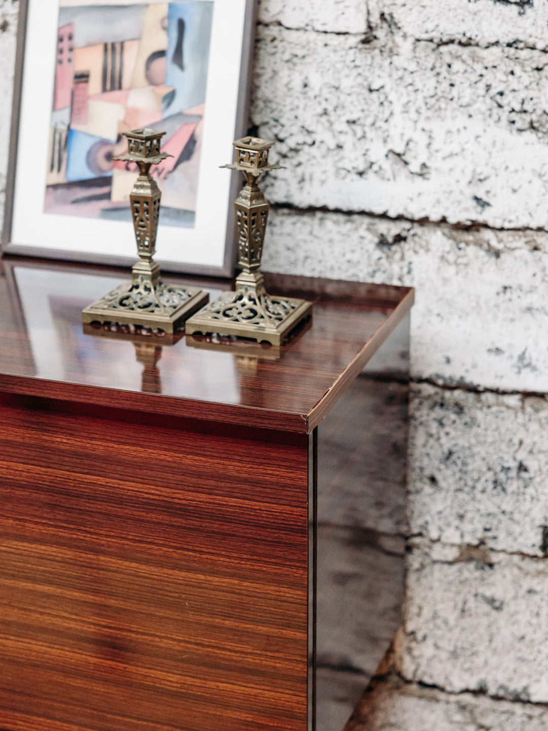 Discover this beautiful wooden sideboard with an elegant rosewood effect, combining practicality and aesthetics. Equipped with four 29 cm pencil-shaped spindle legs, it brings a retro touch to your interior. Its two doors with brass keys and handles add a sophisticated touch, while a 24 cm deep shelf provides functional storage space. A perfect choice for combining style and functionality in your decor.