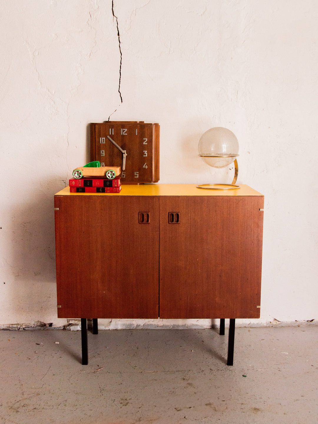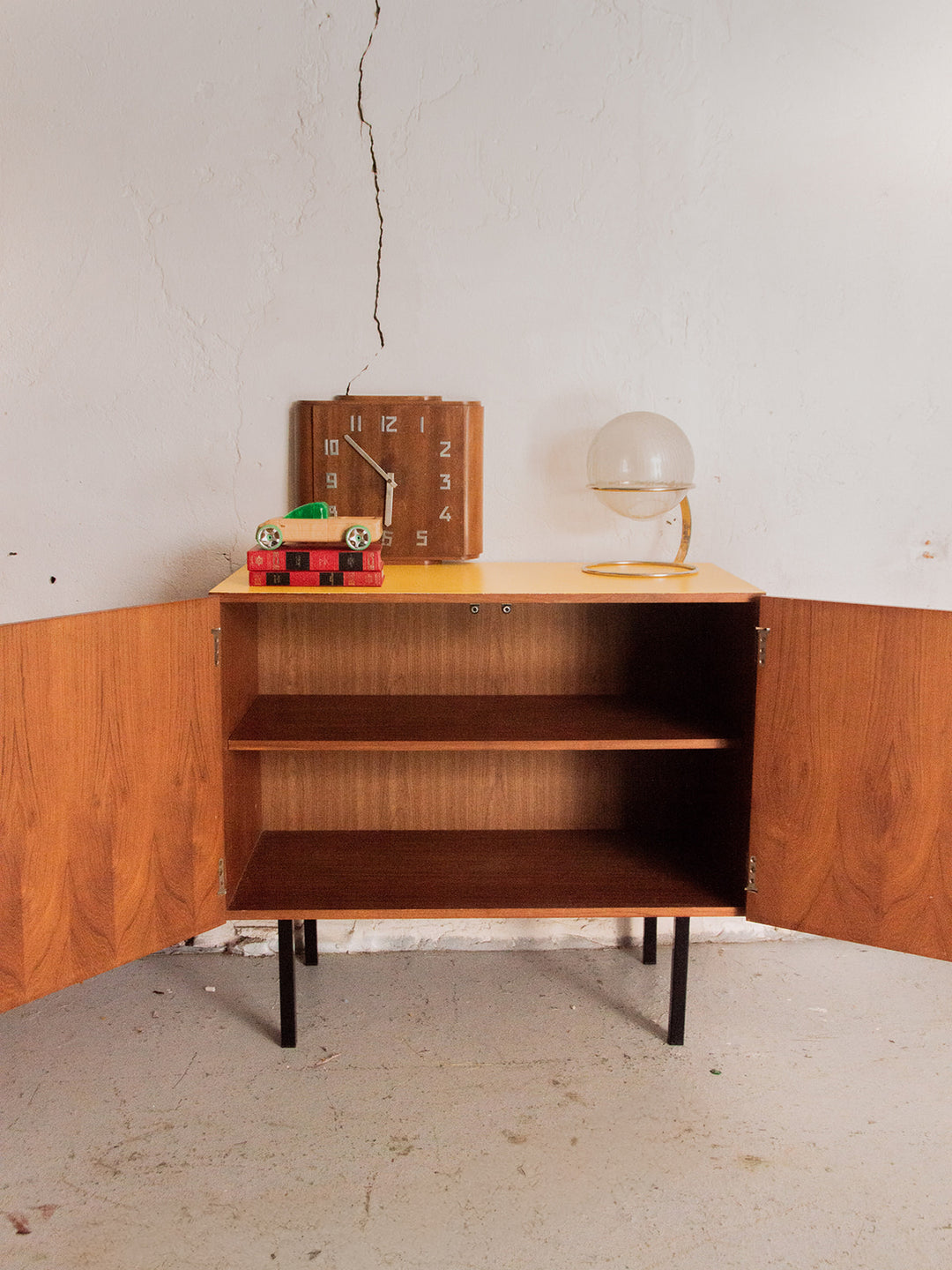 Discover this wooden sideboard with its sleek Scandinavian design, perfect for adding a touch of modernity to your home. Featuring two spacious doors and a removable yellow shelf, it offers both on-trend style and great functionality. Its yellow top, paired with sleek black legs, creates a subtle yet dynamic contrast for a refined look. Ideal for organizing your items while adding a pop of color to your space.
