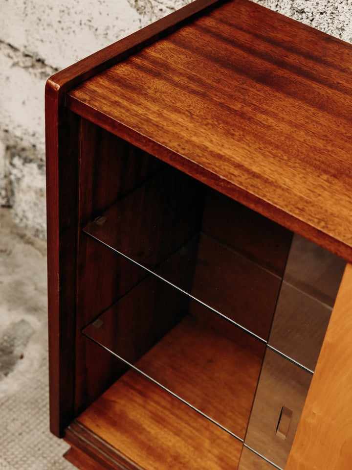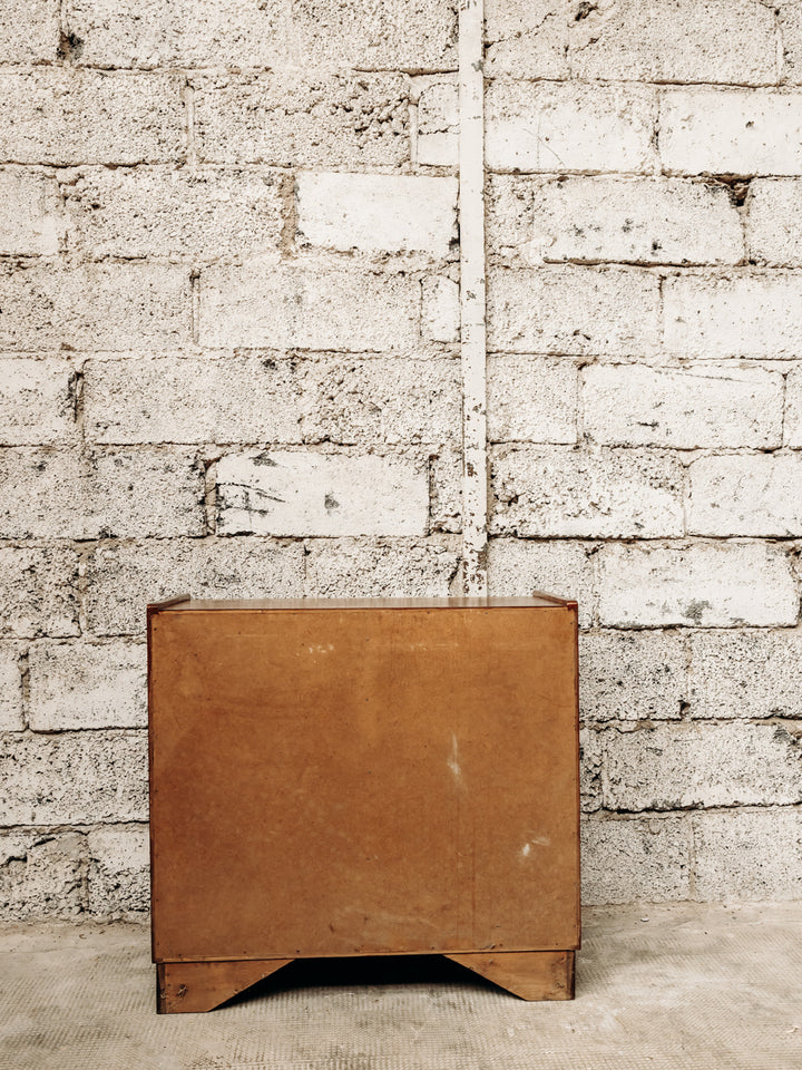 Discover this 1950s storage unit, combining vintage charm and functionality. Its dark wood aesthetic is enhanced by a glass door adorned with an elegant wooden compass rose, while the lighter cabinet door creates a refined contrast. The small feet add a delicate touch, making this unit a real asset to your home. Ideal for organizing your belongings while adding character to your decor.