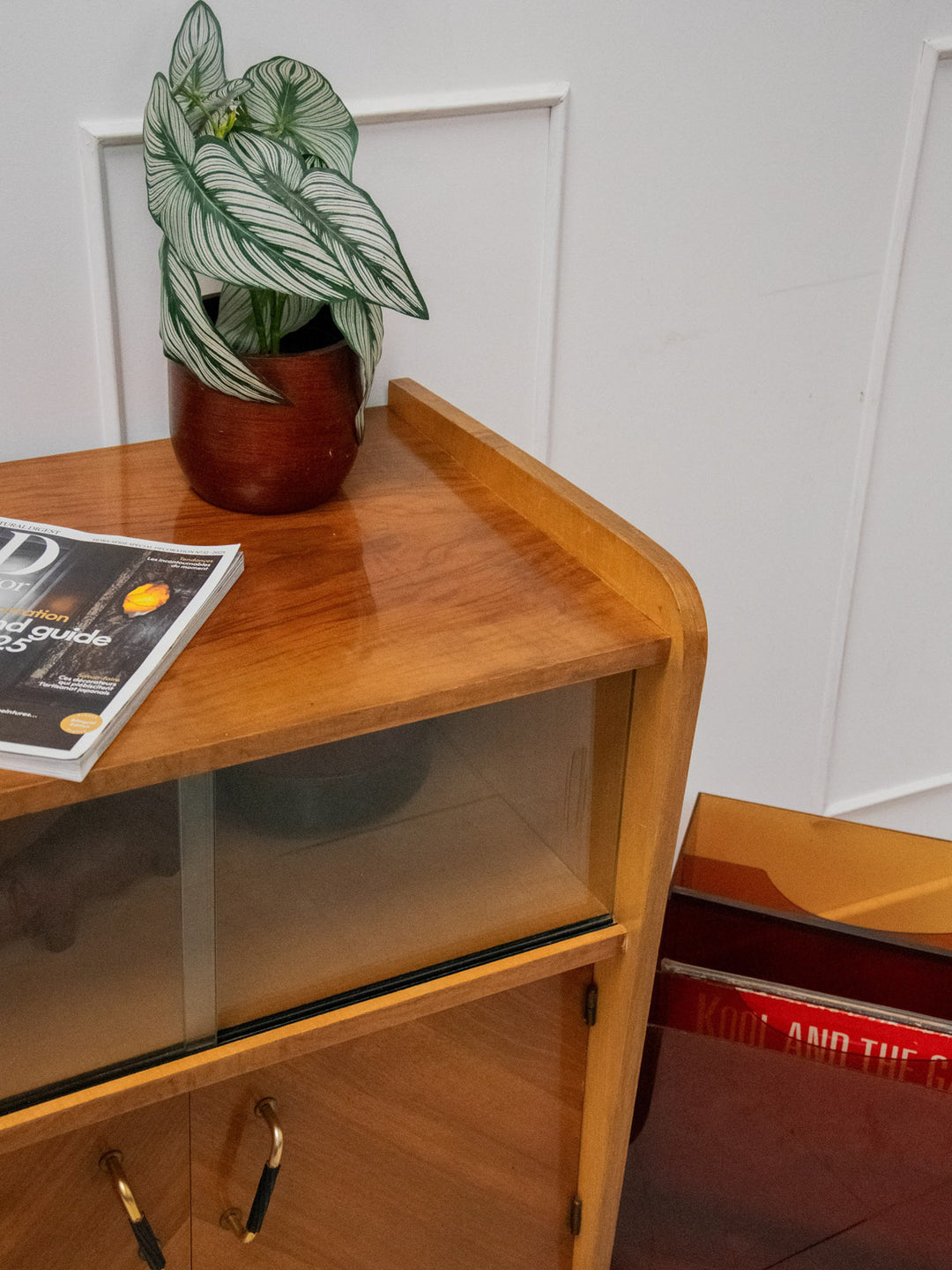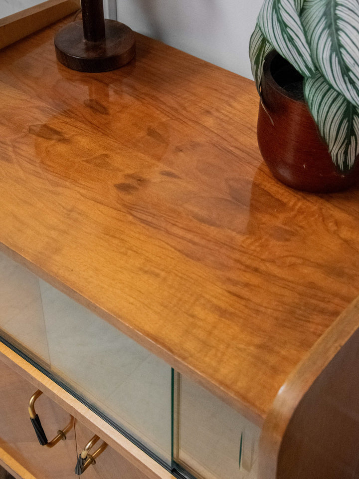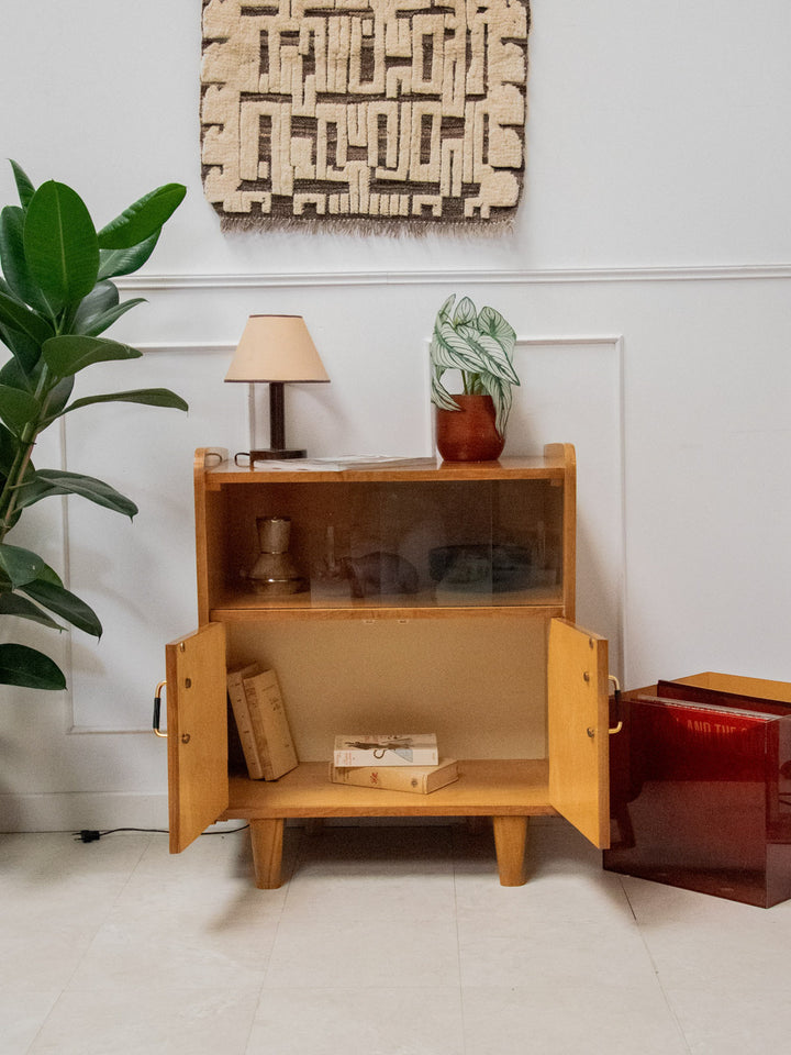 Discover this charming little wooden sideboard from the 50s and 60s, which will bring a vintage touch to your interior. Composed of two parts, it features an elegant glass section to showcase your decorative objects, as well as two wooden doors adorned with brass handles. Ideal as an occasional piece, its timeless design and functionality make it a unique piece that fits perfectly into all styles of decoration. A must-have for lovers of retro furniture!
