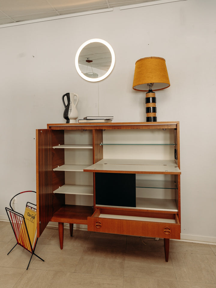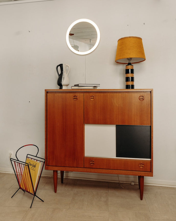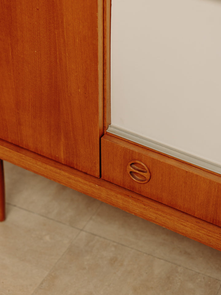 Discover this magnificent two-tone Scandinavian sideboard from the 60s and 70s, in teak veneer. With its interchangeable PVC fronts (one white, one black, and one yellow), it adapts to all your desires and all interiors. Enjoy its various storage spaces while adding a vintage touch to your decor. Note that it has a slight dent on the glass shelf and a defect on the top, visible in the photos, but this in no way alters its charm and authenticity.