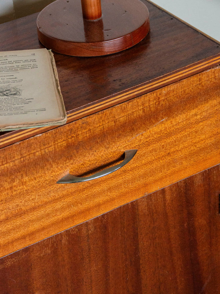 Discover this charming little sideboard from the 1960s, made of light and dark varnished plywood. Its elegant design and very shallow depth make it an ideal piece of furniture for optimizing space while adding a retro touch to your interior. In good condition, this piece of furniture combines functionality and aesthetics, perfect for storing your essentials in style. Don't miss this vintage piece, ideal for lovers of Scandinavian decor!