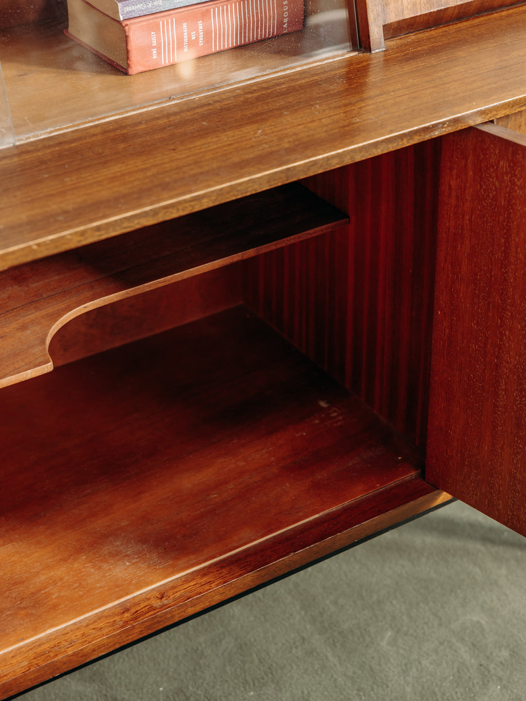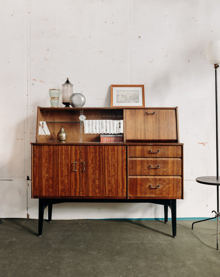 Discover this large Nathan wooden sideboard, a sleek piece of furniture that combines functionality and elegance. Featuring glass cupboards, spacious drawers, and a drop-down compartment, it offers optimal storage space while showcasing your decorative items. Its high shelf adds a practical touch, while its metal legs bring a contemporary touch to your interior. Ideal for a living room or dining room, this sideboard will stylishly enhance your decor.