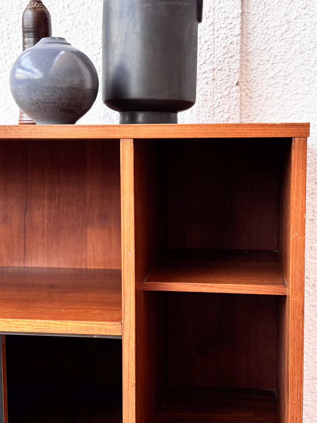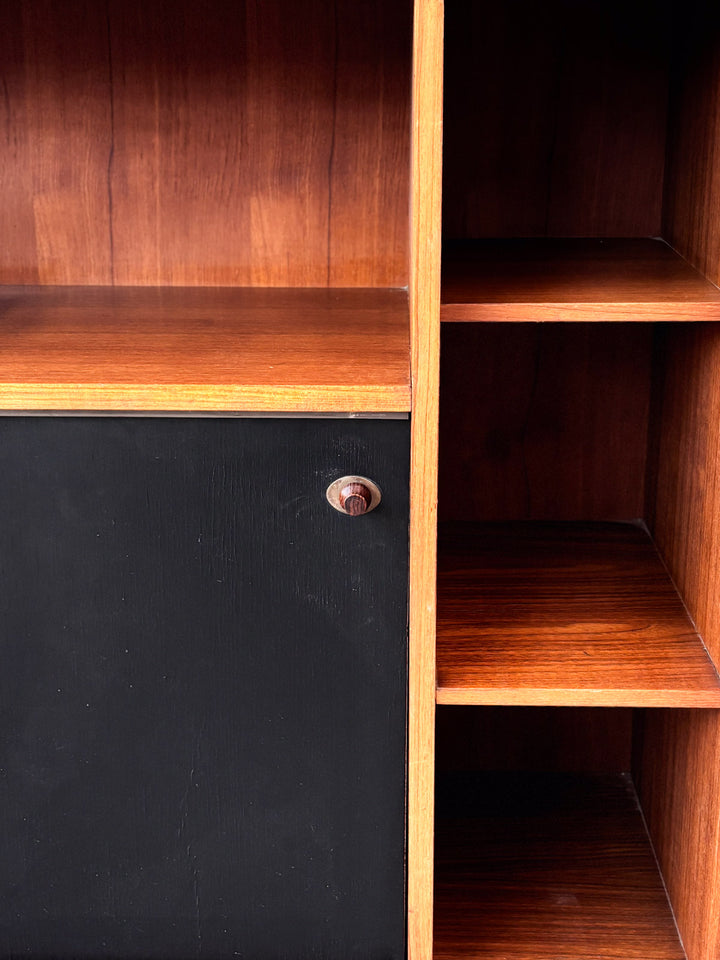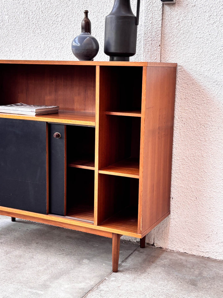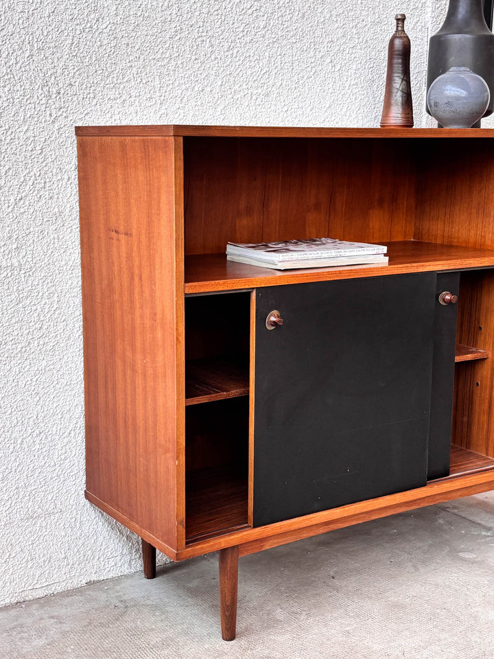 Discover this magnificent Italian teak cabinet, combining elegance and functionality. With its two clever sliding doors, three spacious niches, and a shelf, it blends perfectly into your home while providing valuable storage space. Its sturdy wooden legs and wooden handles add a warm, authentic touch. An ideal choice for combining style and practicality in your decor. A few signs of wear do not detract from its charm or usability.