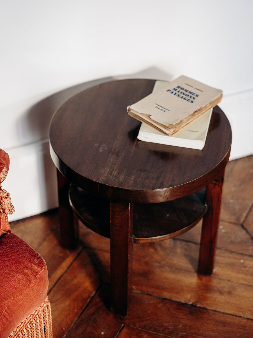Add a practical and elegant touch to your interior with this round dark wood side table. Featuring two shelves, it offers additional storage space while being ideal for small spaces. Its timeless design adapts to all styles of decoration. Please note that some traces of use are visible on the upper shelf, detailed in the photos.