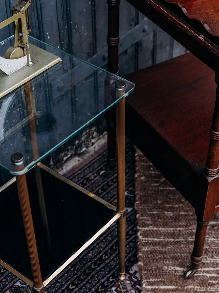 Bring a touch of elegance to your home with this glass and brass side table. Featuring two tops, one in clear glass and the other in black tinted glass, it combines modernity and refinement. Its compact dimensions make it an ideal addition to any space, while adding a stylish touch to your decor. A perfect choice to enhance your home.
