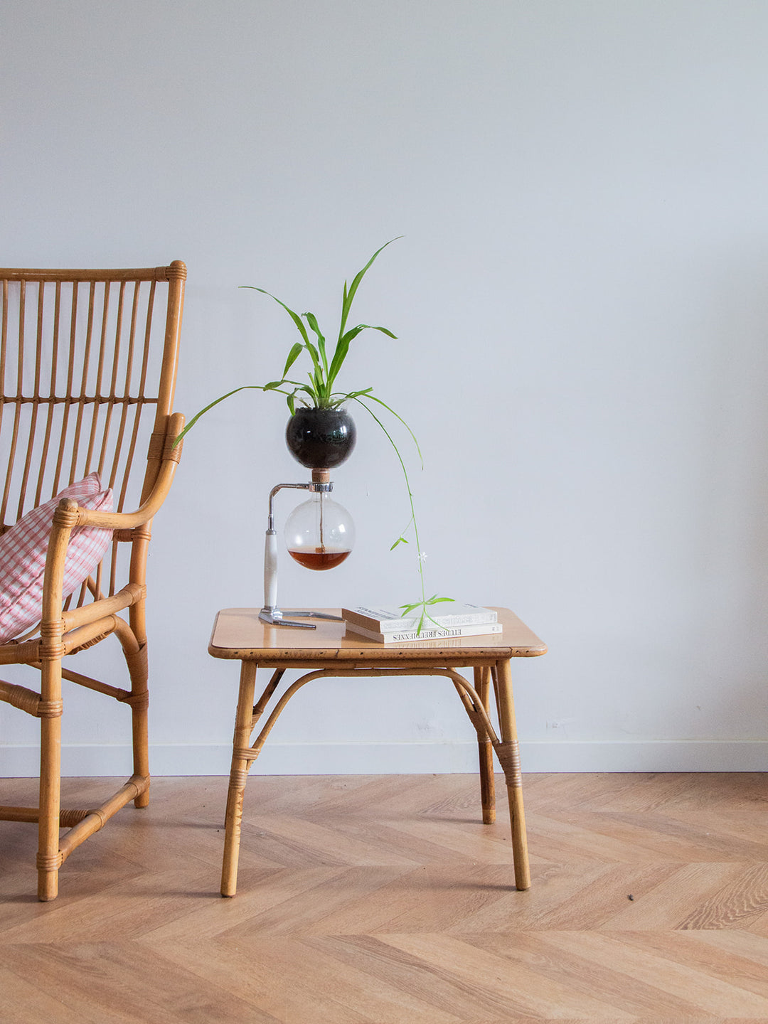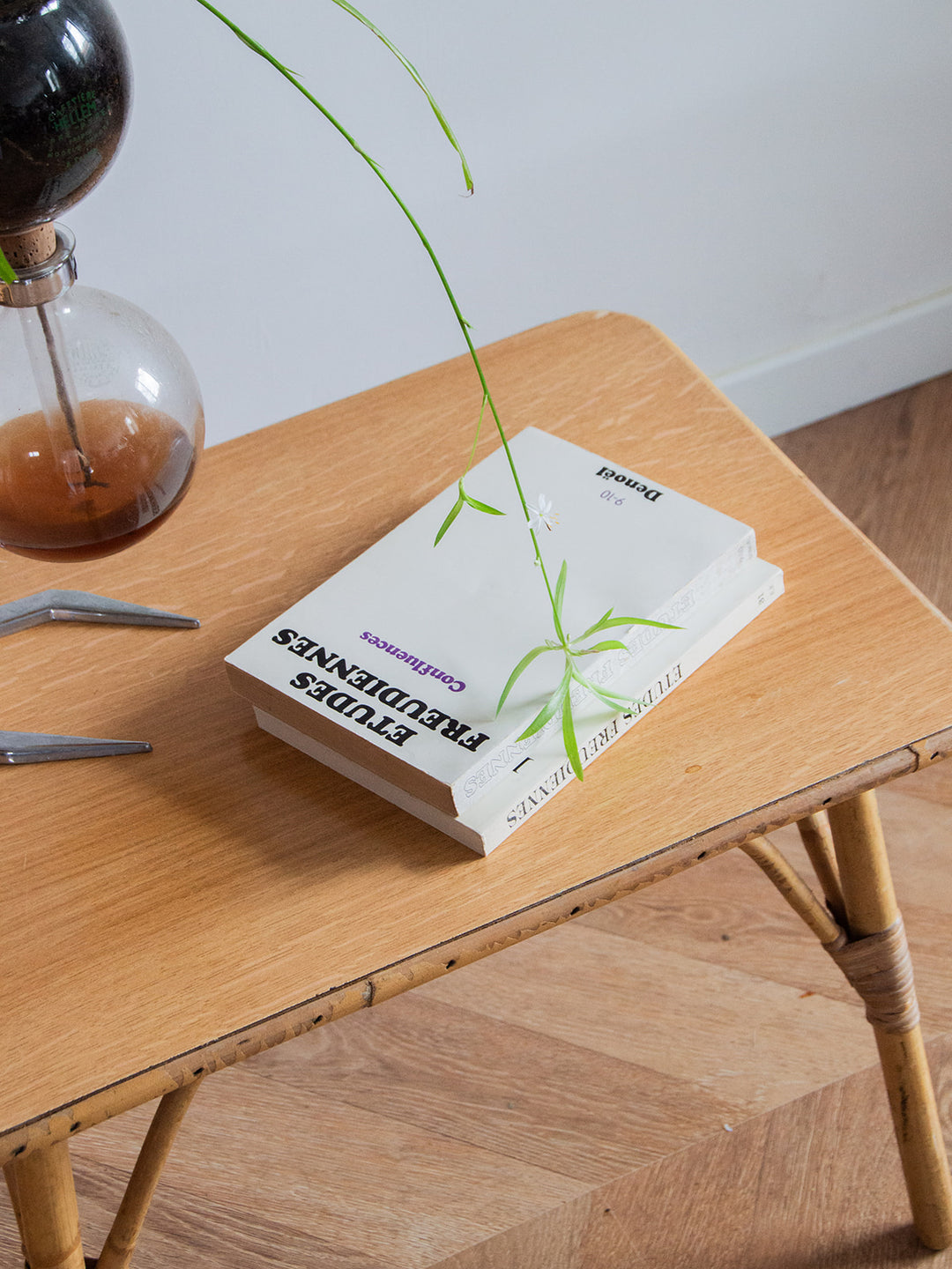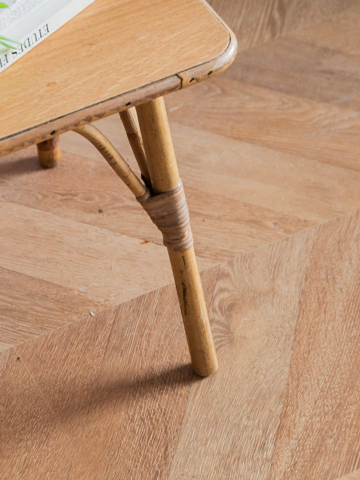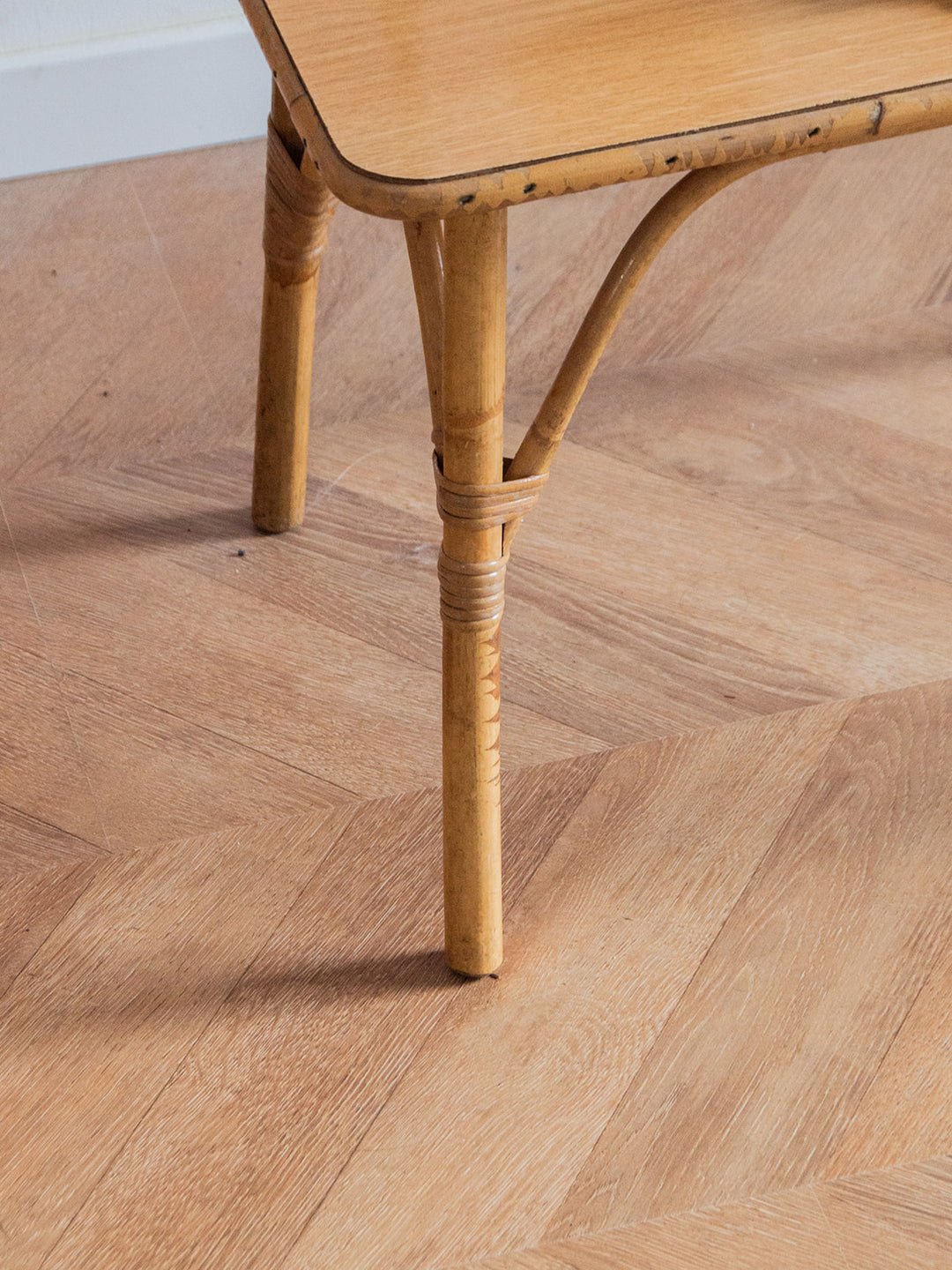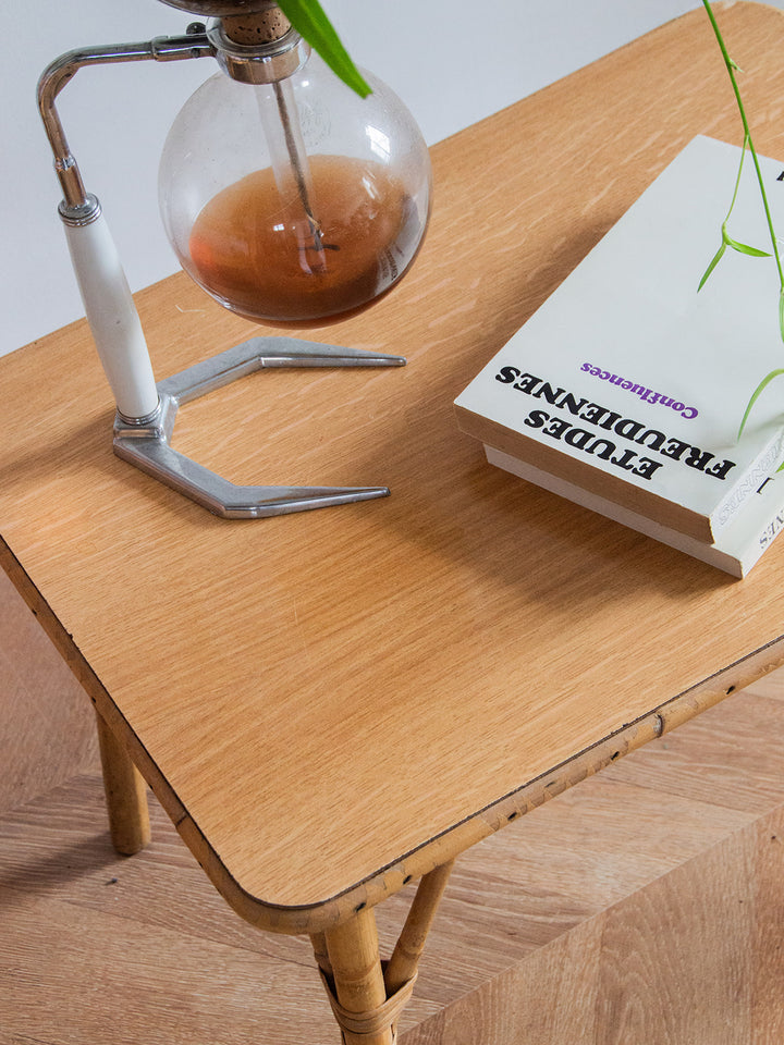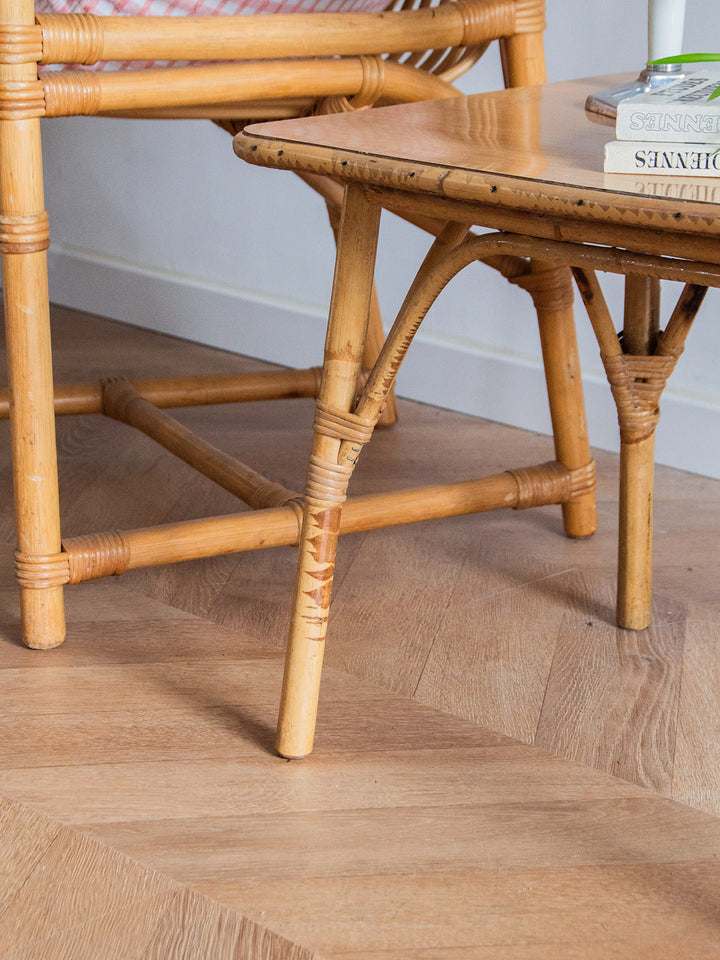 Discover our small rattan coffee table with its timeless charm. Its slightly flared legs give it an elegant look, while its smooth, glossy top brings a modern touch to your interior. Although it shows signs of wear, these imperfections tell a story and add character to this piece. Ideal for complementing your decor while remaining practical, this coffee table will blend harmoniously into your living space.
