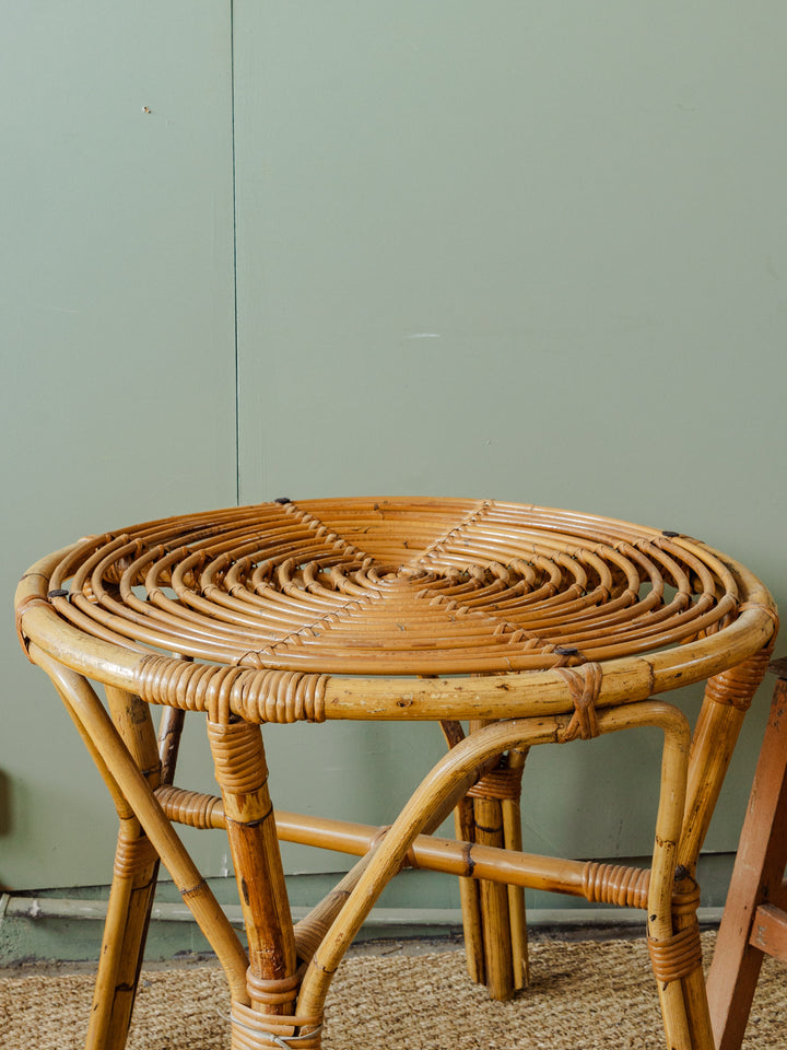 Bring a retro touch to your decor with this vintage rattan table, perfect for small spaces. It fits easily into your living room or on your patio. Its tabletop provides a practical surface for your drinks or favorite books. A must-have for lovers of authentic and warm style.
