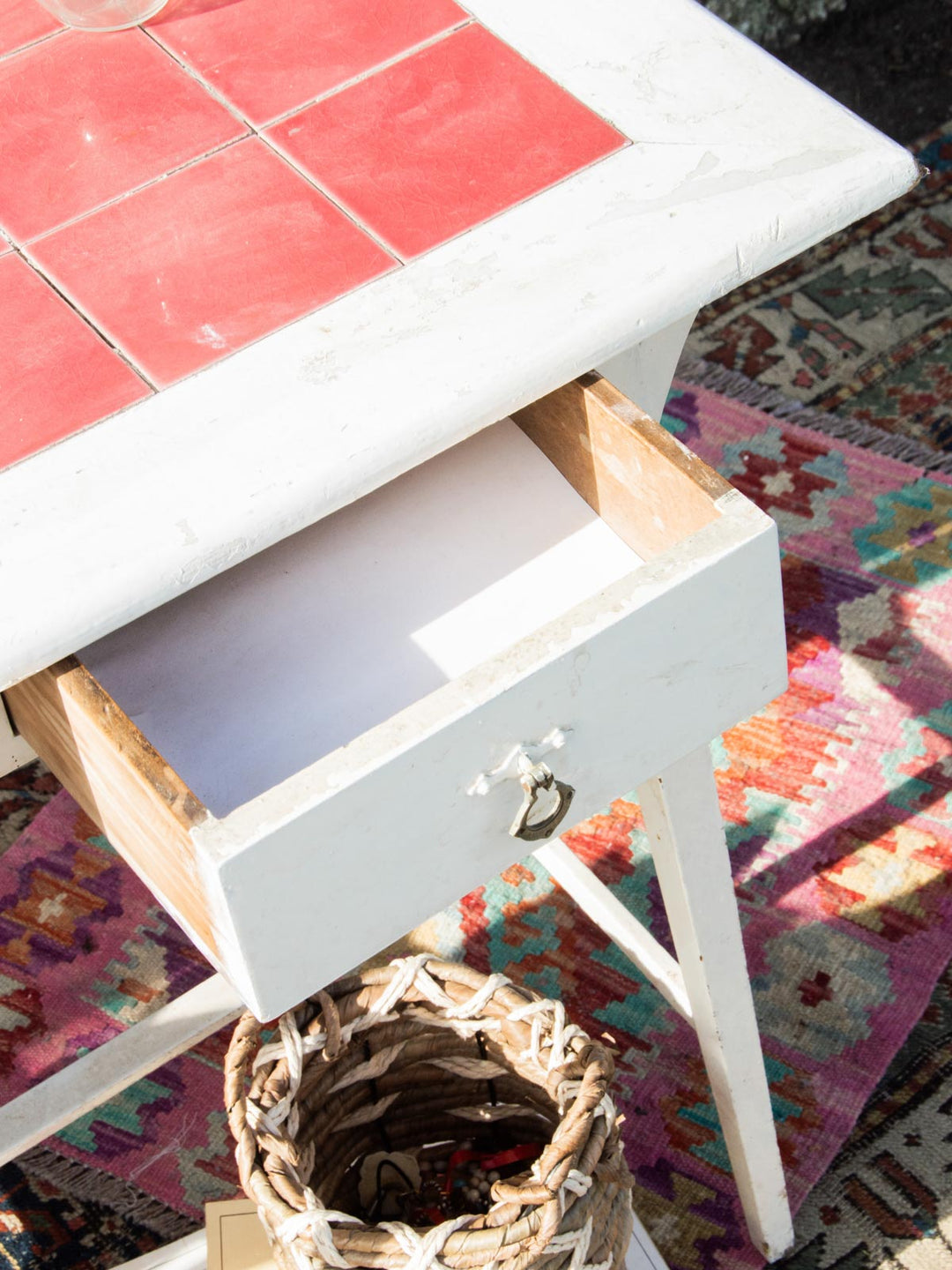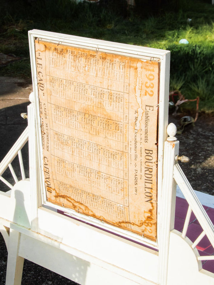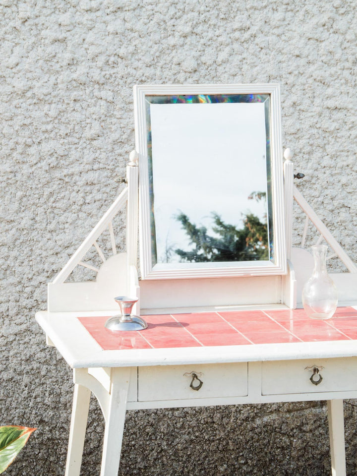 Discover this charming, sleek, white wooden vanity table, perfect for small spaces. Its pink earthenware top adds a delicate, retro touch. The removable mirror conceals an old newspaper, a poetic nod to its history. A unique piece for a bedroom or beauty corner. It combines practicality and originality with a touch of softness.
