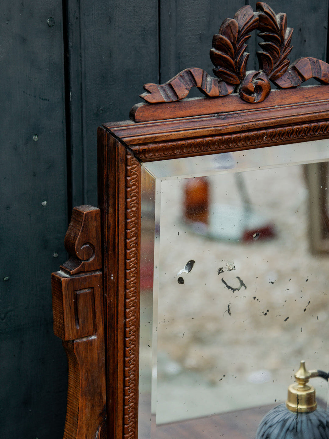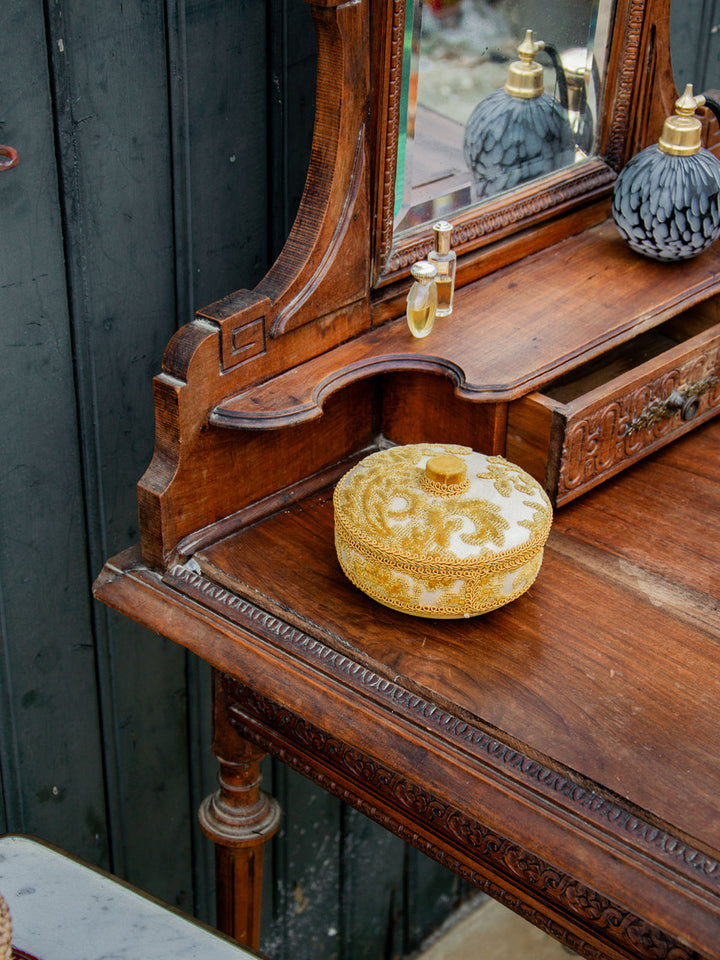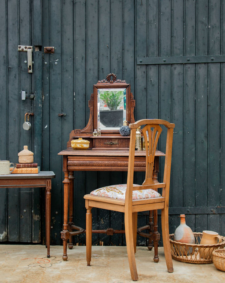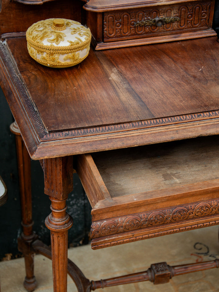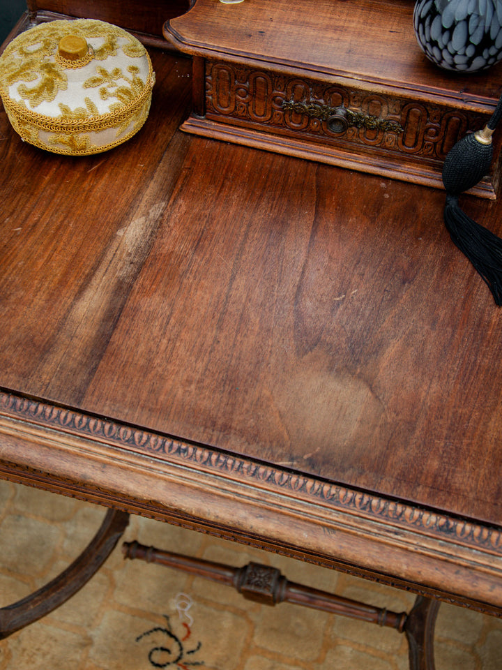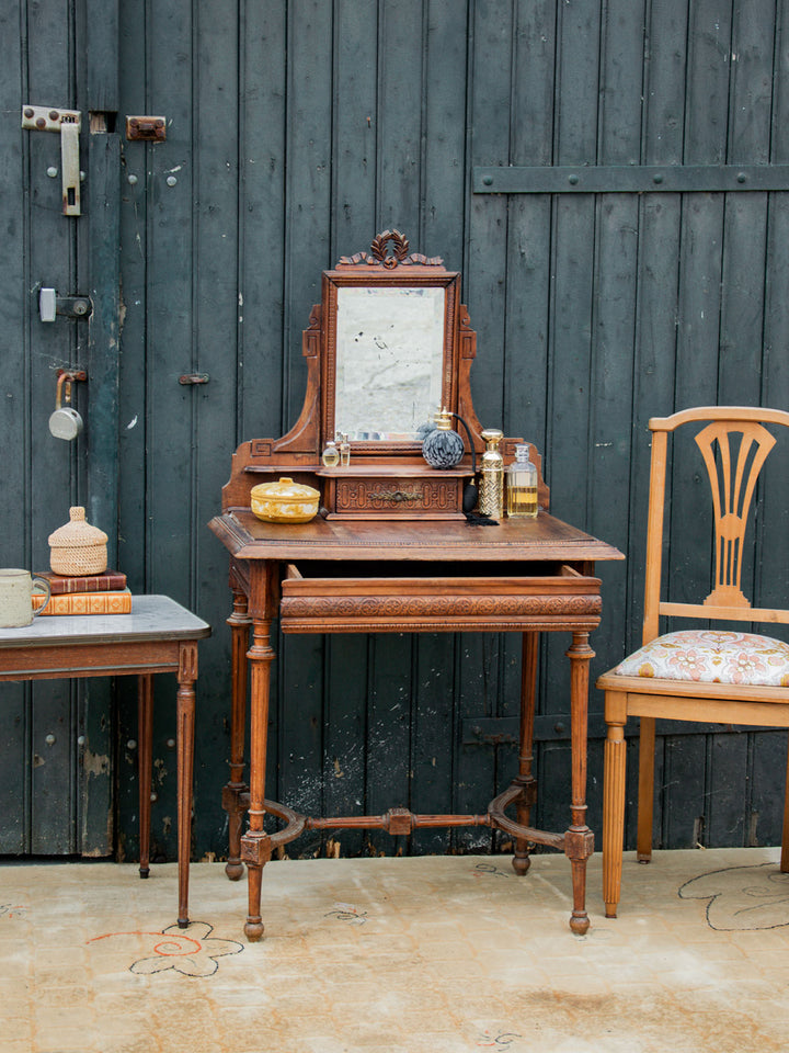 Discover this elegant wooden dressing table with refined carved patterns and timeless charm. It features a built-in swivel mirror, marked by some signs of use that do not detract from its appearance. Practical with a large central drawer and a small side drawer for your accessories. Its finely crafted legs give it a beautiful presence. A piece of furniture that is as functional as it is decorative.