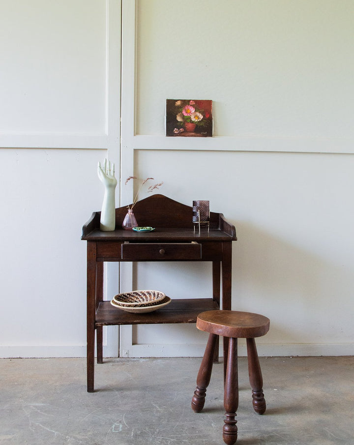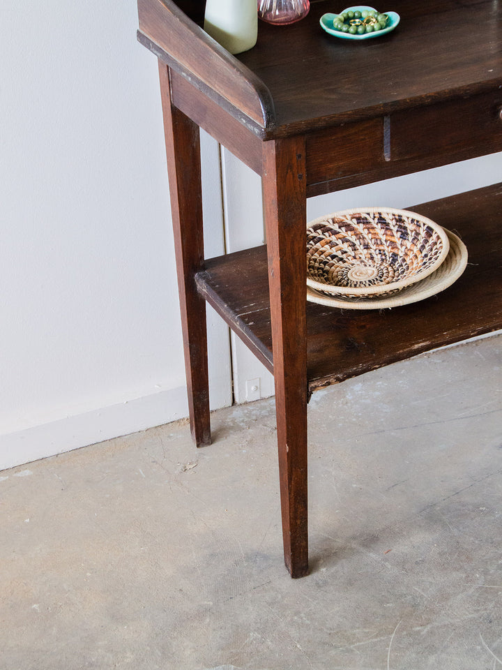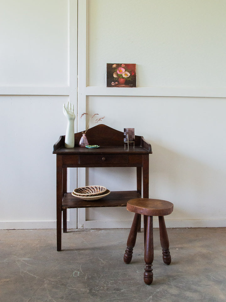 Discover our dark wood dressing table, combining elegance and functionality. With its beautiful rounded design, it blends perfectly into your home. Featuring a practical drawer with a metal knob, it's ideal for storing your accessories while adding a touch of sophistication to your decor. Create a harmonious and elegant beauty space with this must-have piece.