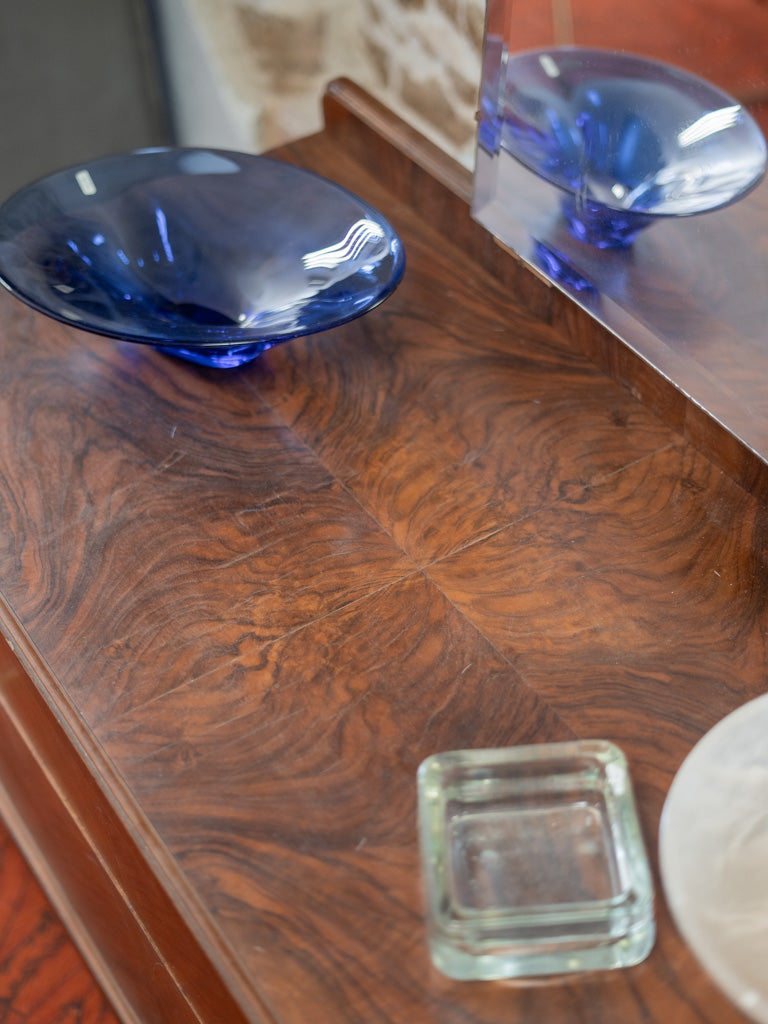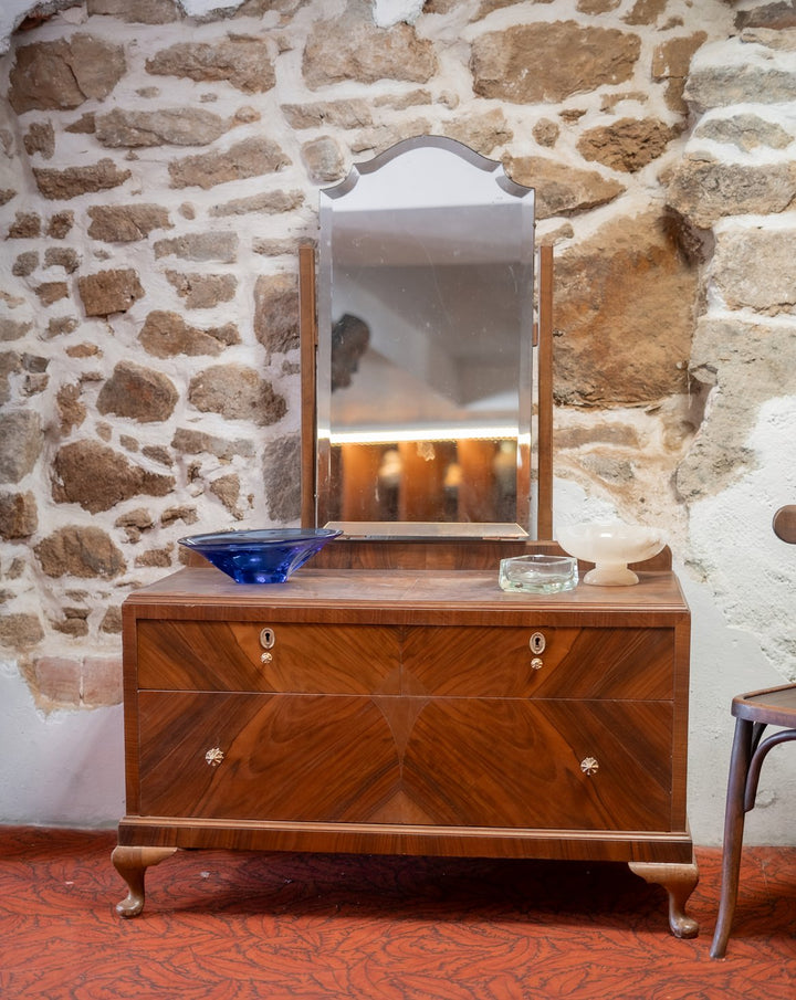 The term "dressing table" appeared at the beginning of the 20th century, while the piece of furniture has existed since Antiquity. Composed of a shelf, one or more mirrors and numerous drawers, the dressing table is a storage piece, but above all a place of preparation where one applies makeup, perfumes and does one's hair. If originally, this furniture corresponds to both men and women, it very quickly became the embodiment of feminine mystery. The dressing table can indeed be equipped with secret hiding places, in order to receive intimate correspondence. Today, the dressing table is back in the spotlight and works very well in all styles of interiors!