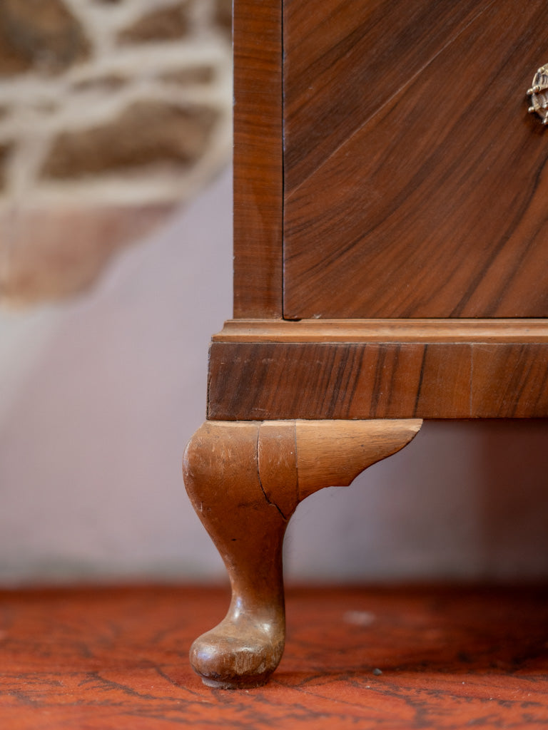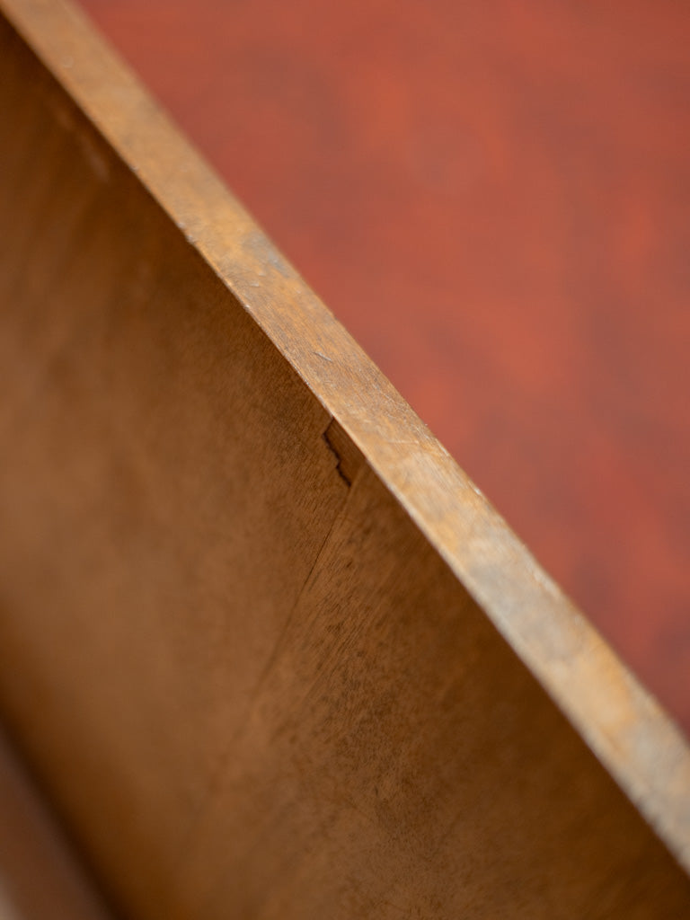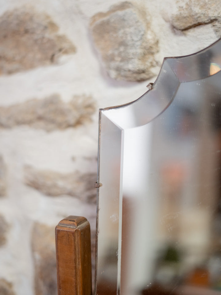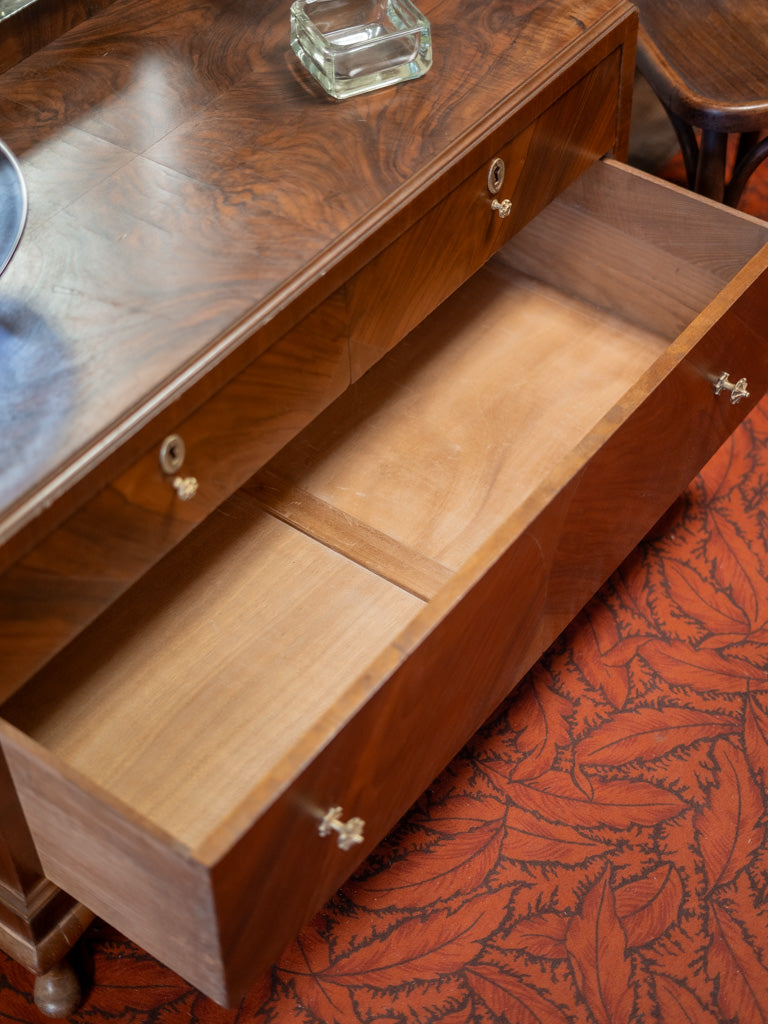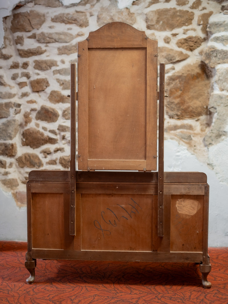 Discover this elegant antique dressing table, dating from the early 20th century, which will bring a touch of authenticity to your interior. Crafted from wood with a magnificent pivoting beveled mirror, it features delicate gold handles and offers practical storage space with two small drawers and one large drawer. These few traces of time add to the charm and history of this unique Italian model. A piece of furniture that combines functionality and vintage style for lovers of exceptional objects.