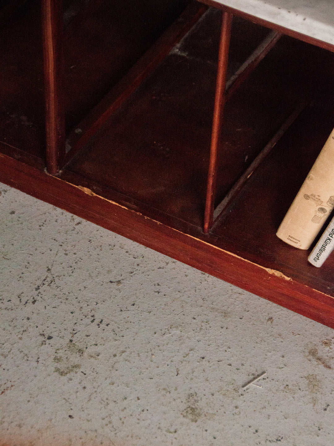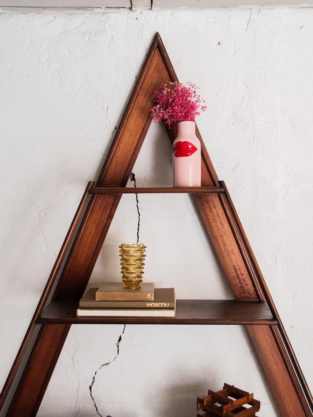 Discover this magnificent bookcase with its original triangular design, perfect for adding character to your home. Made entirely of wood, it stands out thanks to its central marble top, which adds a refined touch. It offers six storage spaces for your books and three shelves for displaying objects or decorations. A few signs of wear and paint stains bear witness to its history. A unique piece combining functionality and aesthetics.