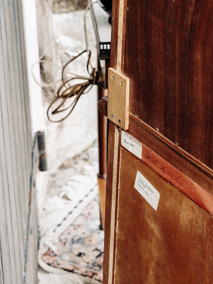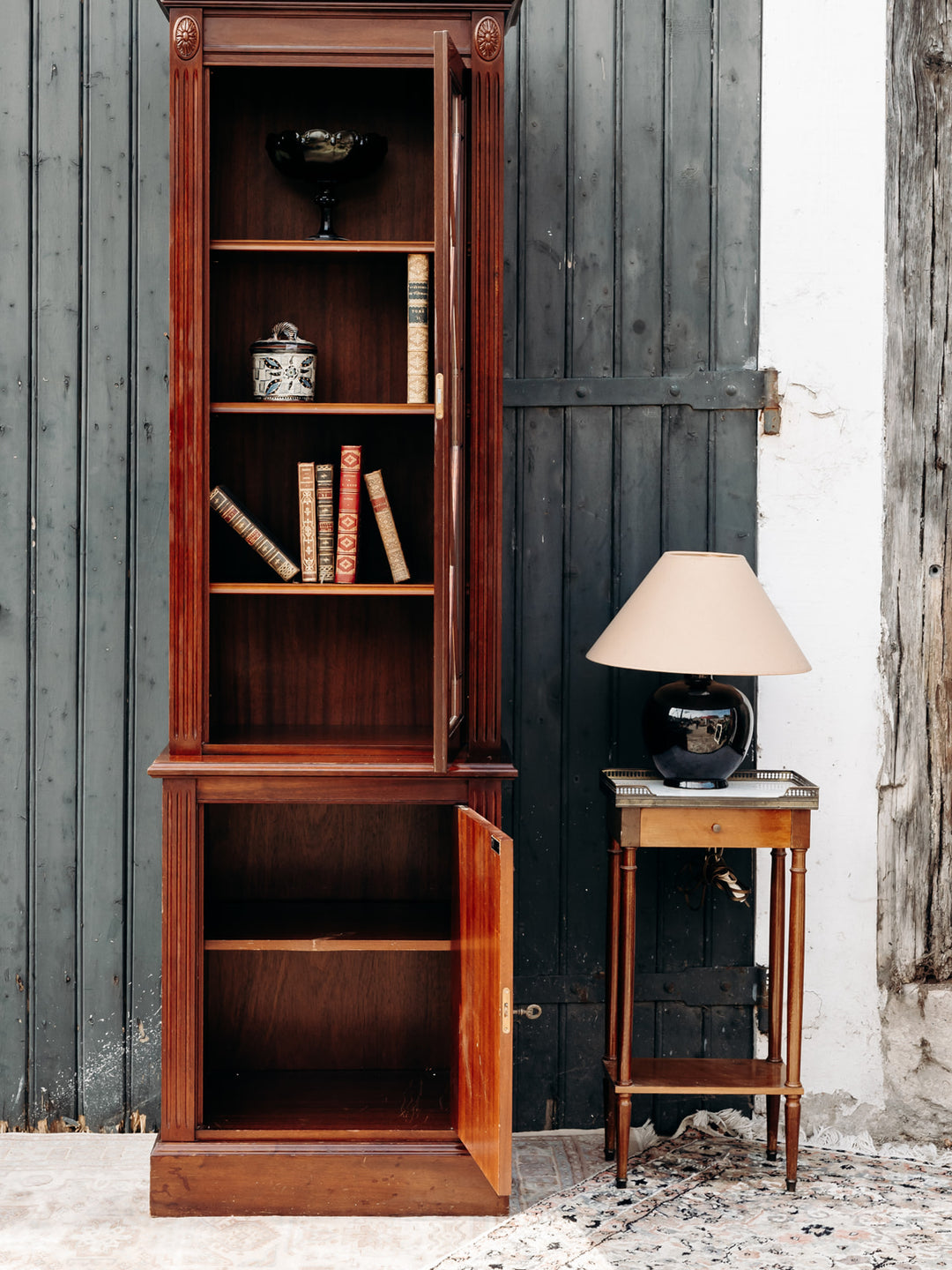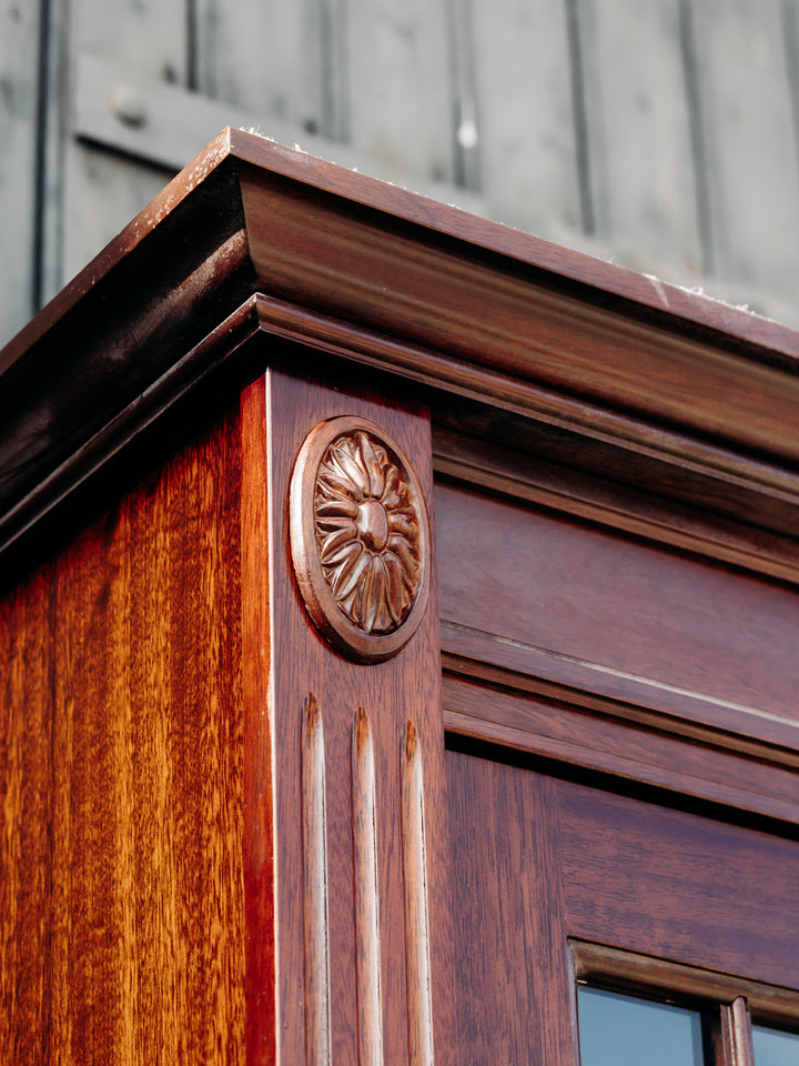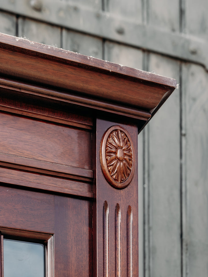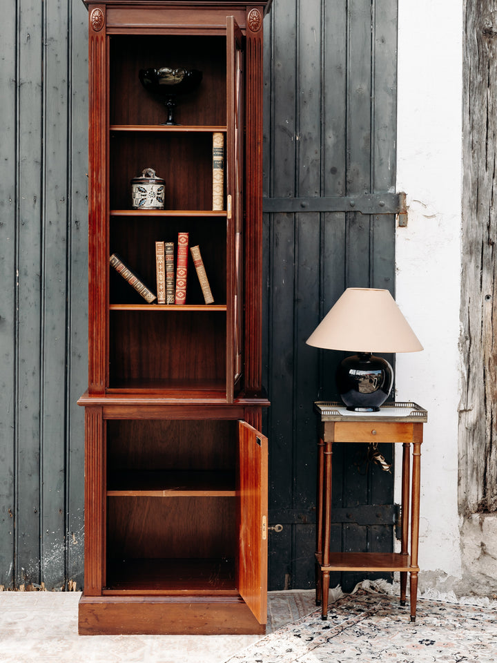 Discover this elegant, tall, slim glass-fronted bookcase, crafted from dark Belgian yew wood. Its refined design features beautiful grain and engraved details, adding a touch of authenticity to your home. Featuring two separate cupboards resting on wooden slats, this removable, screw-free unit is both practical and aesthetically pleasing. A key is included to secure your belongings, while allowing you to display your most beautiful works behind the wooden glass door. Ideal for combining functionality and style in your living room or office.