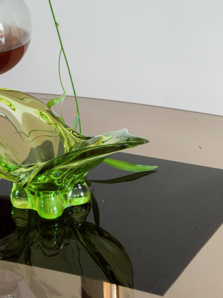 A breath of lightness and color with this green blown glass trinket tray. Its fluid shape and luminous reflections capture the light with elegance, revealing the full richness of its vibrant glass. Placed on a console table, side table, or shelf, it poetically holds keys, jewelry, or everyday treasures. A decorative piece in its own right, blending craftsmanship and design, it brings a touch of freshness and finesse to your home.