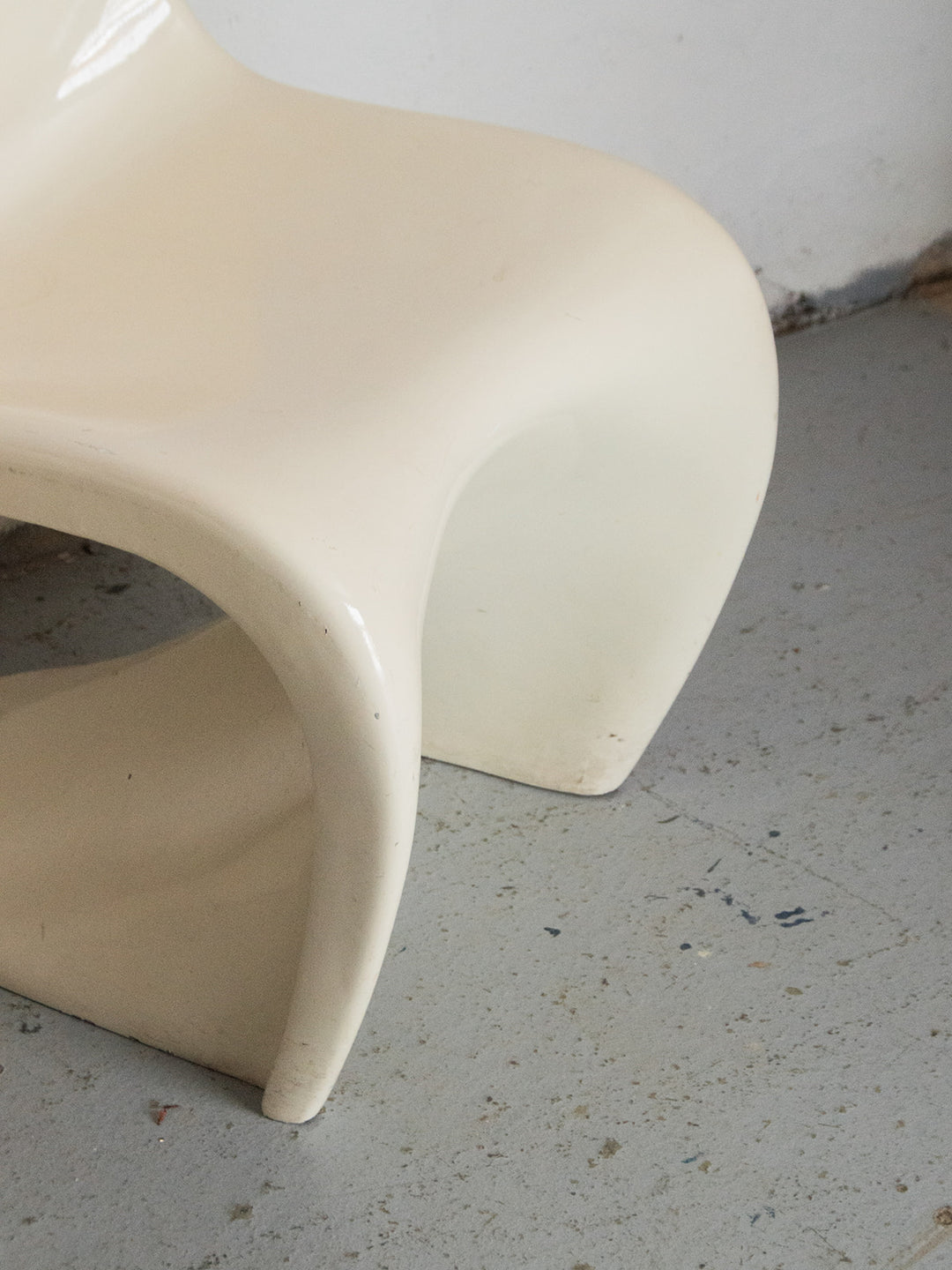 Discover the famous Panton chair, produced for Vitra, a true icon of 1960s design. Its sculptural S-shaped silhouette brings a bold touch to any interior. Made of beige plastic, it blends easily into understated or contemporary decor. A few signs of wear and a slightly damaged plastic attest to its authenticity. A cult piece to adopt for design lovers. Sold individually, three quantities are available!