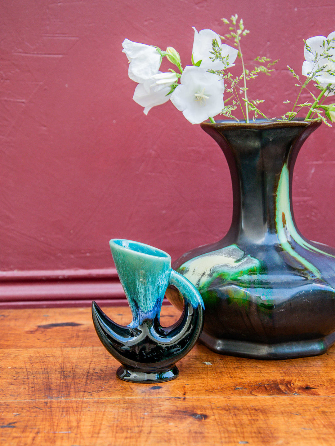 Rare item alert! Add a retro touch to your home with this mini blue and black vintage earthenware vase from the 1960s. Its Fat Lava-style design, recognizable by its unique textures and vibrant colors, makes it a decorative object in its own right. Perfect for showcasing your small flowers or displaying it on its own, this compact vase brings an authentic and characterful touch to your decor.