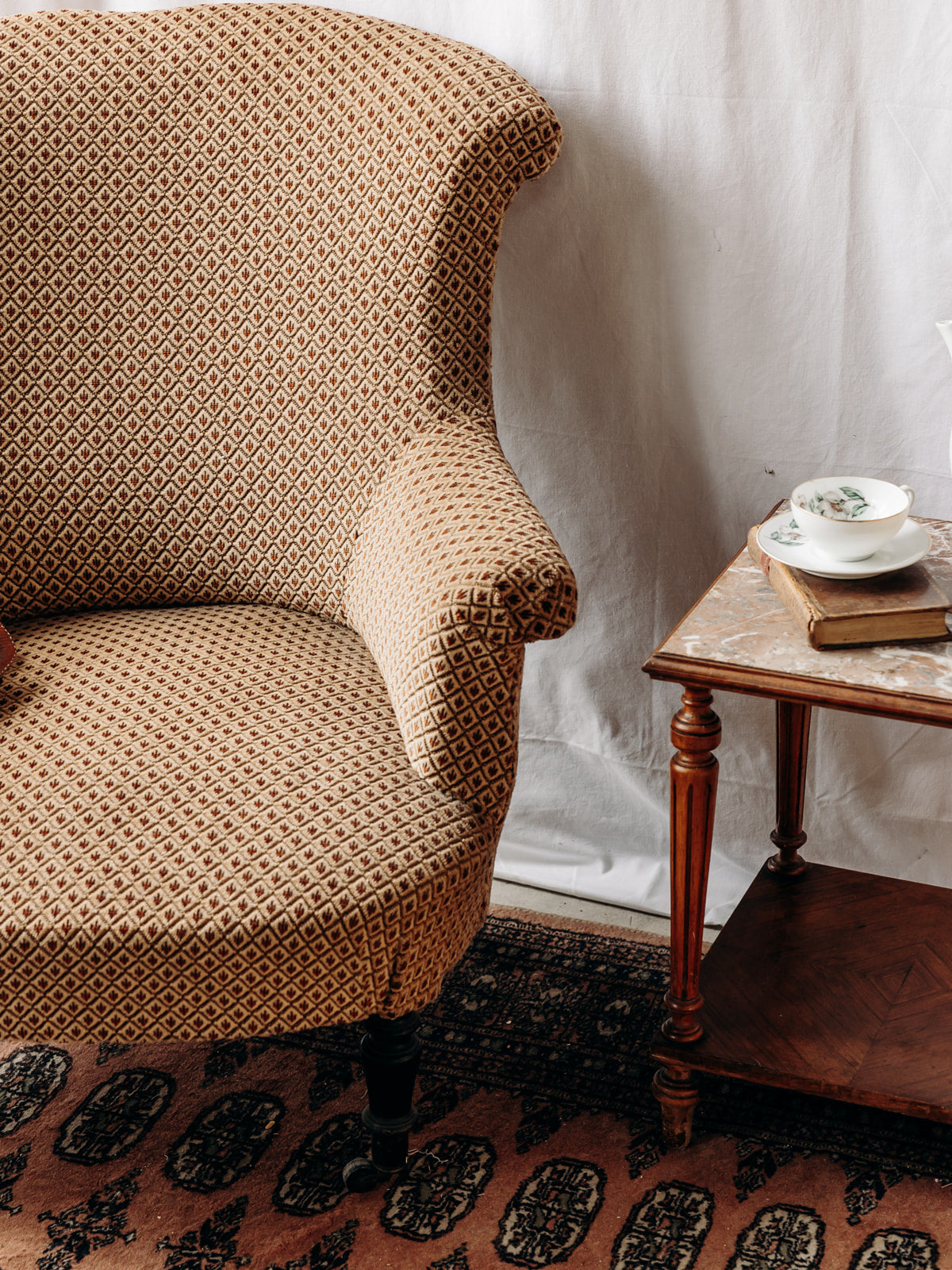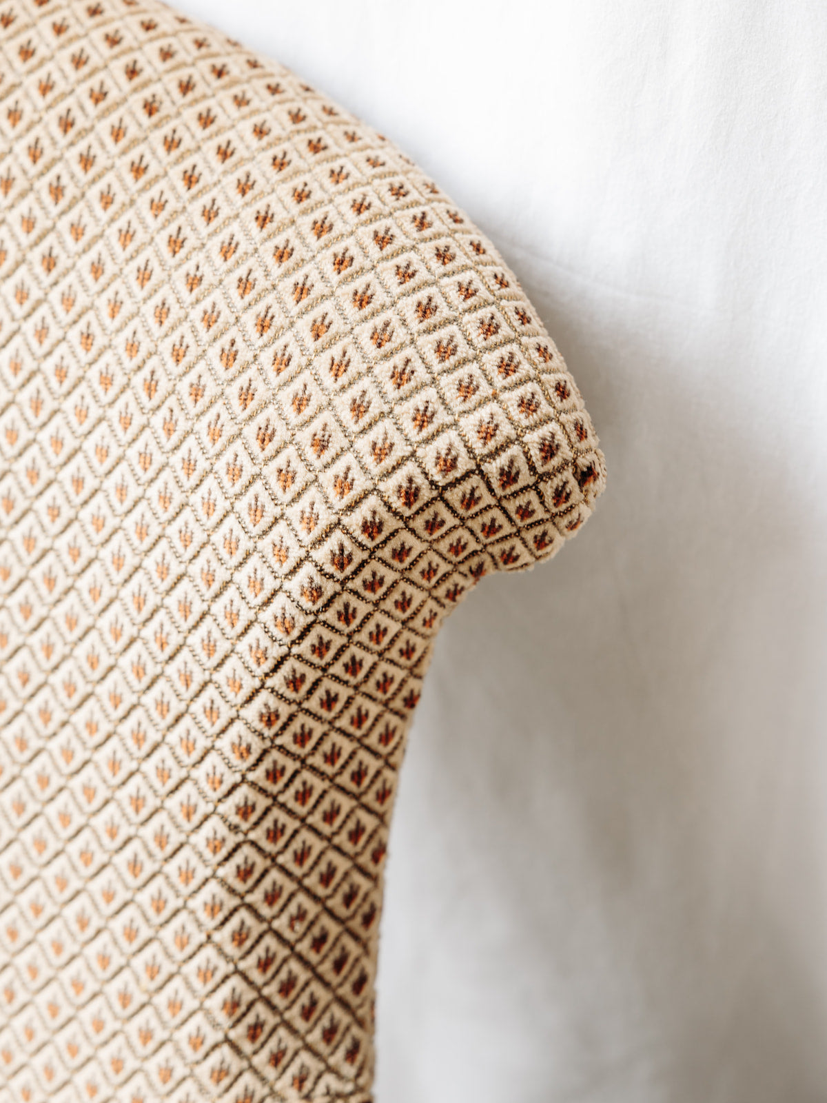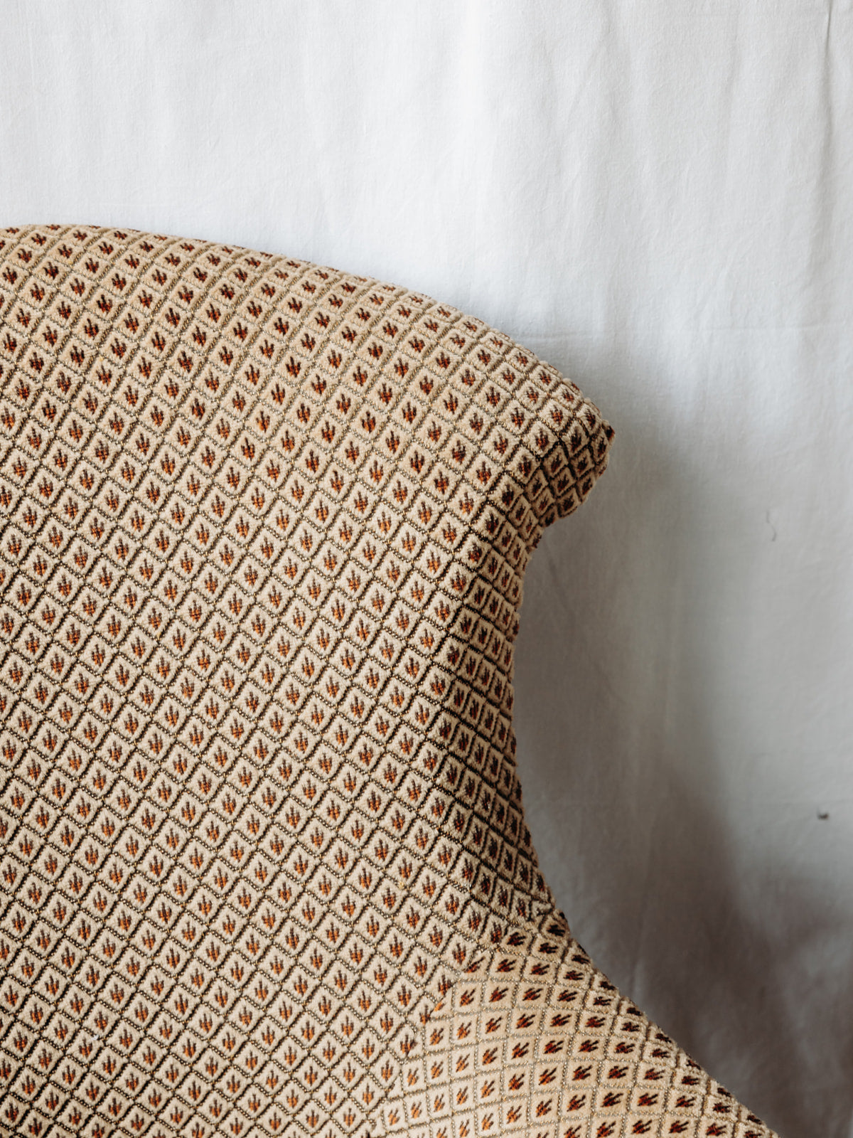 Discover our wool fabric armchair, enhanced by pretty patterns that bring a touch of elegance to your interior. Its black wood legs, adorned with mini casters, combine aesthetics and practicality. Also enjoy its armrests and soft shapes, which offer optimal comfort while highlighting its beautiful curves. This armchair is in very good condition, ready to become the centerpiece of your decor.