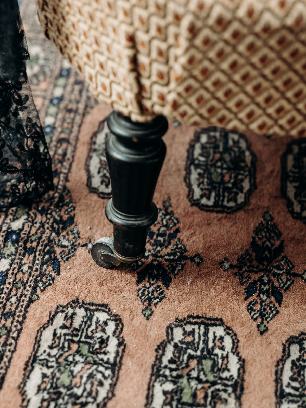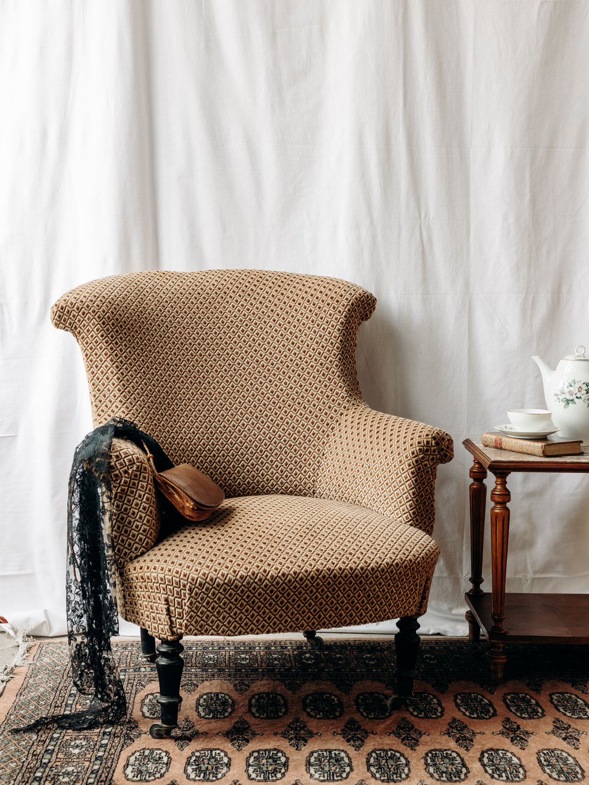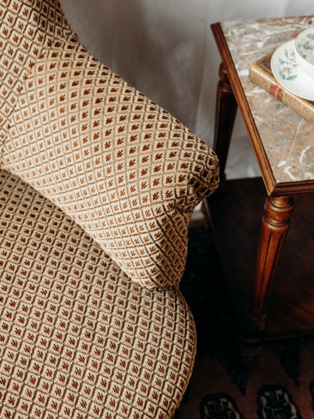 Discover our wool fabric armchair, enhanced by pretty patterns that bring a touch of elegance to your interior. Its black wood legs, adorned with mini casters, combine aesthetics and practicality. Also enjoy its armrests and soft shapes, which offer optimal comfort while highlighting its beautiful curves. This armchair is in very good condition, ready to become the centerpiece of your decor.