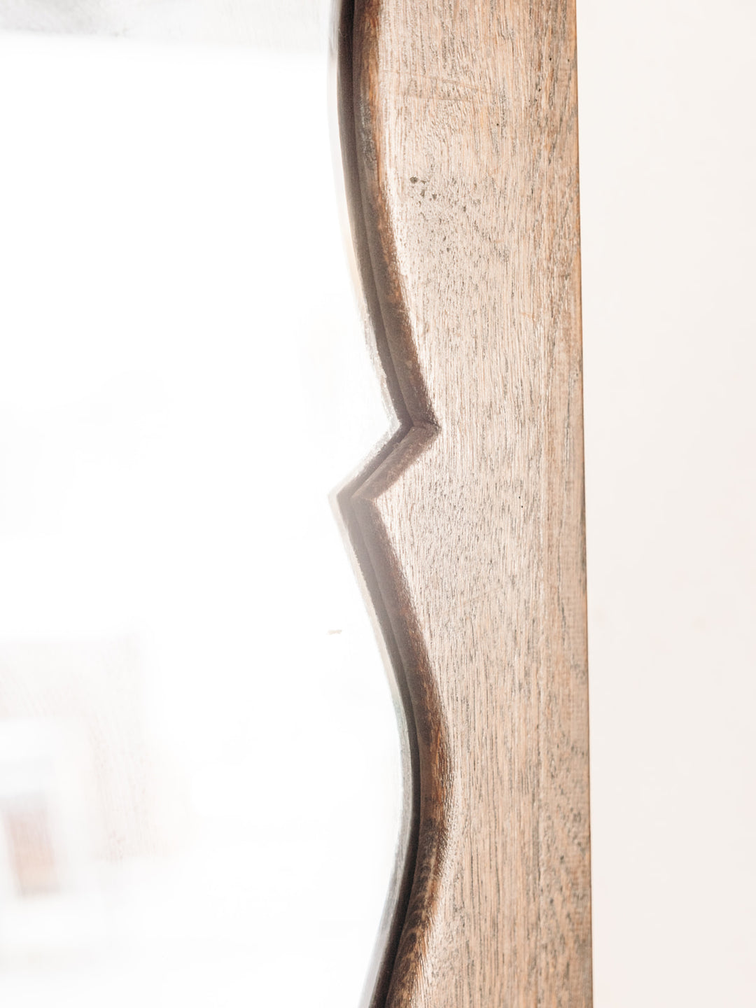 Bring a touch of authenticity to your home with this elegant wooden mirror, perfect for placing against a high wall. Its beautiful details, revealing the natural beauty of the wood, add character to your space. With some signs of age, this mirror tells a story and blends perfectly into any decor. Ideal for creating a warm and welcoming atmosphere in your home.