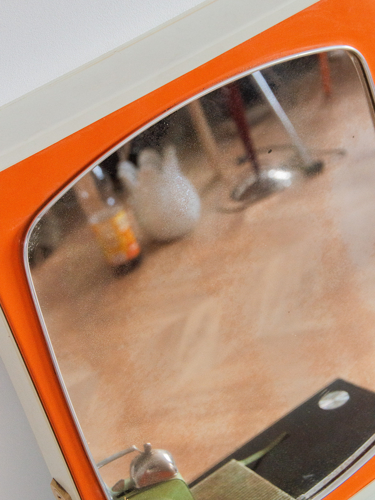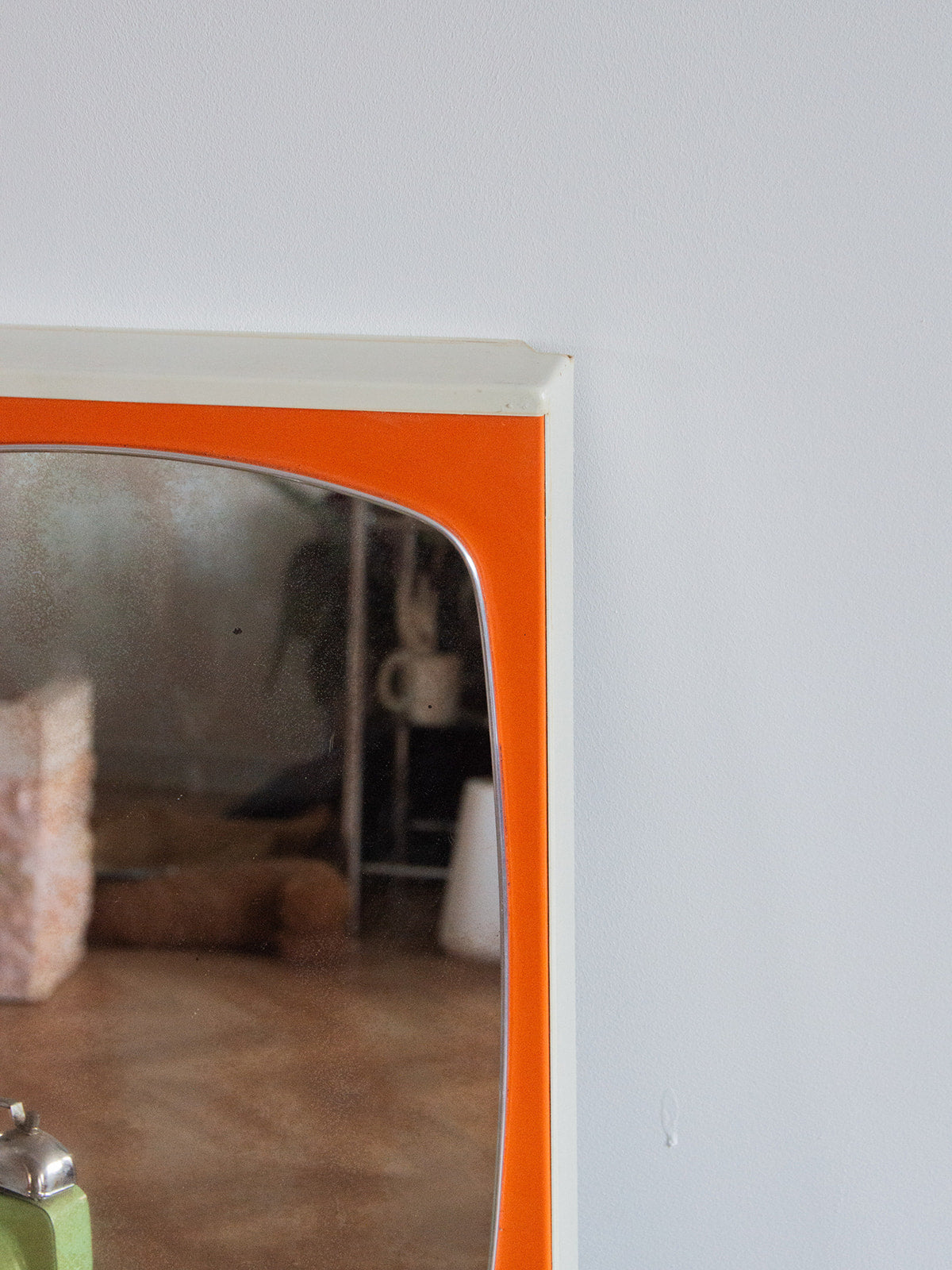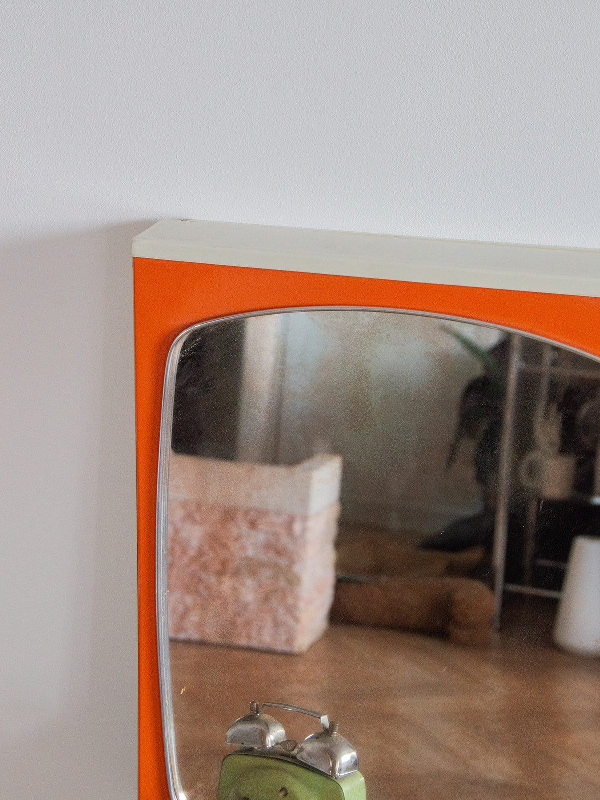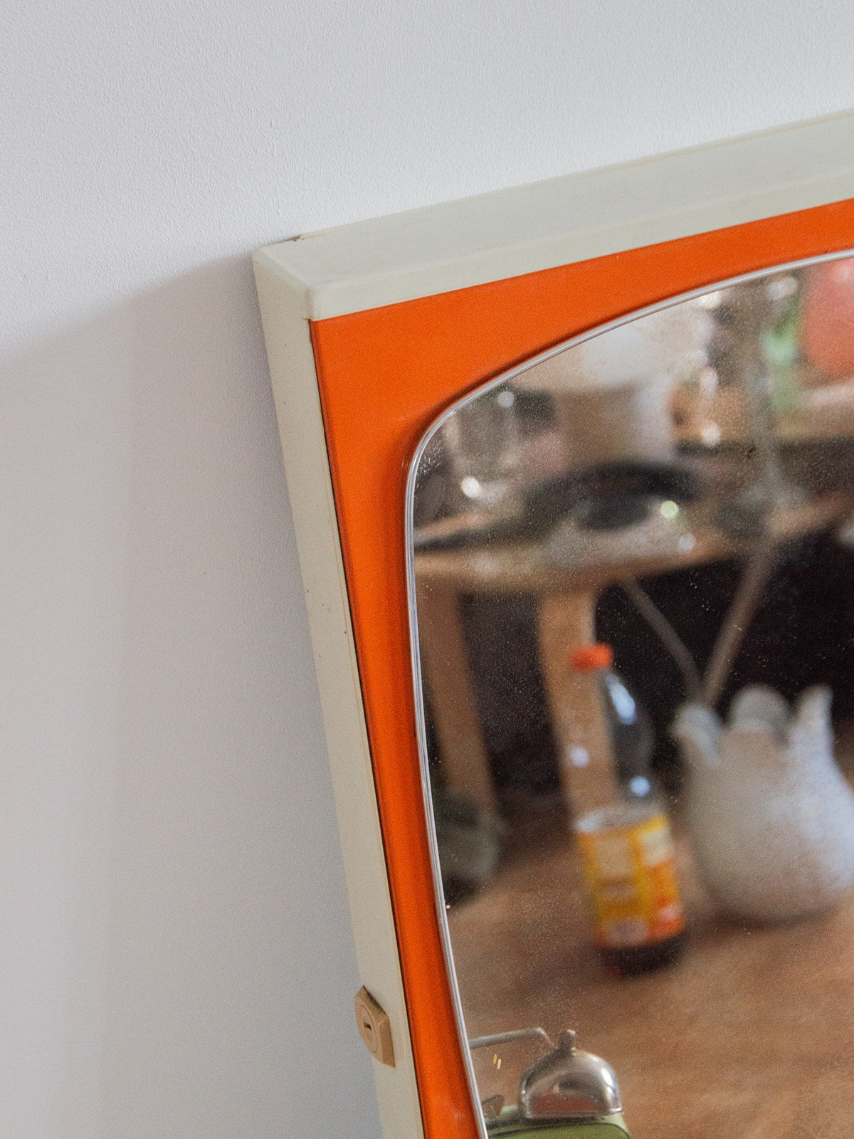 Add a touch of retro charm to your home with this small orange plastic mirror, formerly used as a medicine cabinet door. Its vibrant color and vintage design make it both practical and aesthetically pleasing. Ideal for small spaces, it can be mounted on the wall and stylishly reflects light, adding a touch of originality to your decor. A must-have for lovers of unique furniture.