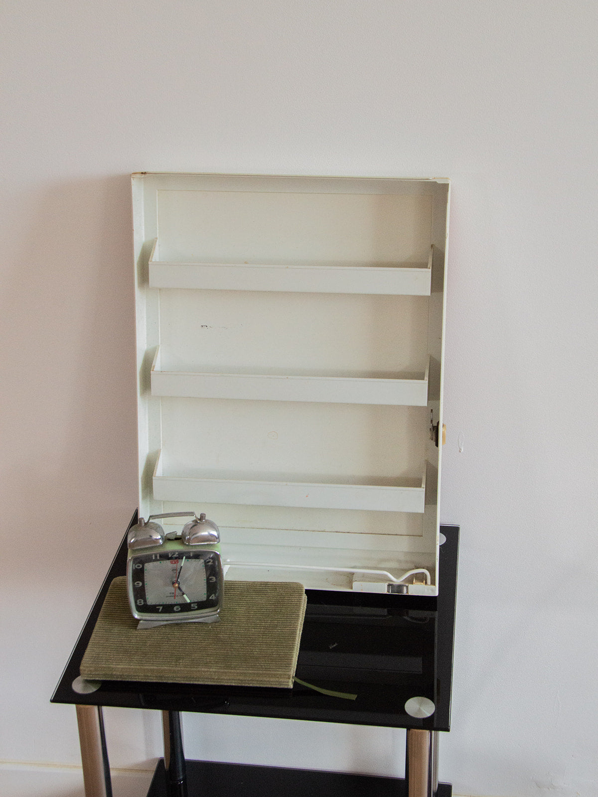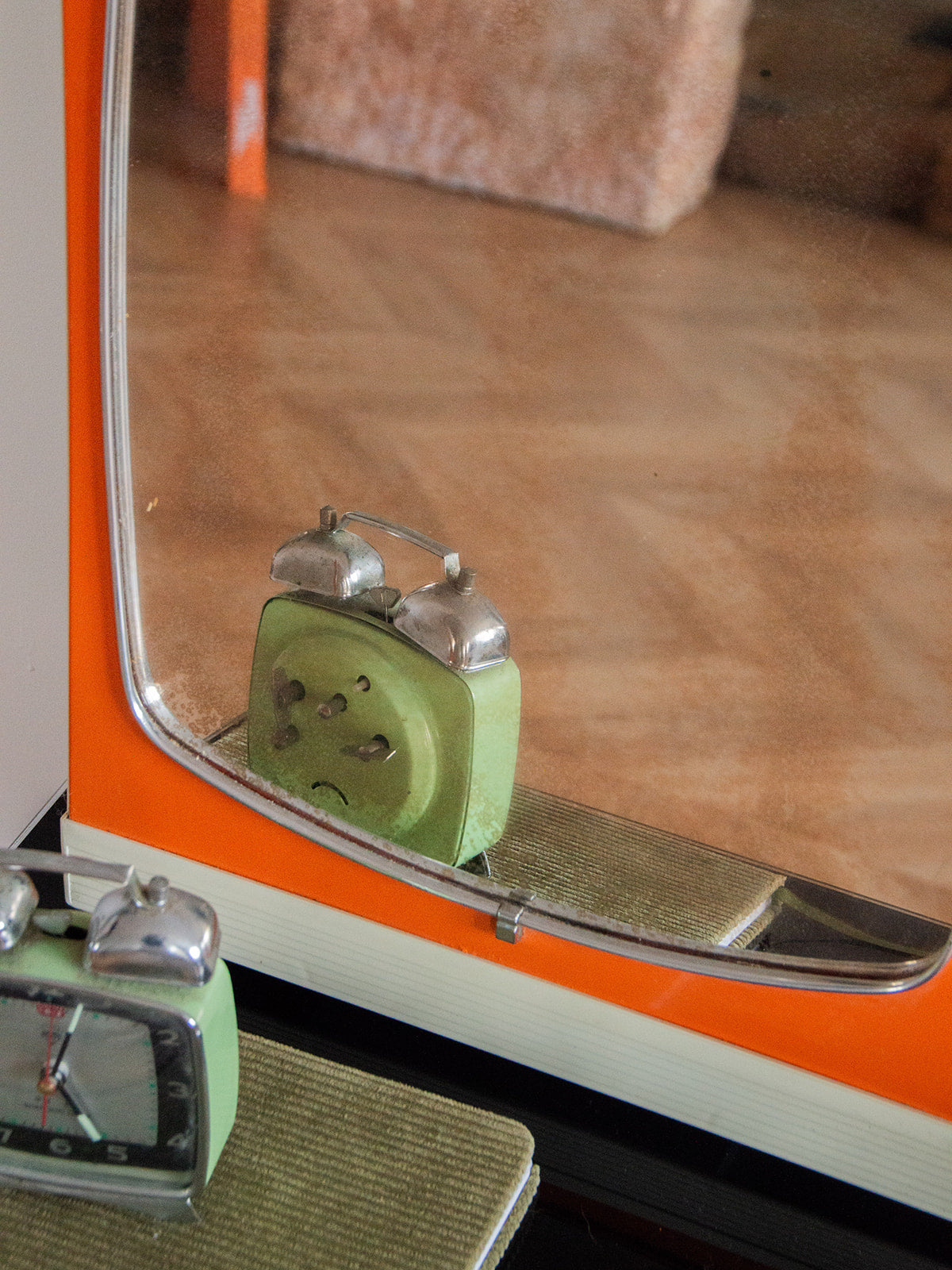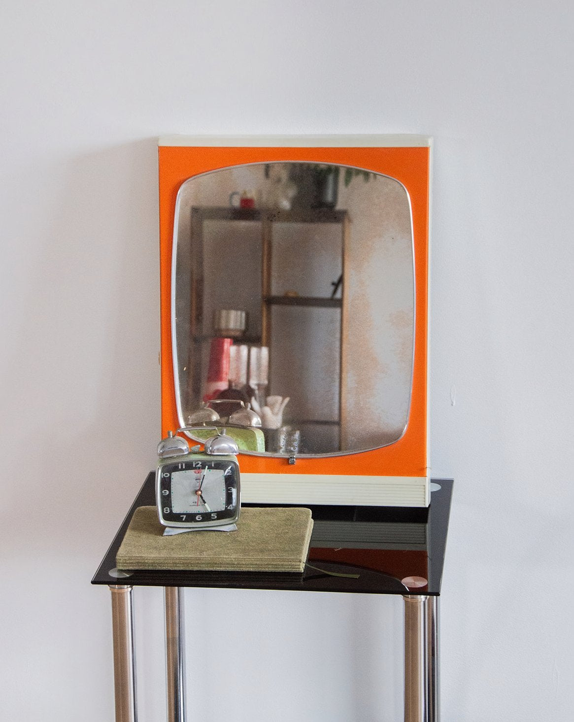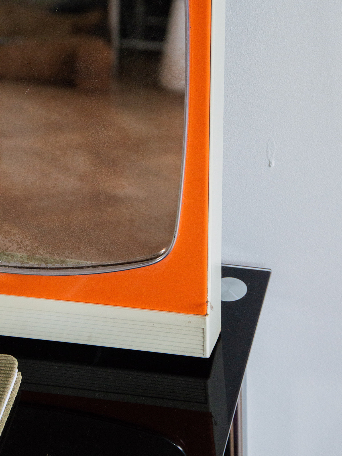 Add a touch of retro charm to your home with this small orange plastic mirror, formerly used as a medicine cabinet door. Its vibrant color and vintage design make it both practical and aesthetically pleasing. Ideal for small spaces, it can be mounted on the wall and stylishly reflects light, adding a touch of originality to your decor. A must-have for lovers of unique furniture.